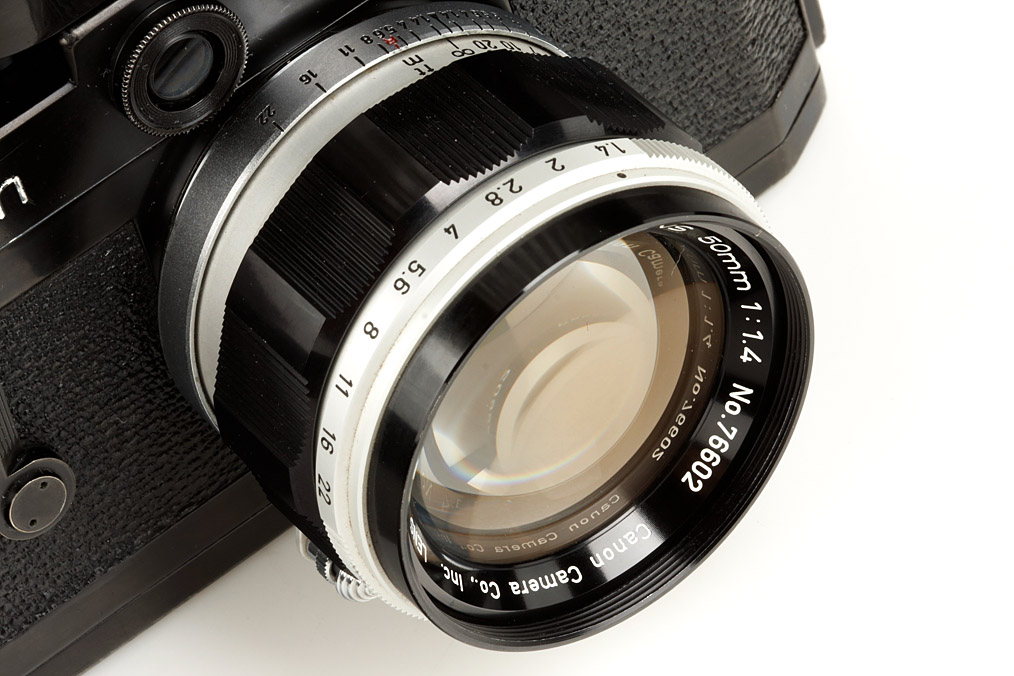 original and rare black painted Canon P in good working condition, Canon Lens 1.4/50mm no.76602, filter, cap, with black painted Canon meter (working, cond. B+)