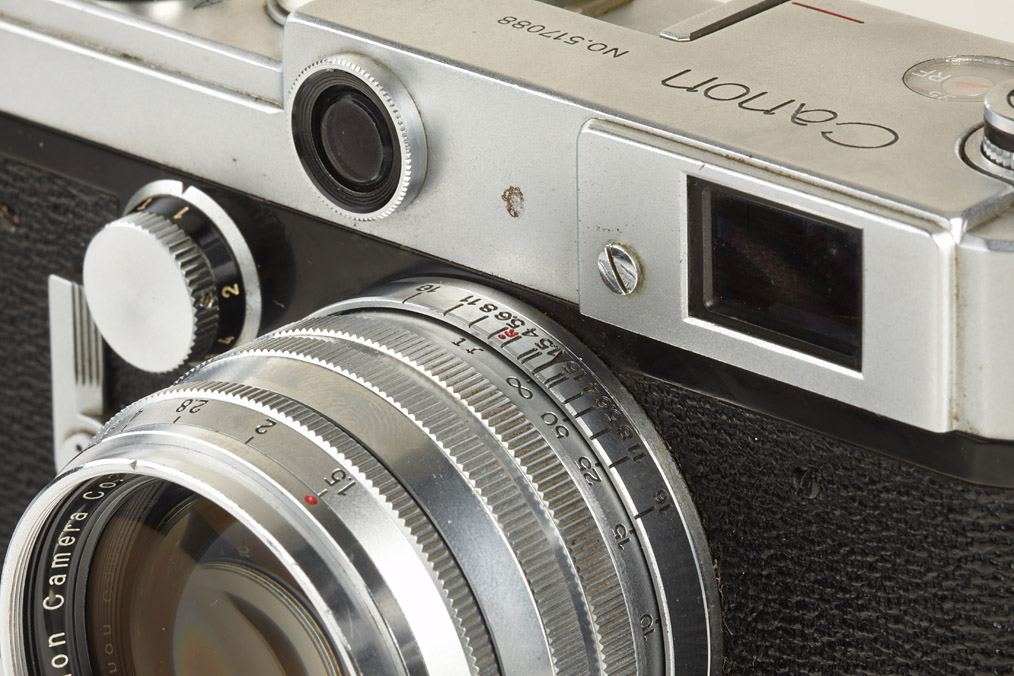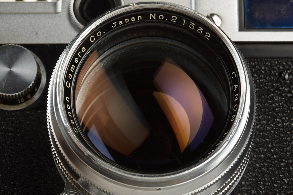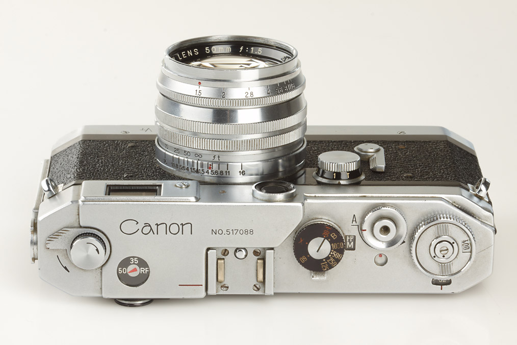 very first Canon with built-in rapid winder, in good working order with Canon Lens 1.5/50mm no.21332, cap, brown everready case