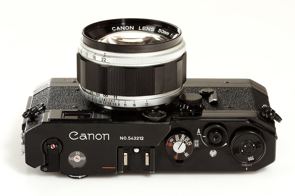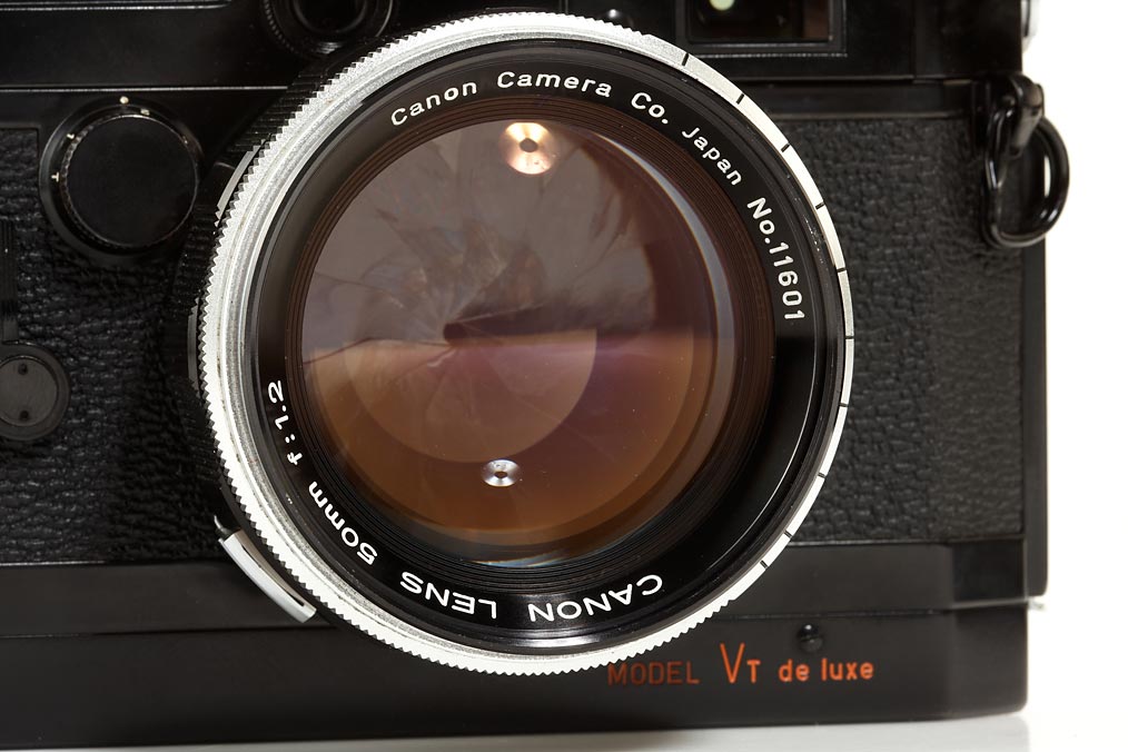 rare, fully original black painted body with trigger wind in good working order, with fast Canon Lens 1.2/50mm no.11601 (filter, rare hood), matching black everready case