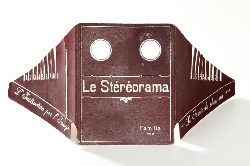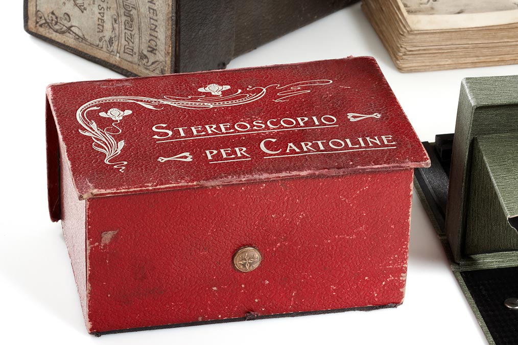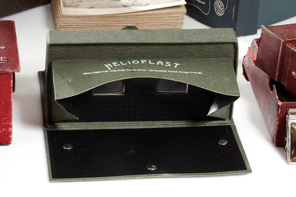 handpicked selection of six rare souvenir-type stereoscopes, all in fairly good condition, due their age some wear at edges and hinges, (1) the sought-after German folding stereoscope 'Helioplast' in near mint condition, made of linen covered cardboard, (2) French box-shaped miniature viewer 'Stéréoscope' covered with embossed red faux leather, comes together with a set of metal framed slides, (3) beautiful Italian 'Stereoscopio per Cartoline' covered with embossed red faux leather, (4) French 'Aristoscope', together with a set of original cards, (5) Czech box-shaped viewer labelled 'Steroskopickych obrazu' with a very nice makers label on the cover showing mother and child looking through a stereoscope, with a set of original cards, (6) unusual basic folding stereo viewer labelled 'Le Stéreórama' with nine slots on each side to focus the stereo cards. (6)