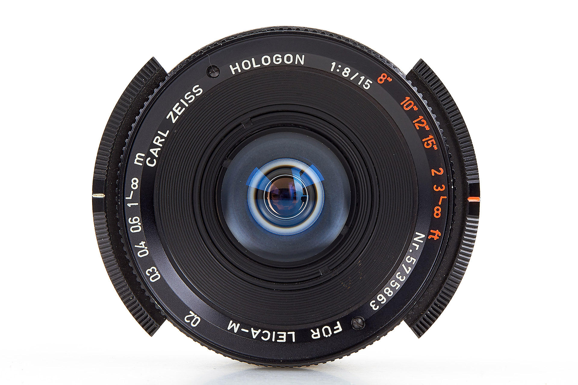 near mint Carl Zeiss 15mm Hologon f/8 lens for Leica M, with clean optics (only minimal coating flaws on the rear element), with special finder and original center filter (cond. B+) Oskar Barnack himself moved from Carl Zeiss to Leitz Wetzlar in 1911, where he began the Leica Story. 20 years later, Zeiss announced their own 35 mm camera and became a direct competitor in the photo market with the introduction of the CONTAX in 1932. Nevertheless, the relation of both companies was always respectful. As a particular example for that, the few cases of a direct cooperation can be considered. Zeiss first announced the 15mm Hologon f/8 as a lens fixed to the body of a modified Contarex camera. From 1972 Zeiss also manufactured it for Leitz in Leica M mount. In the Leitz catalogue it was offered as “Carl Zeiss Hologon for Leica M” until 1975. The Hologon is a lens with 110° angle of coverage, and almost without distortion, it did show slight vignetation, compensated with a special center filter. A large bright line finder with waist-level controls was part of the Hologon outfit as well. The lens was produced in very small numbers only; it is a rarity to find a complete set in good condition today.