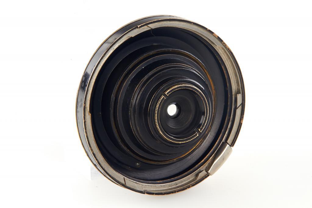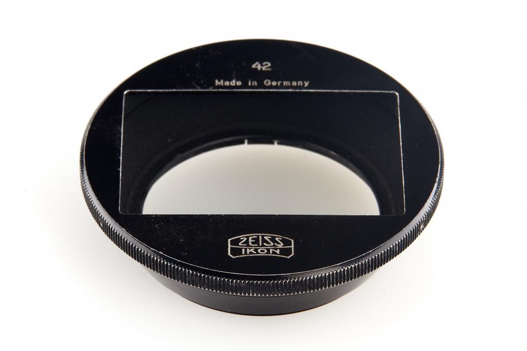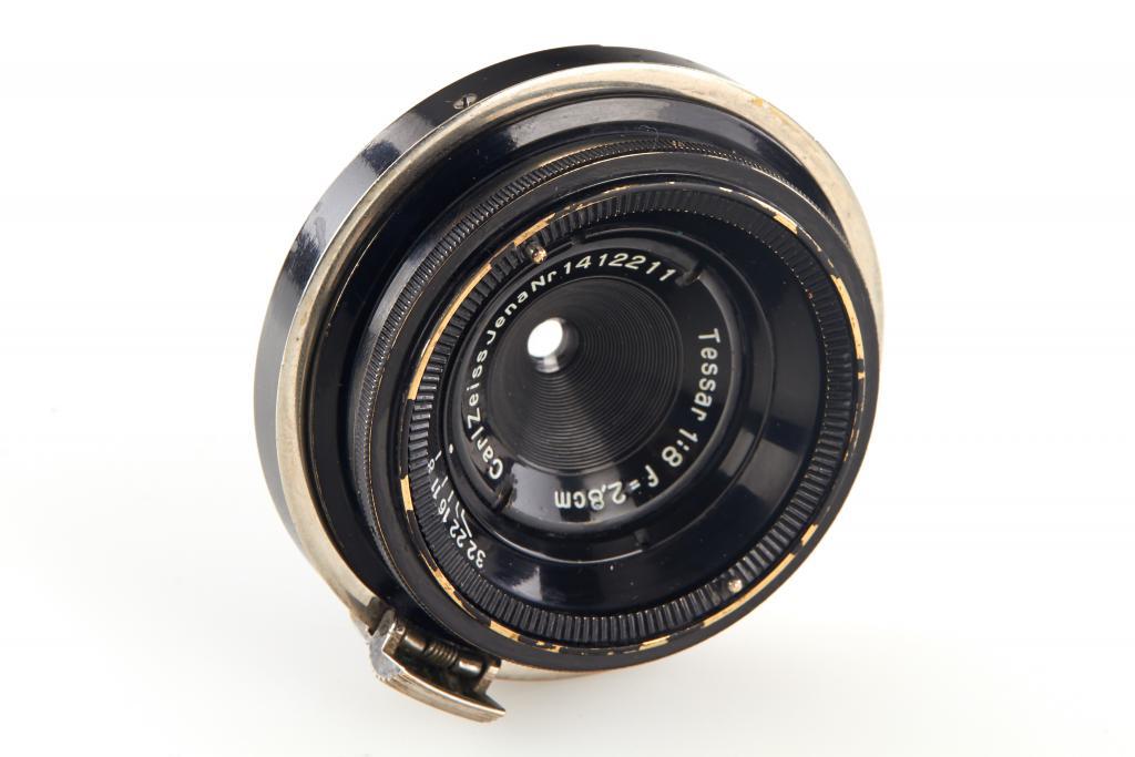 for Contax, very rare and extremely early (the 11th lens produced from the first batch of 50 lenses) nickel plated Tessar 2,8cm with the almost unknown black hood 1283/10 with square aperture (with original maker's box)