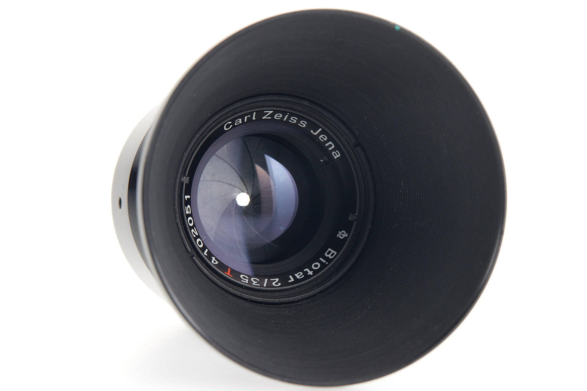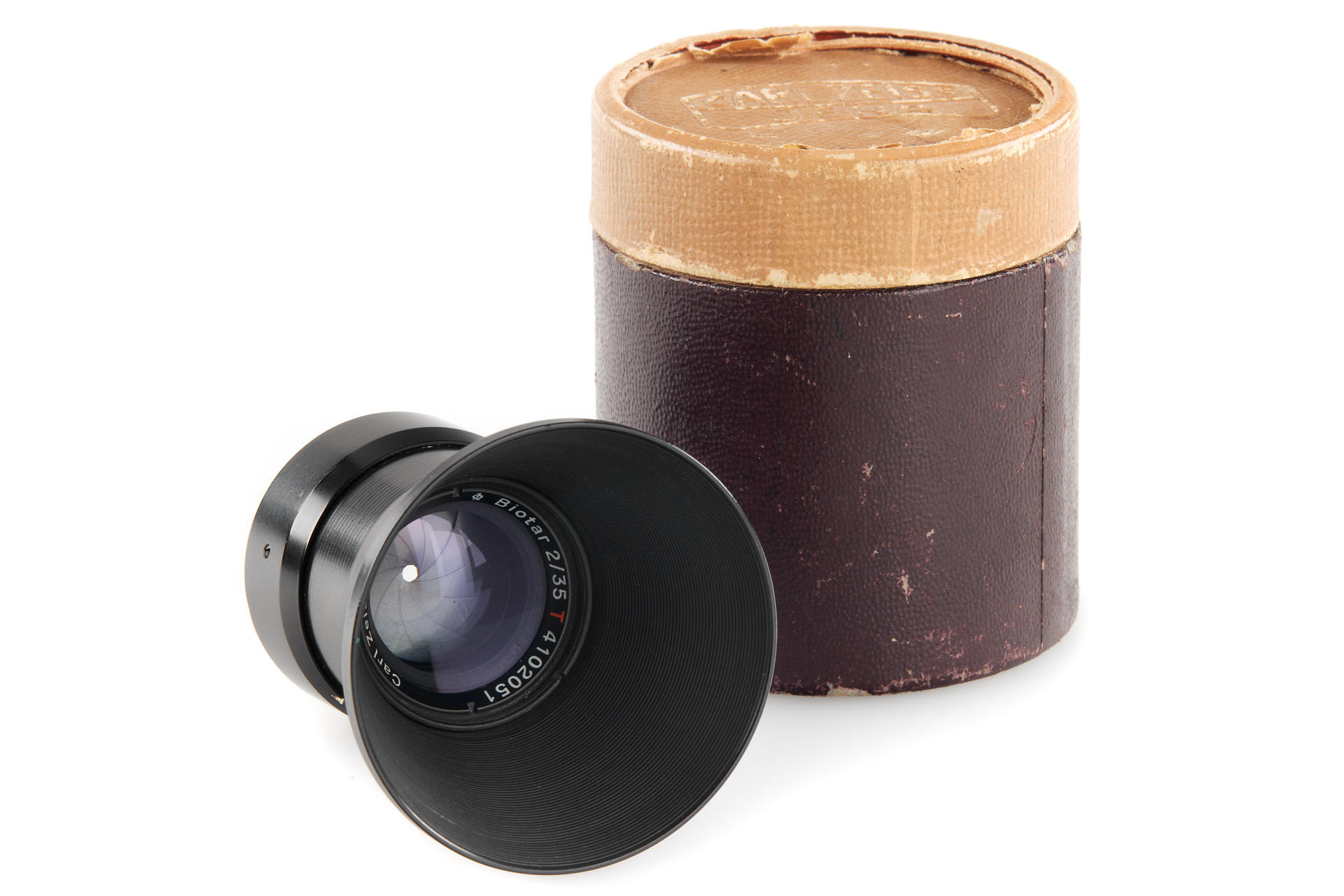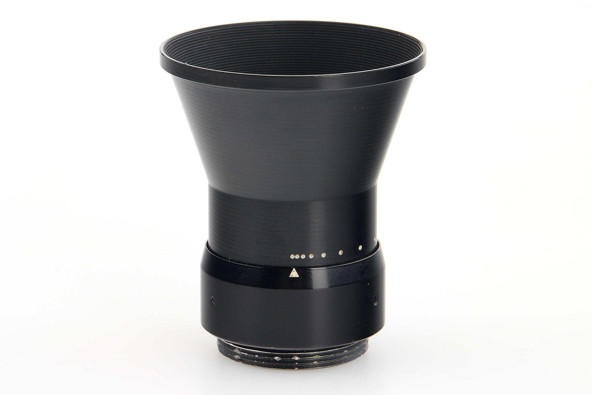 A very unusual T-coated Biotar in non-focusing M28 mount ('Kino-Einbaufassung' mount according to the Zeiss delivery records), aperture ring integrated with a large hood, good optics with only minimal cleaning marks, with maker's box