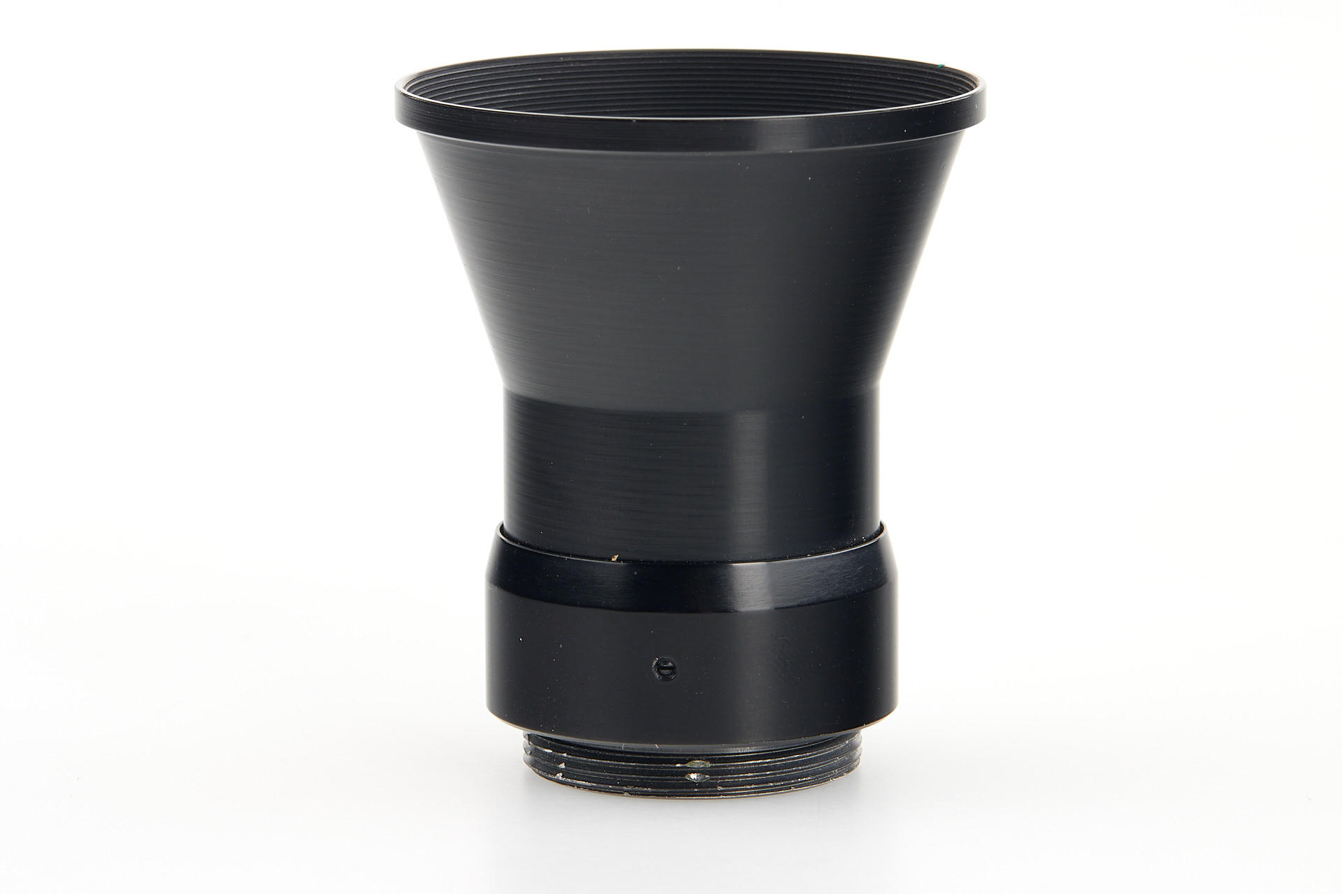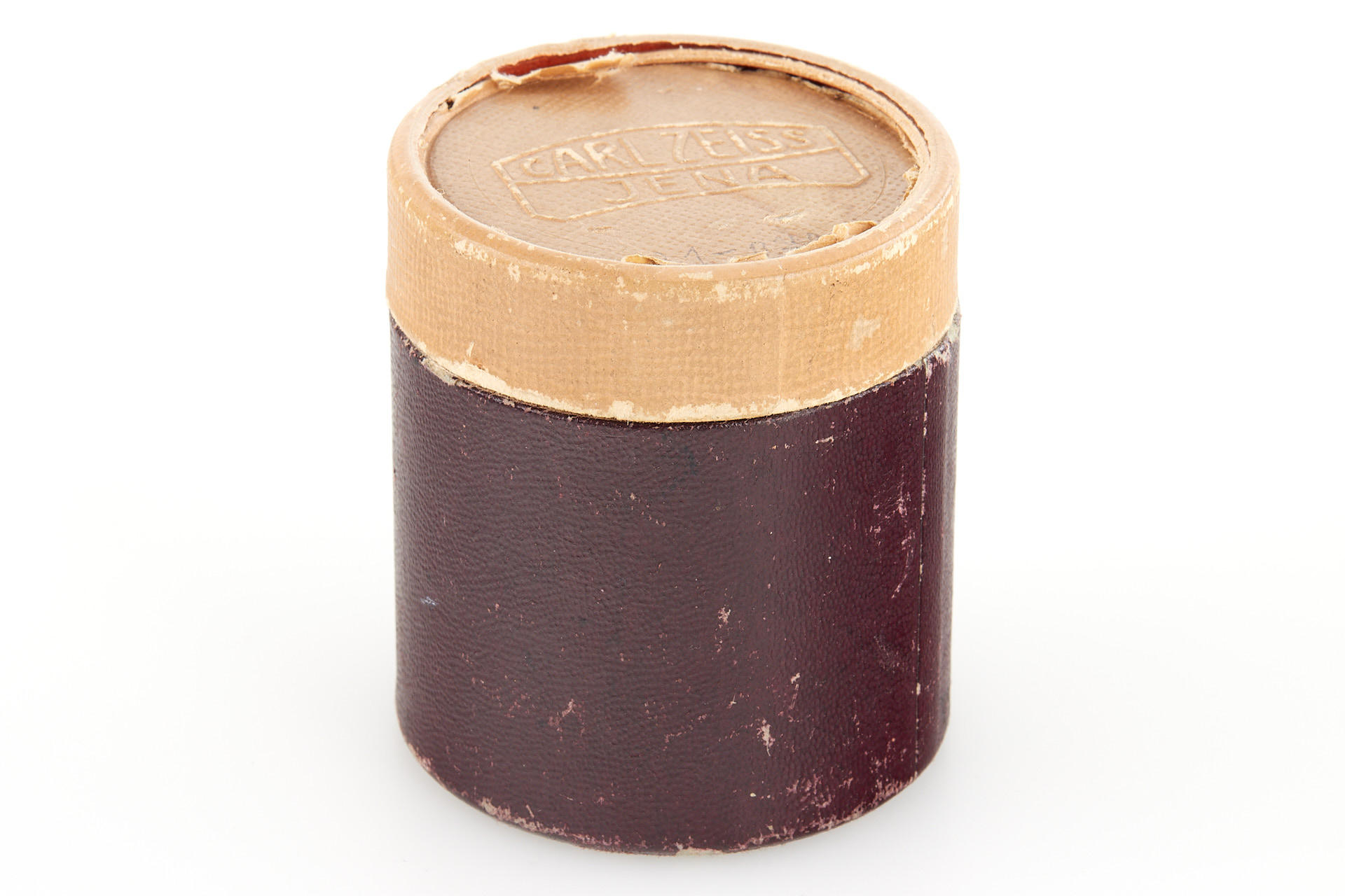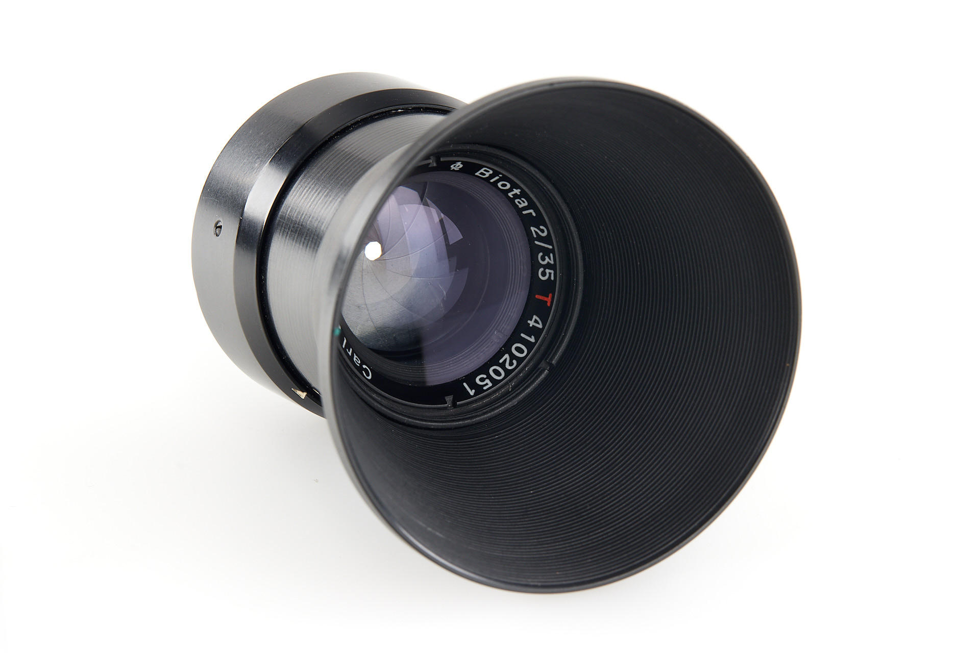 A very unusual T-coated Biotar in non-focusing M28 mount ('Kino-Einbaufassung' mount according to the Zeiss delivery records), aperture ring integrated with a large hood, good optics with only minimal cleaning marks, with maker's box