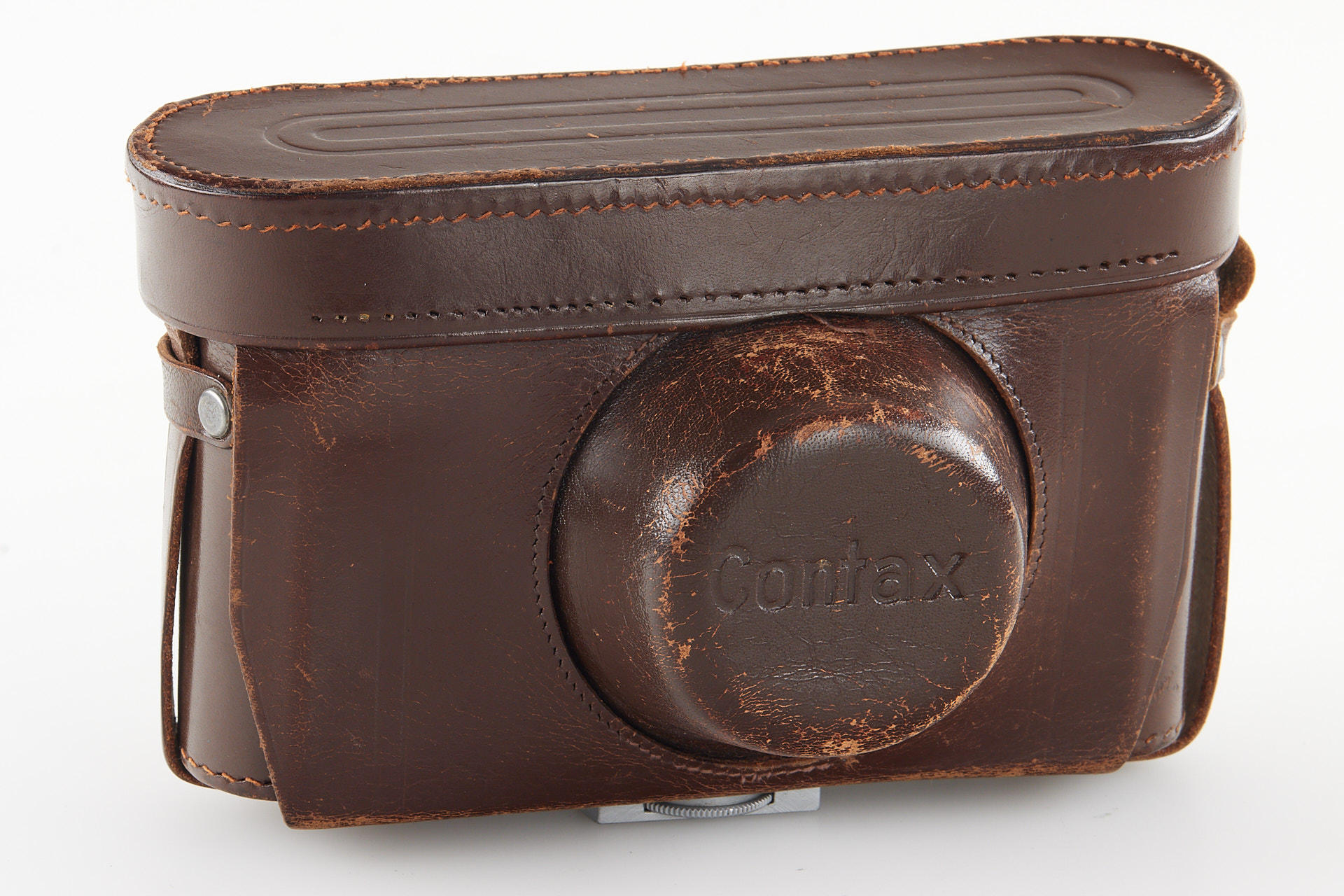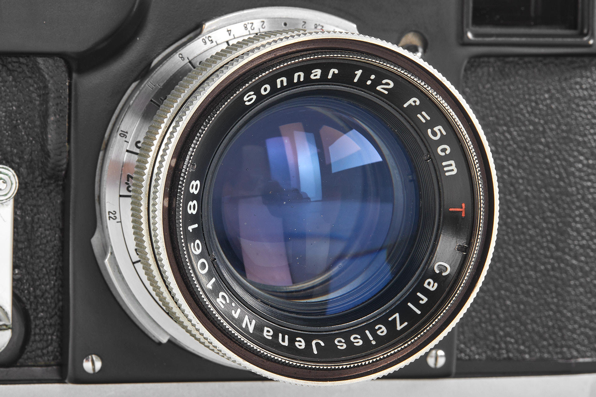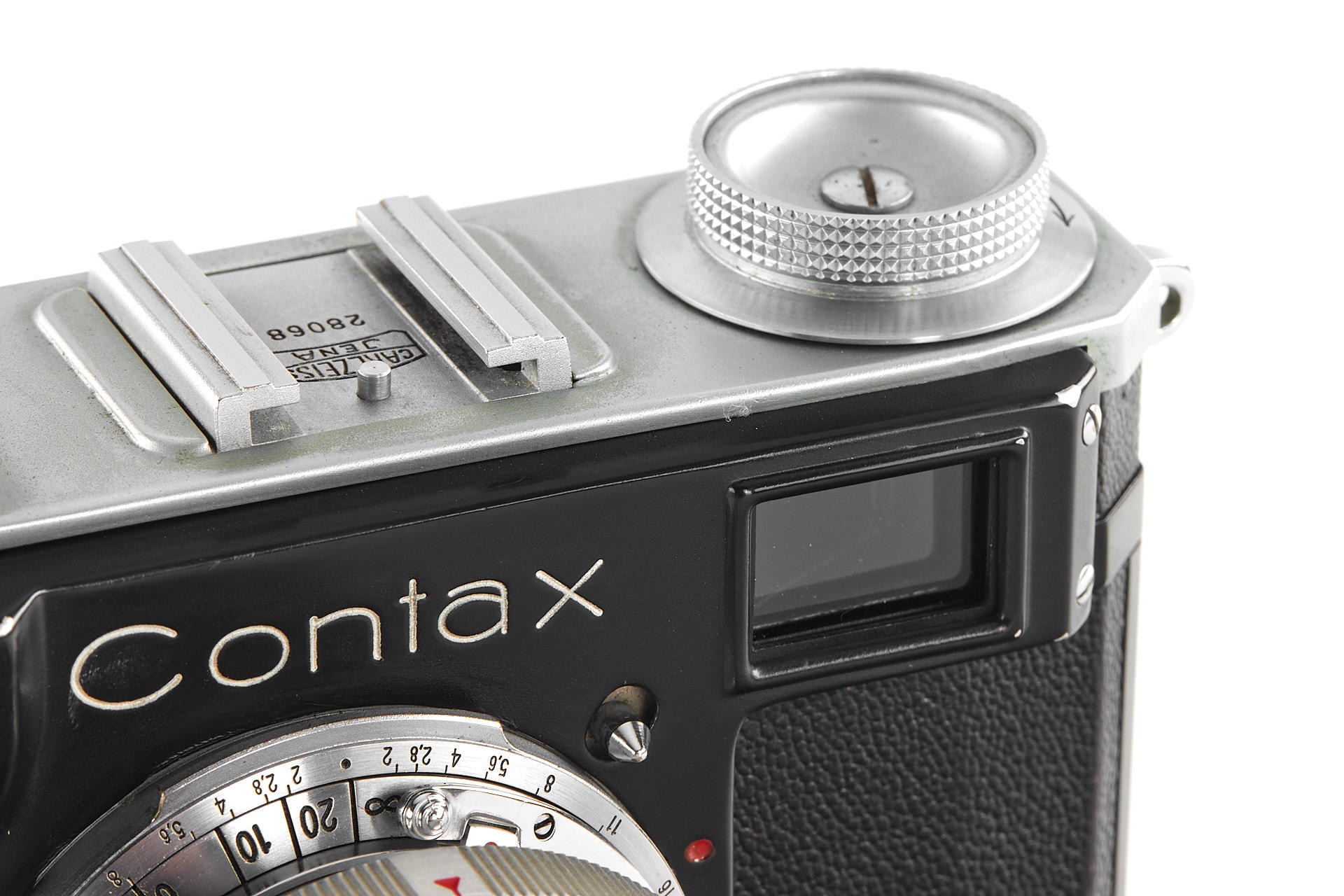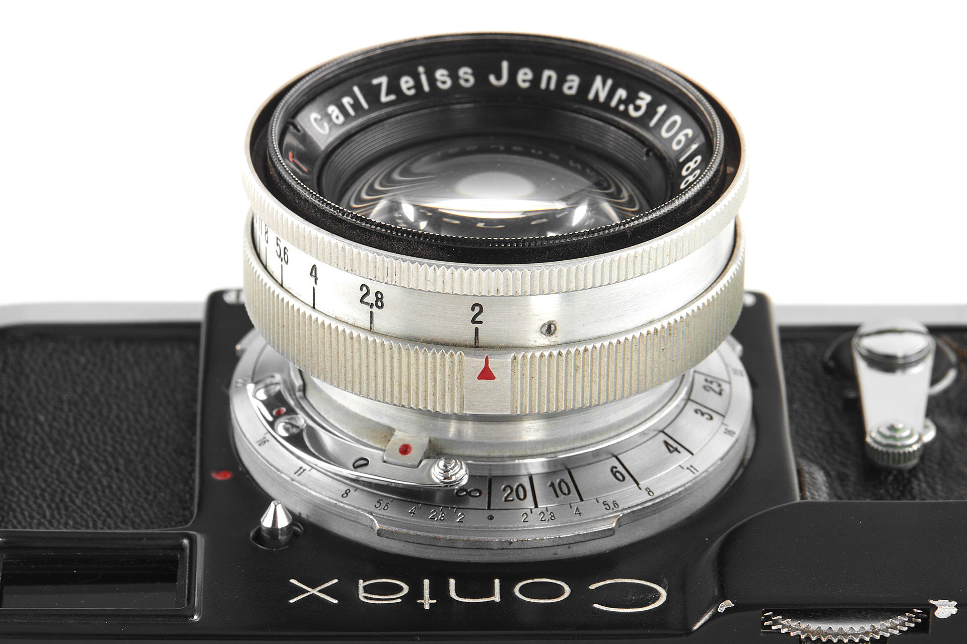 An extremely rare variant of the Jena Contax II, with the front plate finished in black paint; the camera is in good, unrestored condition, comes with a matching Carl Zeiss Jena Sonnar 2/5cm no.3106188 and leather case, most probably only 4 to 6 examples of this rare Contax variation have been made, in the 36th auction we have included the camera no.28079 finished in the same style