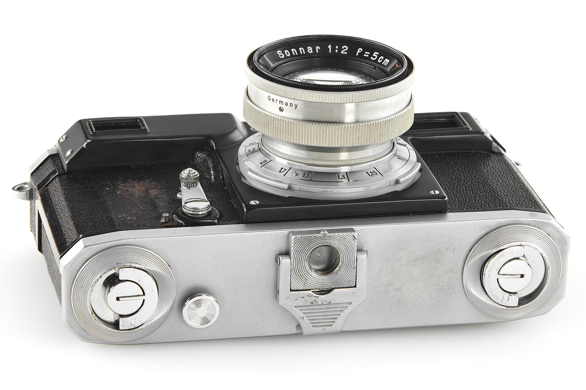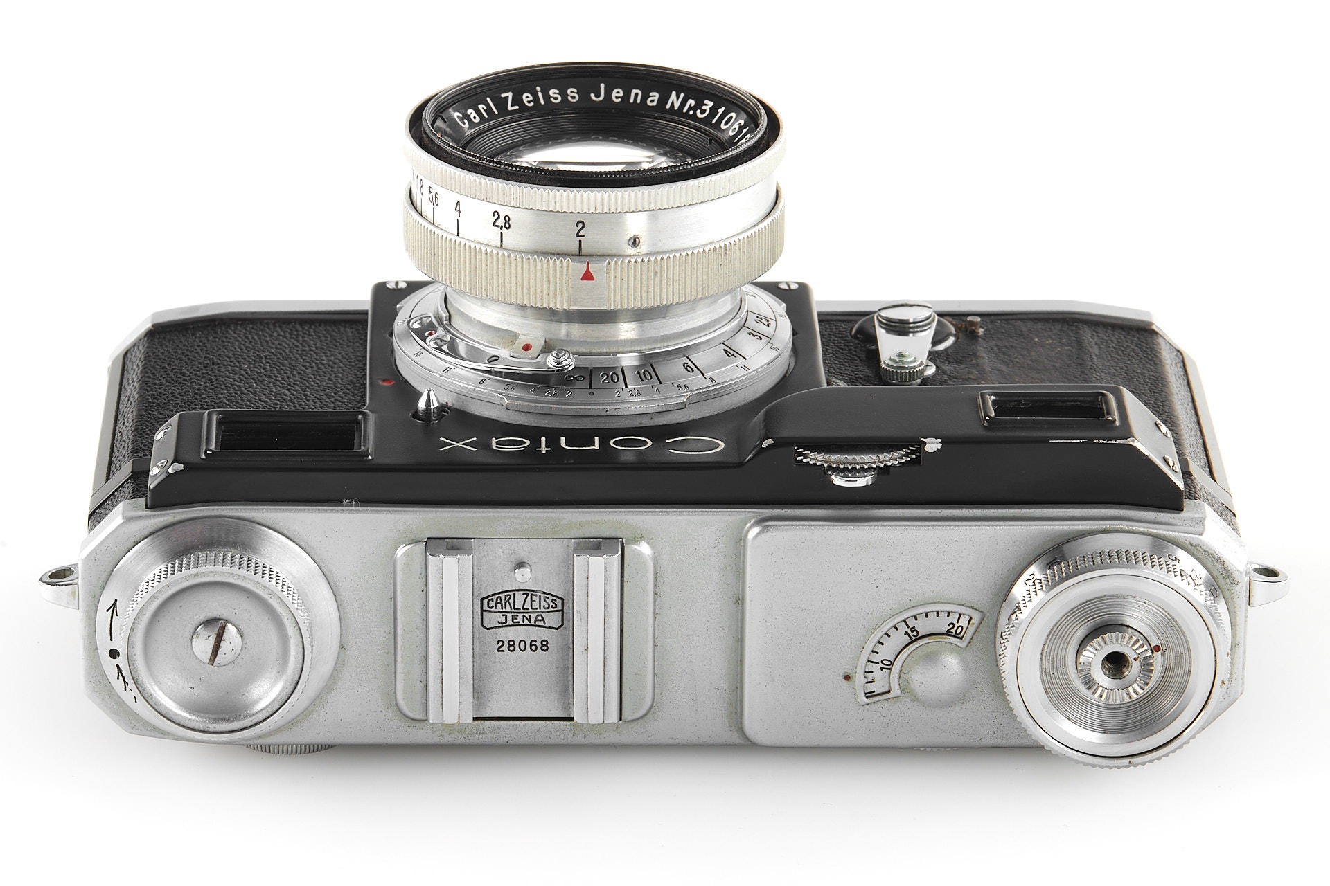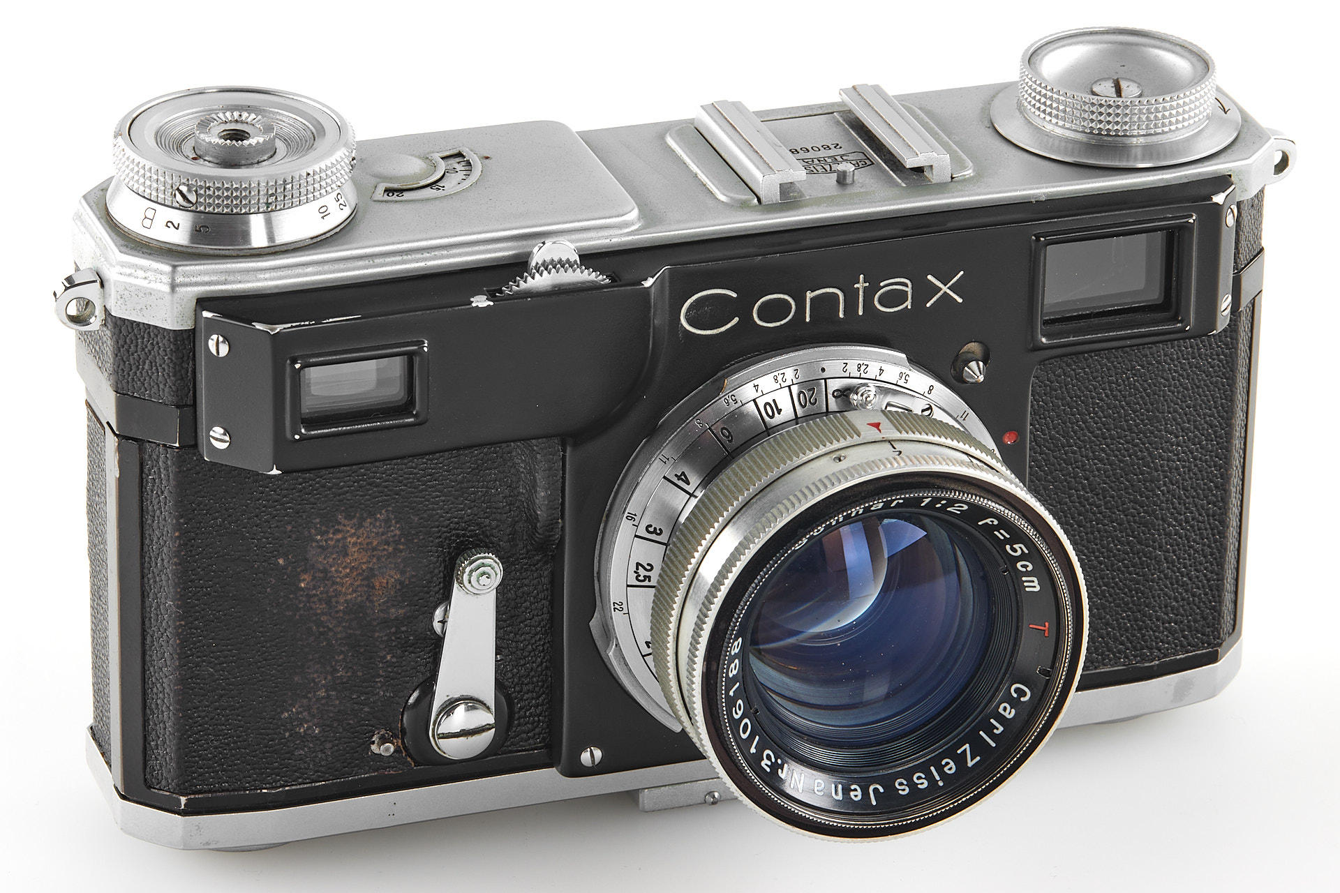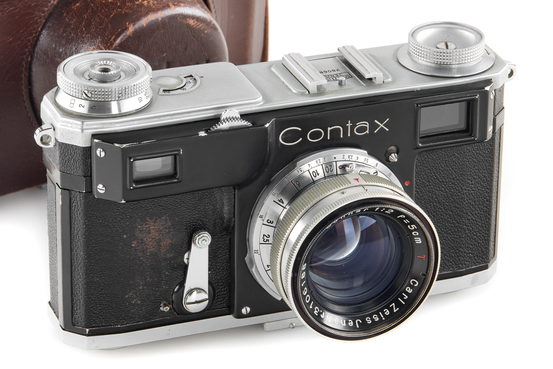 An extremely rare variant of the Jena Contax II, with the front plate finished in black paint; the camera is in good, unrestored condition, comes with a matching Carl Zeiss Jena Sonnar 2/5cm no.3106188 and leather case, most probably only 4 to 6 examples of this rare Contax variation have been made, in the 36th auction we have included the camera no.28079 finished in the same style