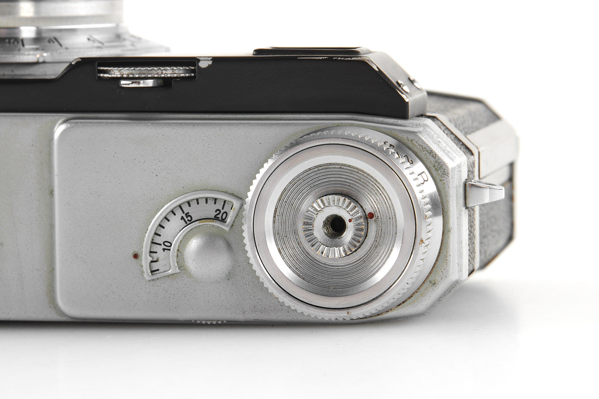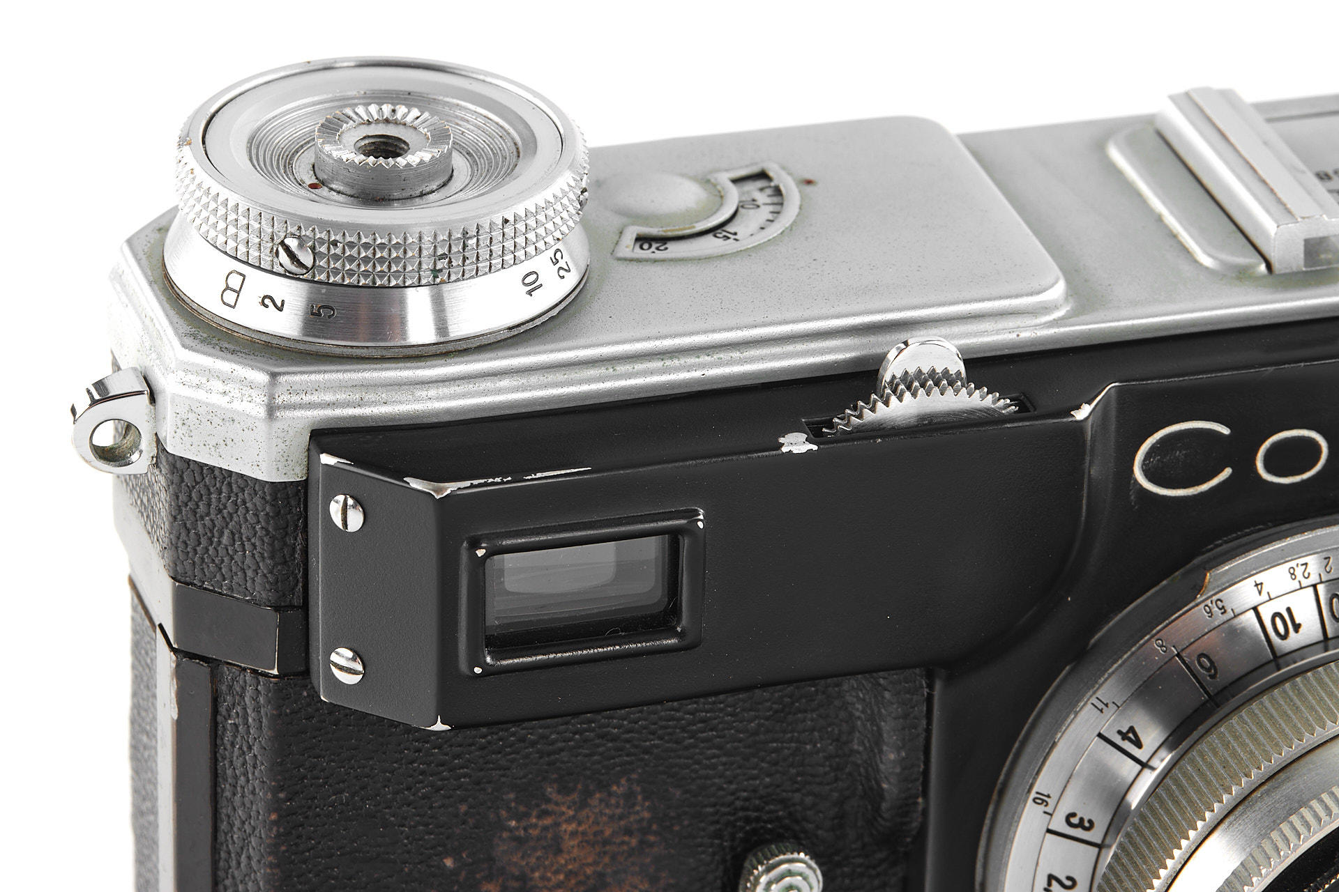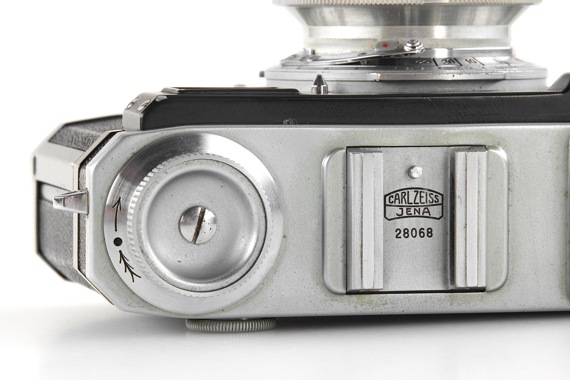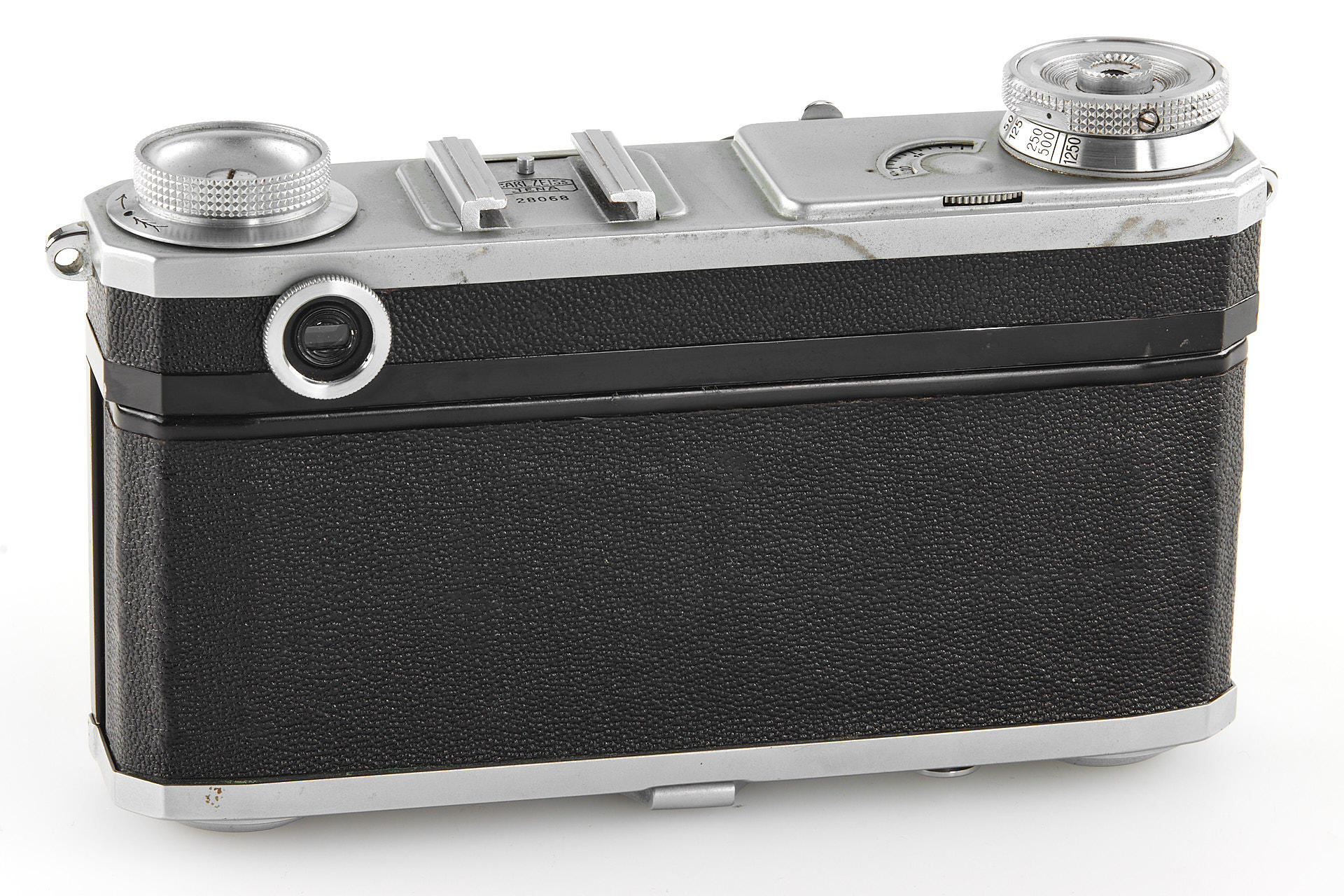 An extremely rare variant of the Jena Contax II, with the front plate finished in black paint; the camera is in good, unrestored condition, comes with a matching Carl Zeiss Jena Sonnar 2/5cm no.3106188 and leather case, most probably only 4 to 6 examples of this rare Contax variation have been made, in the 36th auction we have included the camera no.28079 finished in the same style