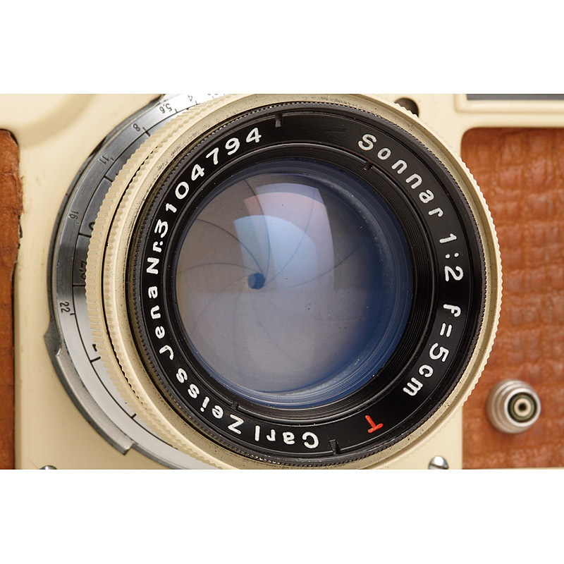 one of very few original Contax Jena with painted ivory finish, matching Sonnar 2/5cm no.3104794 (cap), original brown leather covering, camera and lens in beautiful original and working condition, we fully guarantee the authenticity of this extremely rare item