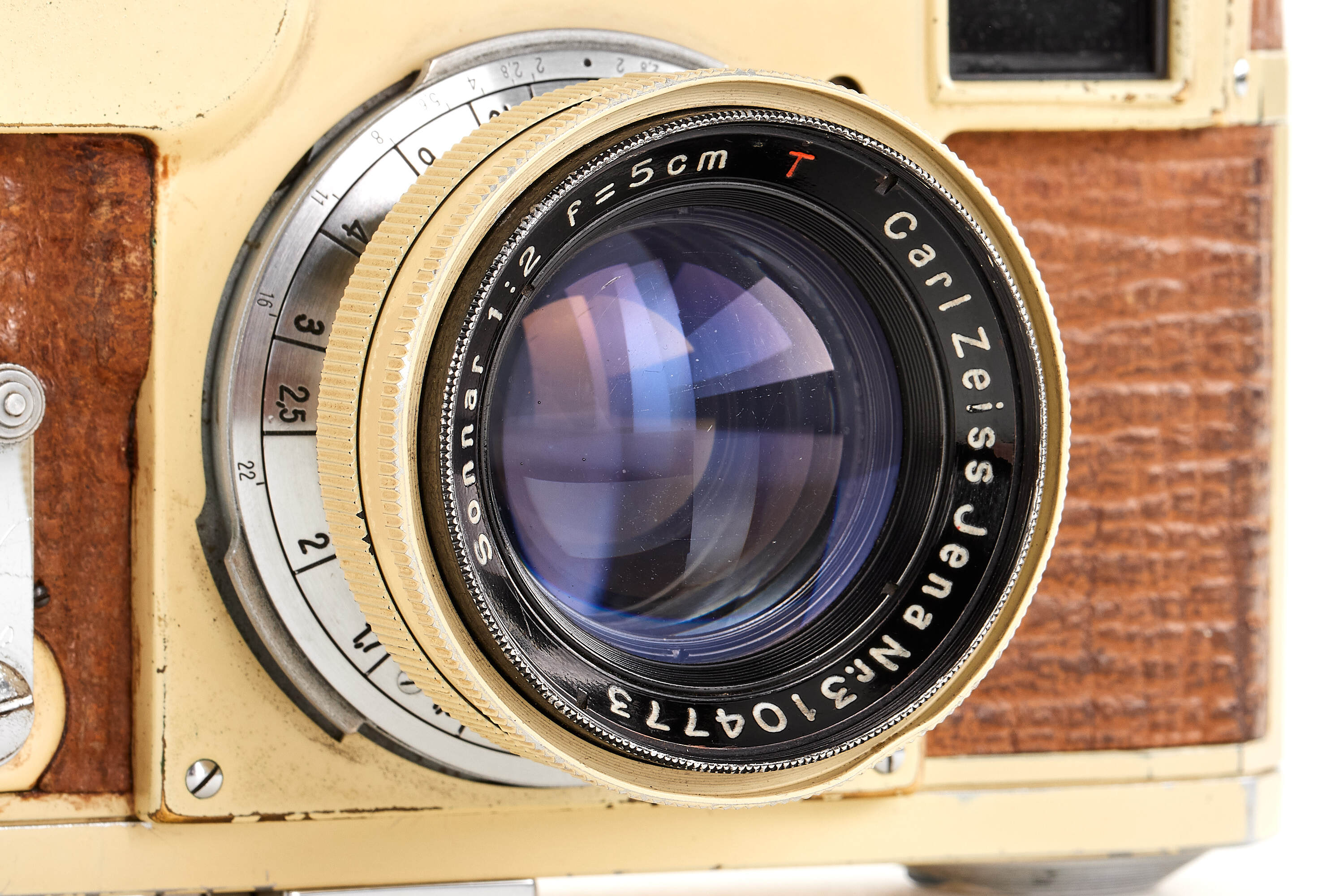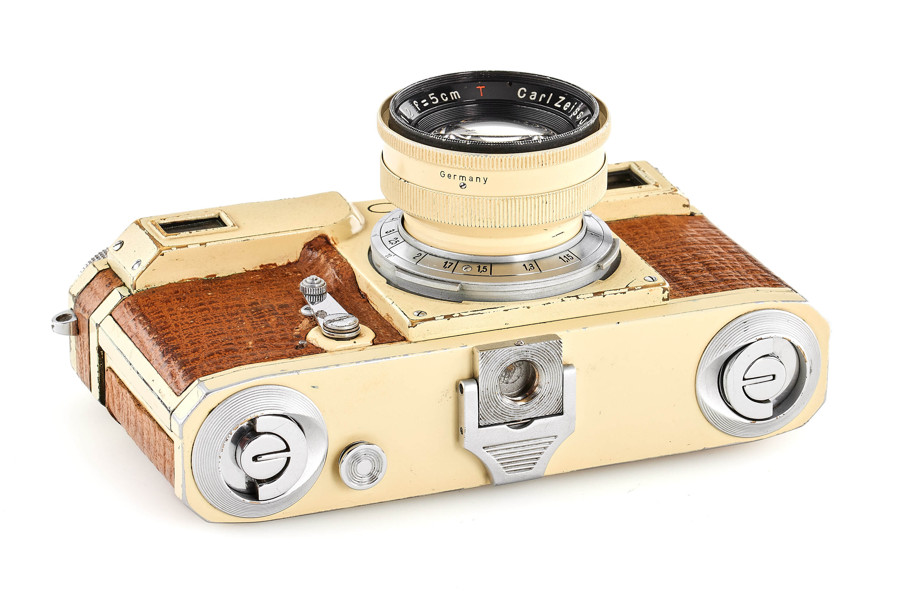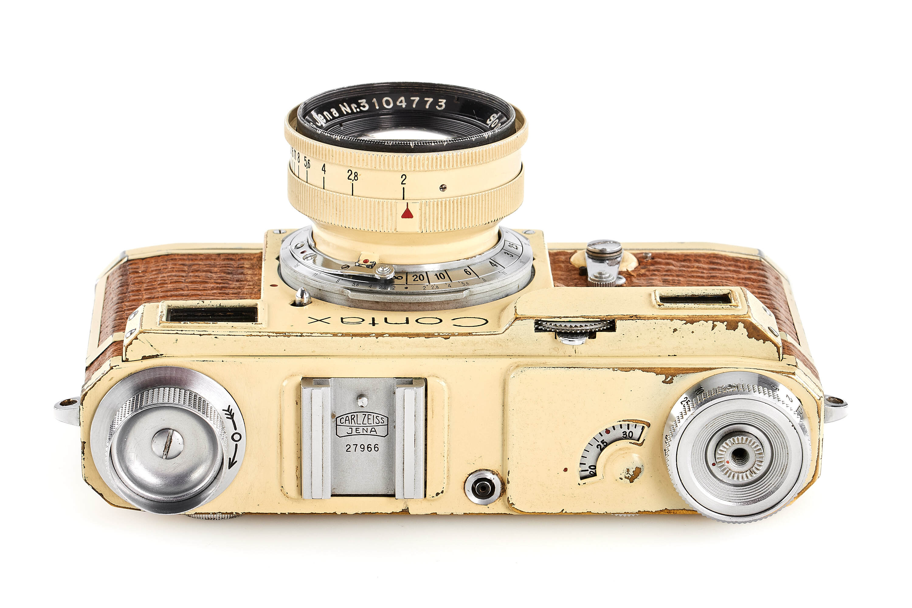 One of very few original prototypes Contax cameras made in Jena, with ivory laquer, from the usual serial number range 279XX, with matching ivory finish Sonnar 2/5cm no.3104773, original light brown leather covering, camera and lens in good condition, a similar camera can be seen in Hans-Jürgen Kuc 'On the Trail of the Contax' vol. II p.130 with Sonnar 2/5cm no.3104774 (!), note the flash sync contact and the interesting high profile film rewind knob, with matching leather case (top cover missing). It is for sure one of the most attractive Contax cameras!