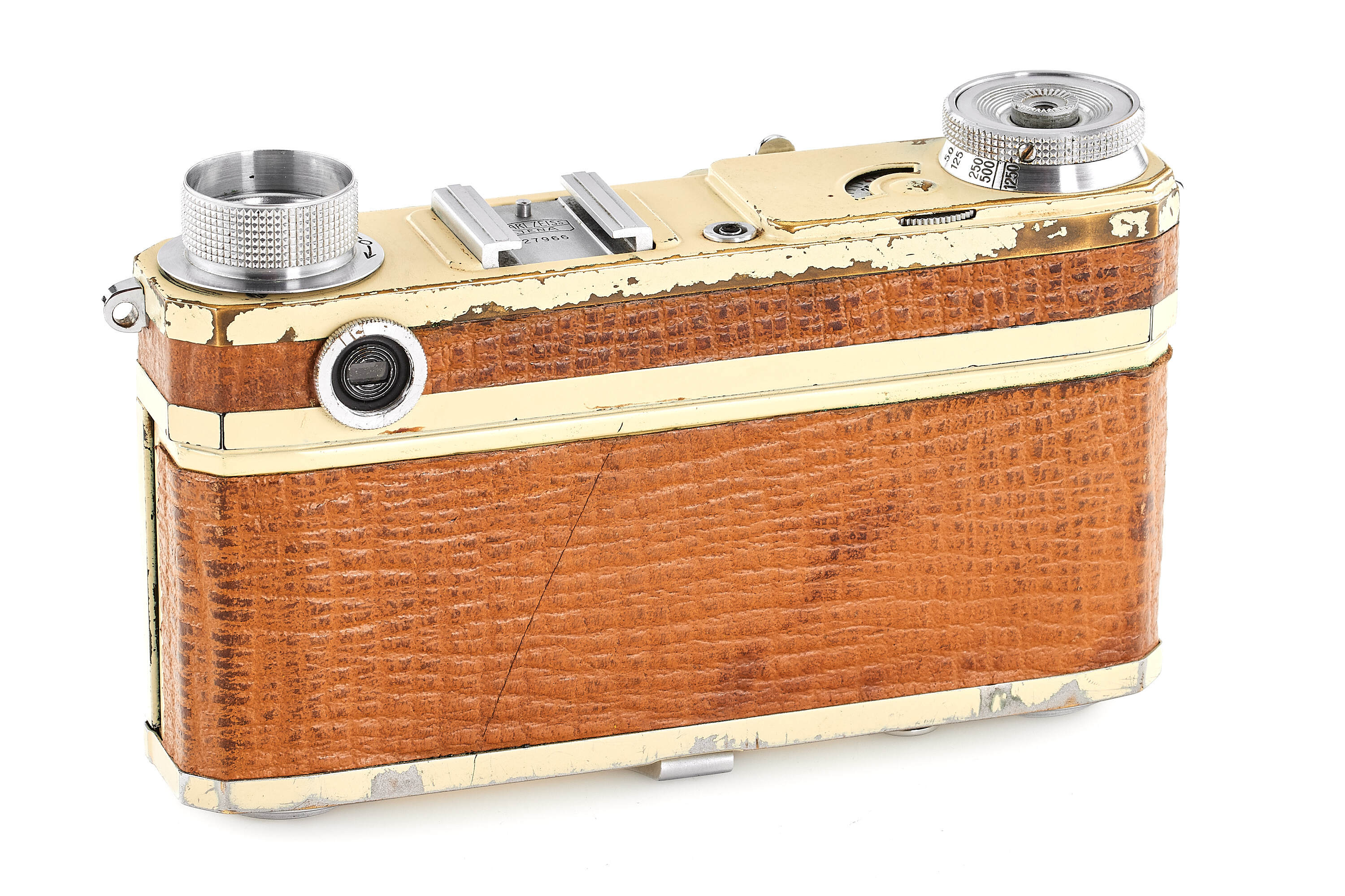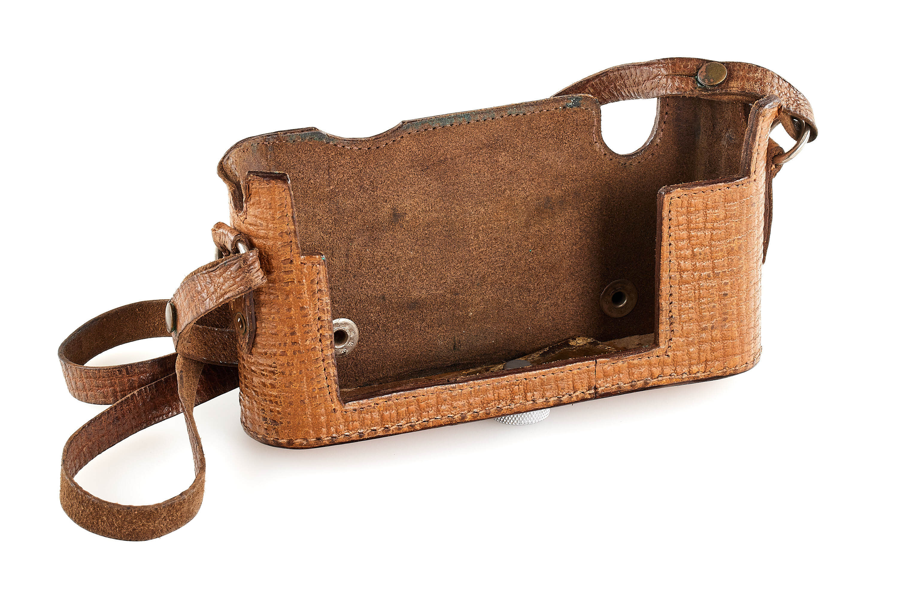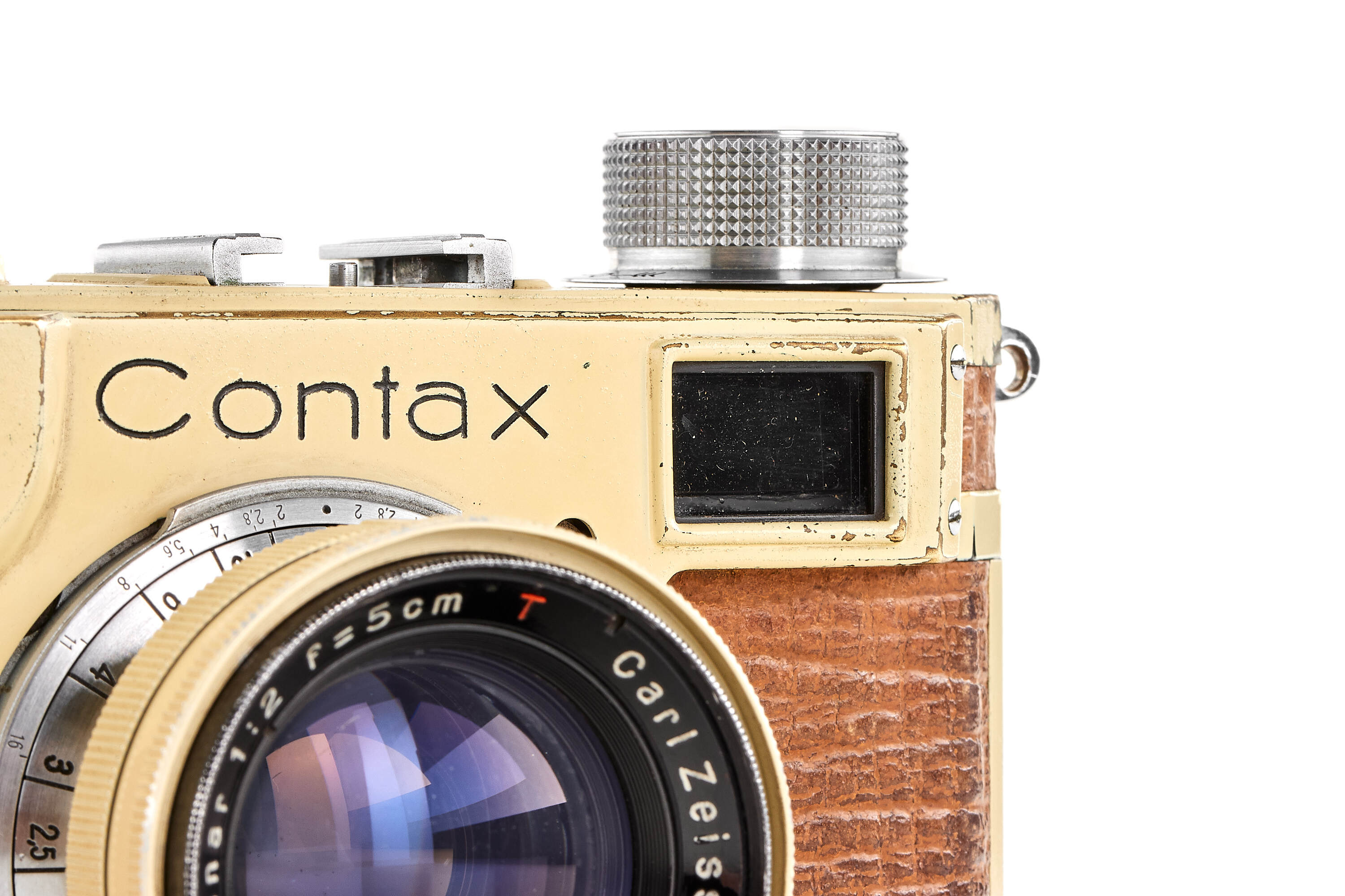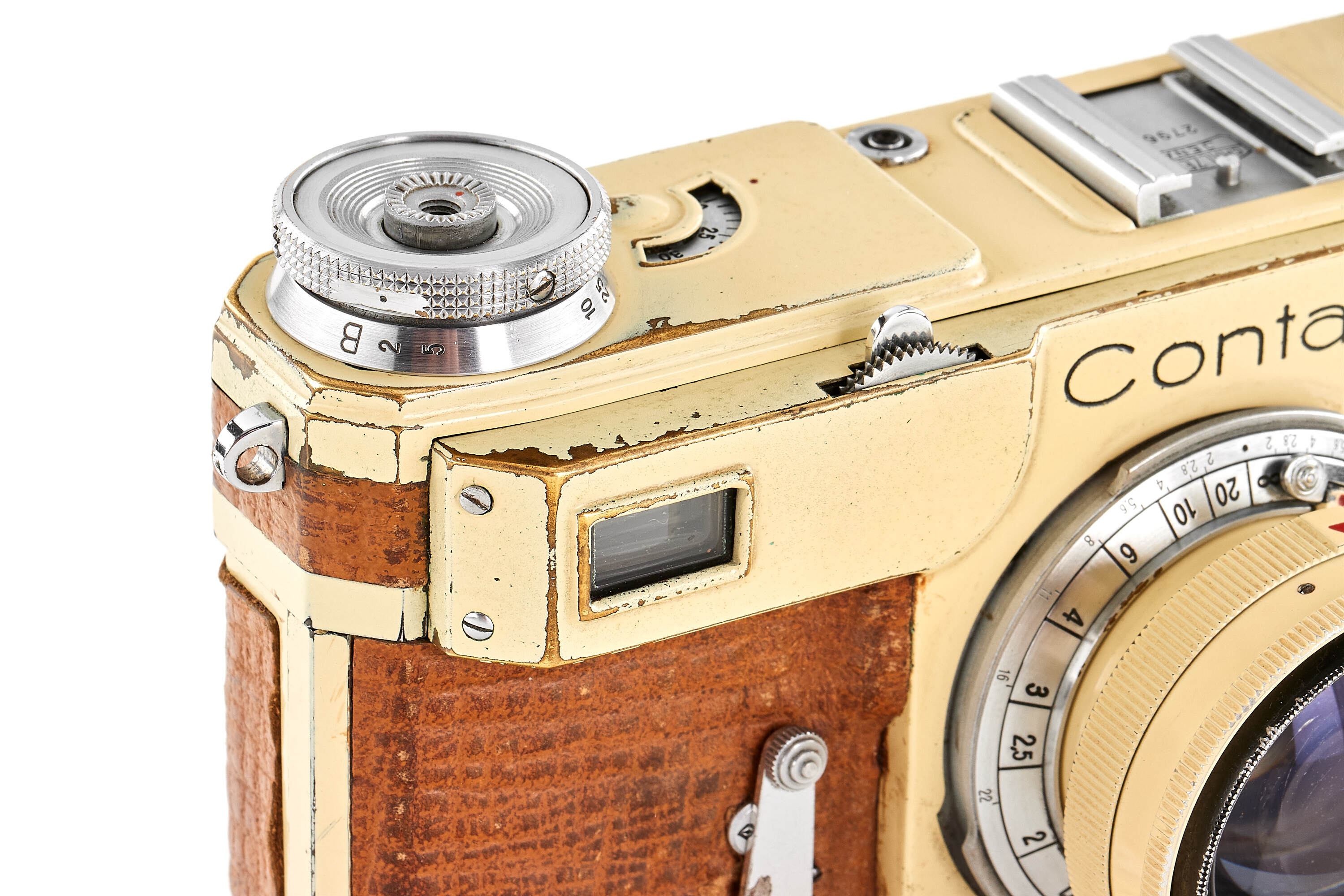 One of very few original prototypes Contax cameras made in Jena, with ivory laquer, from the usual serial number range 279XX, with matching ivory finish Sonnar 2/5cm no.3104773, original light brown leather covering, camera and lens in good condition, a similar camera can be seen in Hans-Jürgen Kuc 'On the Trail of the Contax' vol. II p.130 with Sonnar 2/5cm no.3104774 (!), note the flash sync contact and the interesting high profile film rewind knob, with matching leather case (top cover missing). It is for sure one of the most attractive Contax cameras!