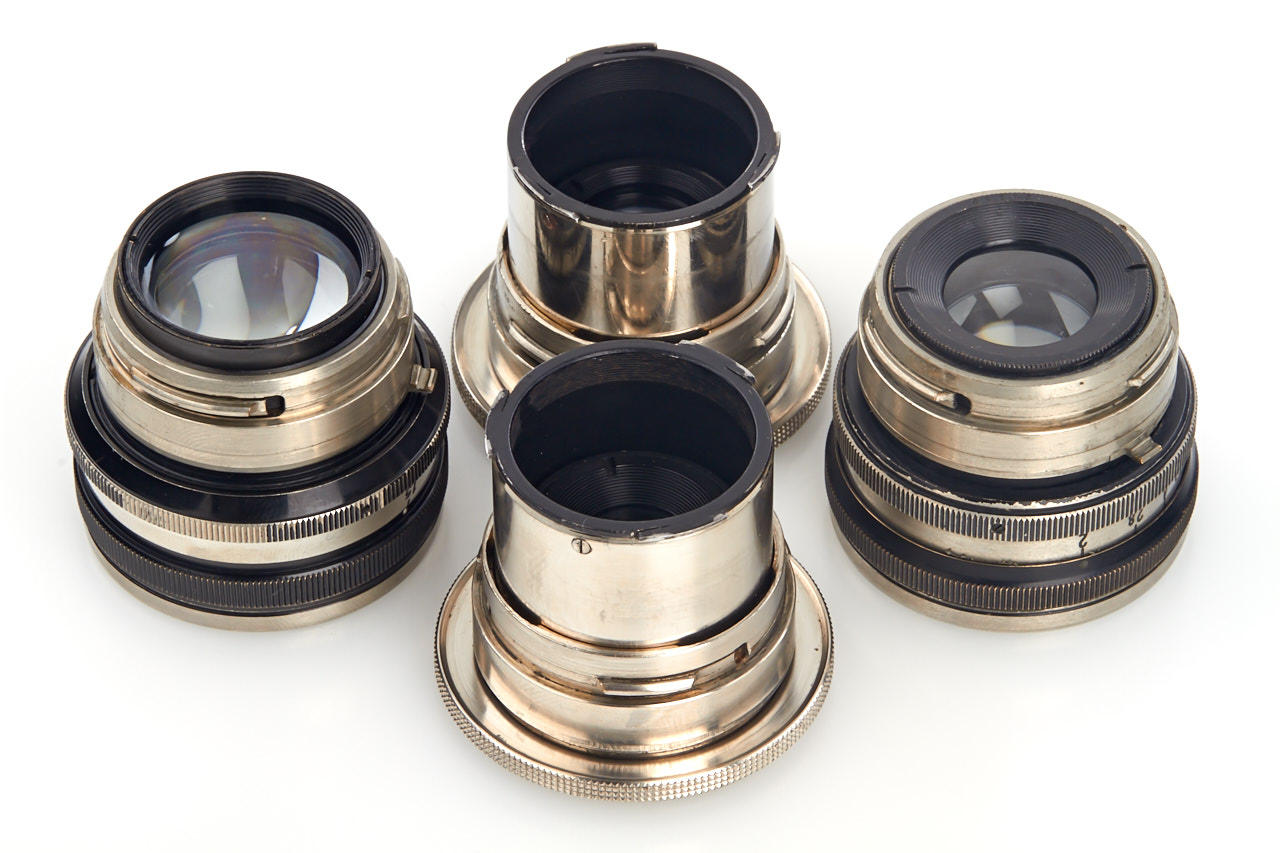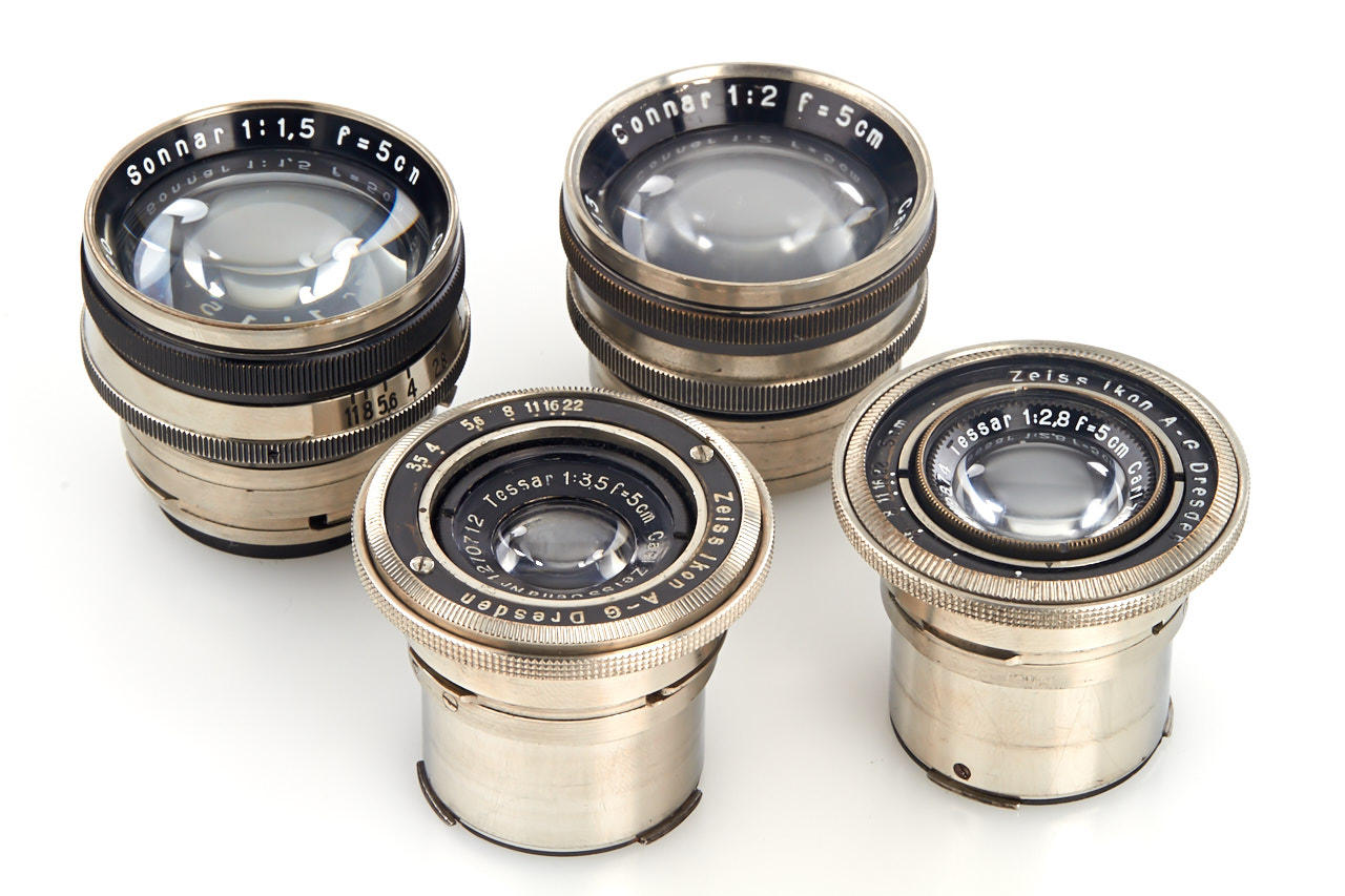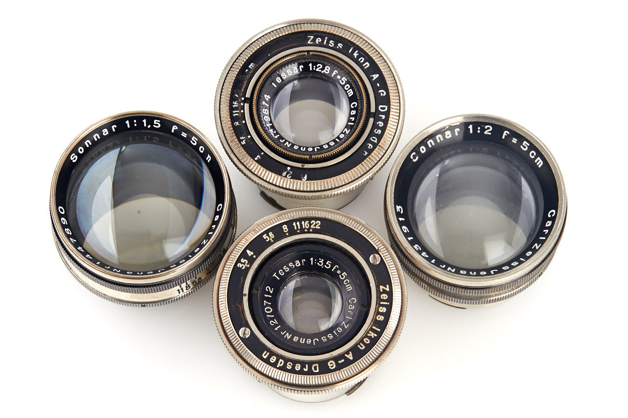4 early Contax lenses in nickel finish: (1) Tessar 3.5/5cm no.1270712 (extremely early lens from 1930), (2) Tessar 2.8/5cm no.1319874 (from the first batch in 1931), (3) Sonnar 2/5cm no.1431913 (1933, cleaning marks), (4) Sonnar 1.5/5cm no.1447890 (1933) - all in good condition, ex Barringer collection