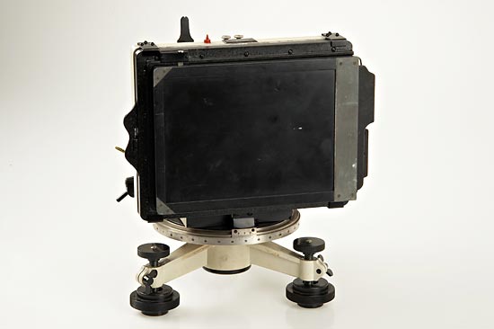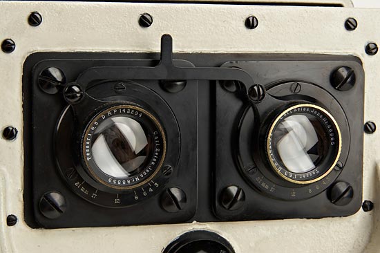 13 x 18cm. A precision stereo camera with white painted metal body and black enamelled fittings, two Tessar 6.3/7cm lenses no.88859 & 88865, mounted on turntable engraved in degrees above three levelling screws. Two rods at the top of the camera operate stencils which number each image in the negative. The bellows extension in millimetres is also imprinted in the negative. Together with one double plate holder, all in original mahogany carrying case. Lacking ground-glass focusing screen. In 1901 Pulfrich developed the Stereocomparator for the accurate exploitation of stereo pairs in terrestrial photogrammetry. This camera was used for scientific purposes where accurate measurements were needed.