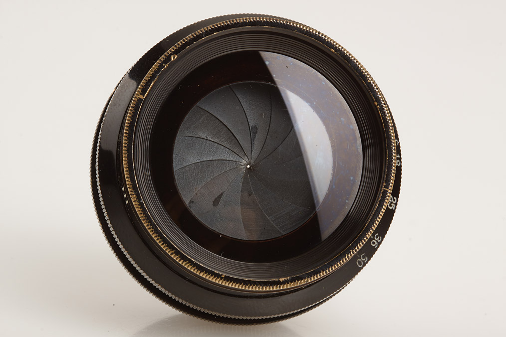 very rare black barrel lens in fine condition, iris diaphragm to 50 (slightly hazy and a few small cleaning marks)