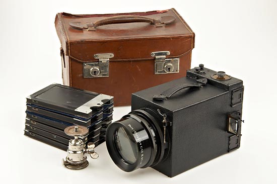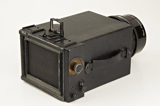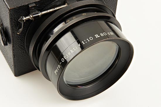 9x12cm telephoto camera with focal plane shutter, Fern-Objektiv 10/80cm no.110718 (the name Fern-Objektiv was later changed to Magnar and the camera sold as the "Magnar Camera"), cap, film holders, case - the rare early version of this special camera in fine condition