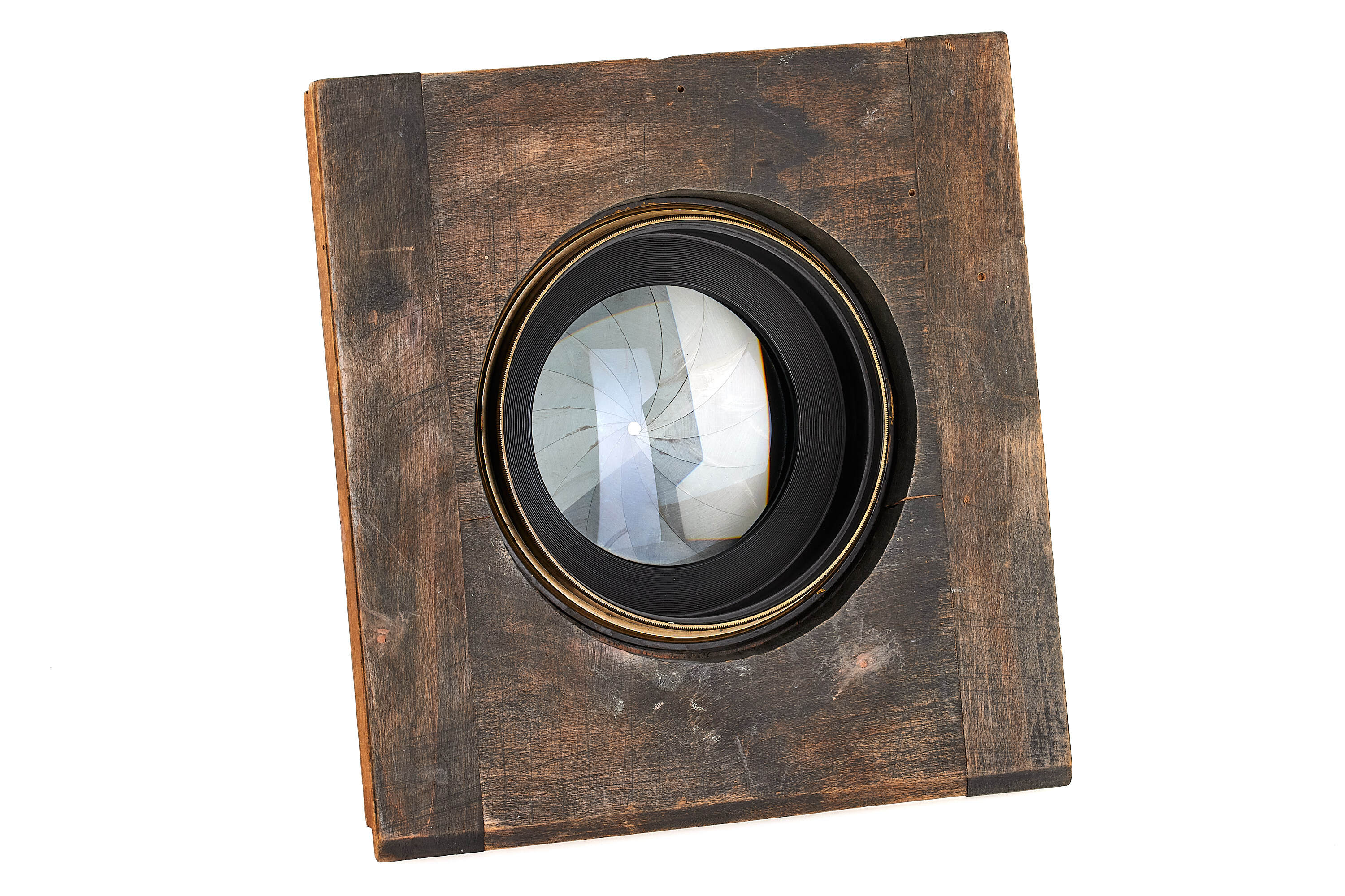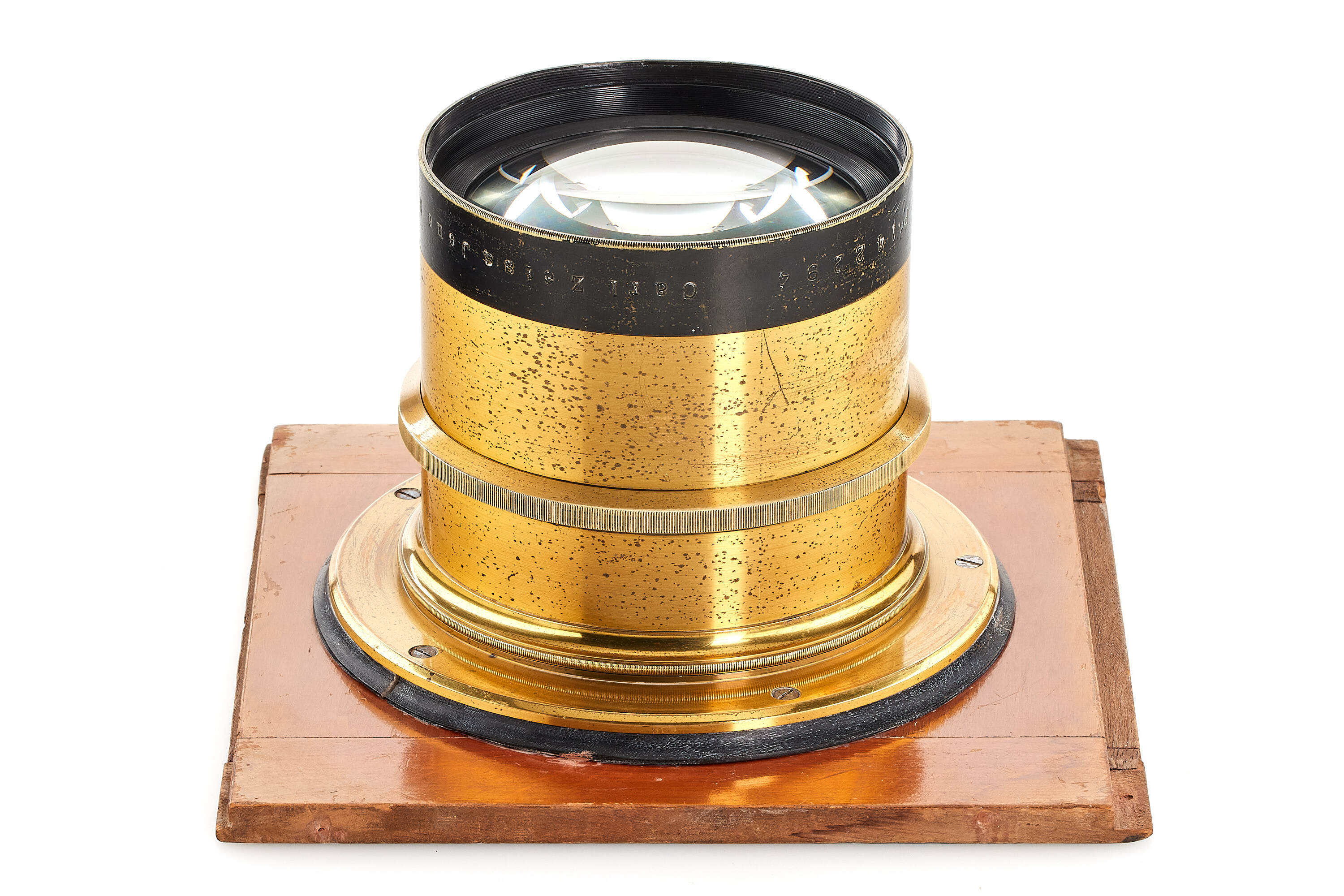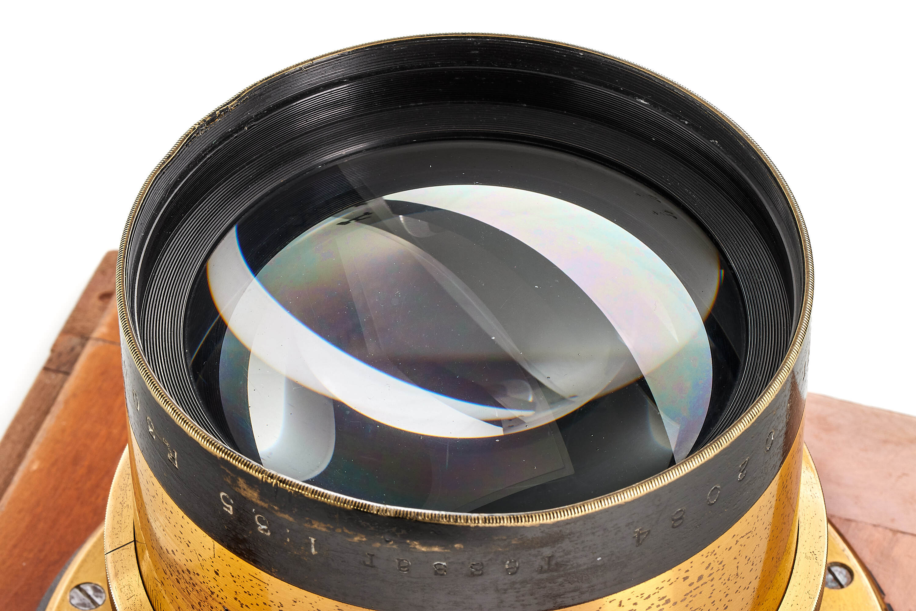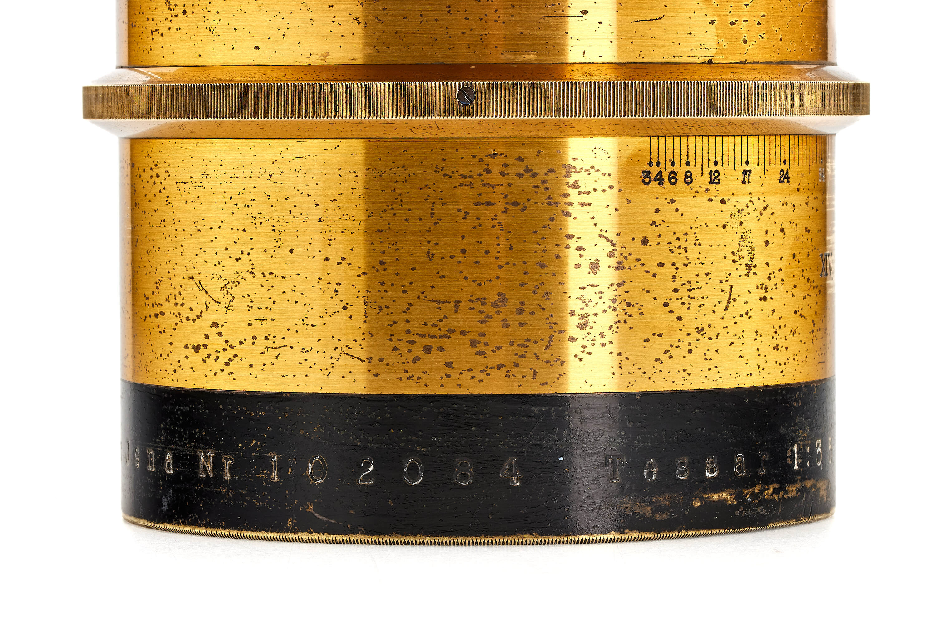 An early, very rare brass version of the fast f:3.5 Tessar 300mm, covering 8x10 with slight vignetting. Old-style aperture scale in millimetres (from 3mm when closed to 68mm when wide open), well-preserved with very good optics, including a mounting ring.