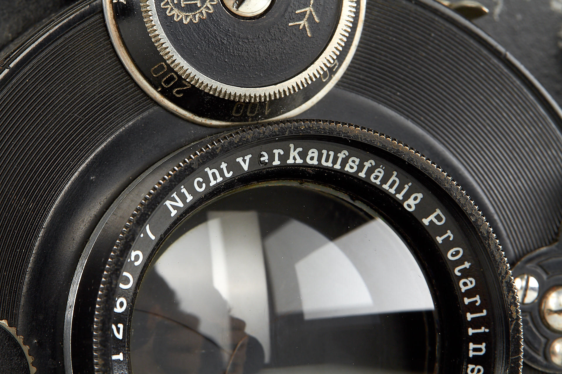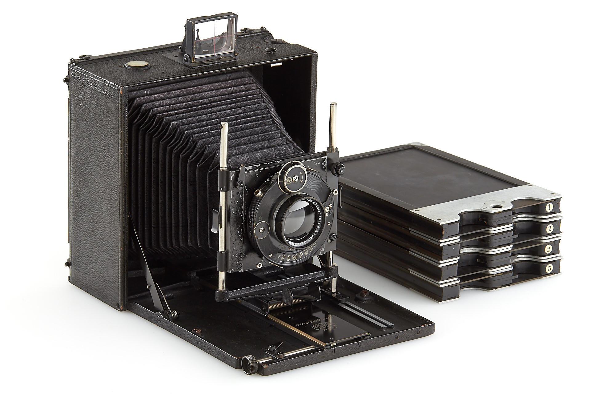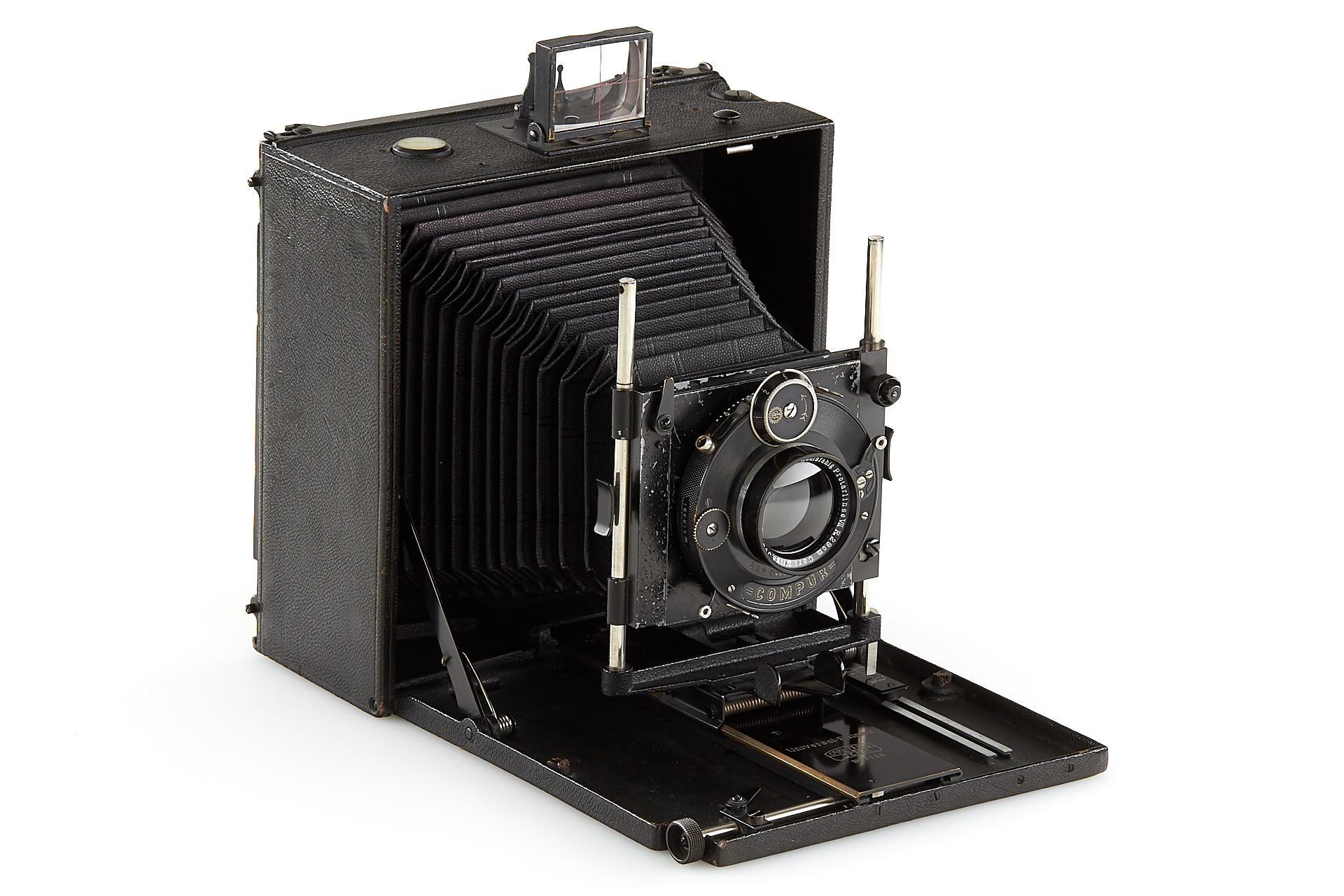 a very rare folding-bed camera in excellent condition, leather-covered aluminium body, removable back for portrait or landscape orientation, with unique Protarlinse 29cm no.126037+126038 - both front and rear element engraved additionally with 'Nicht Verkaufsfähig' (not for sale), mounted in Compur shutter (aperture scale engraved in old style in millimetre), with 4 double plate holders