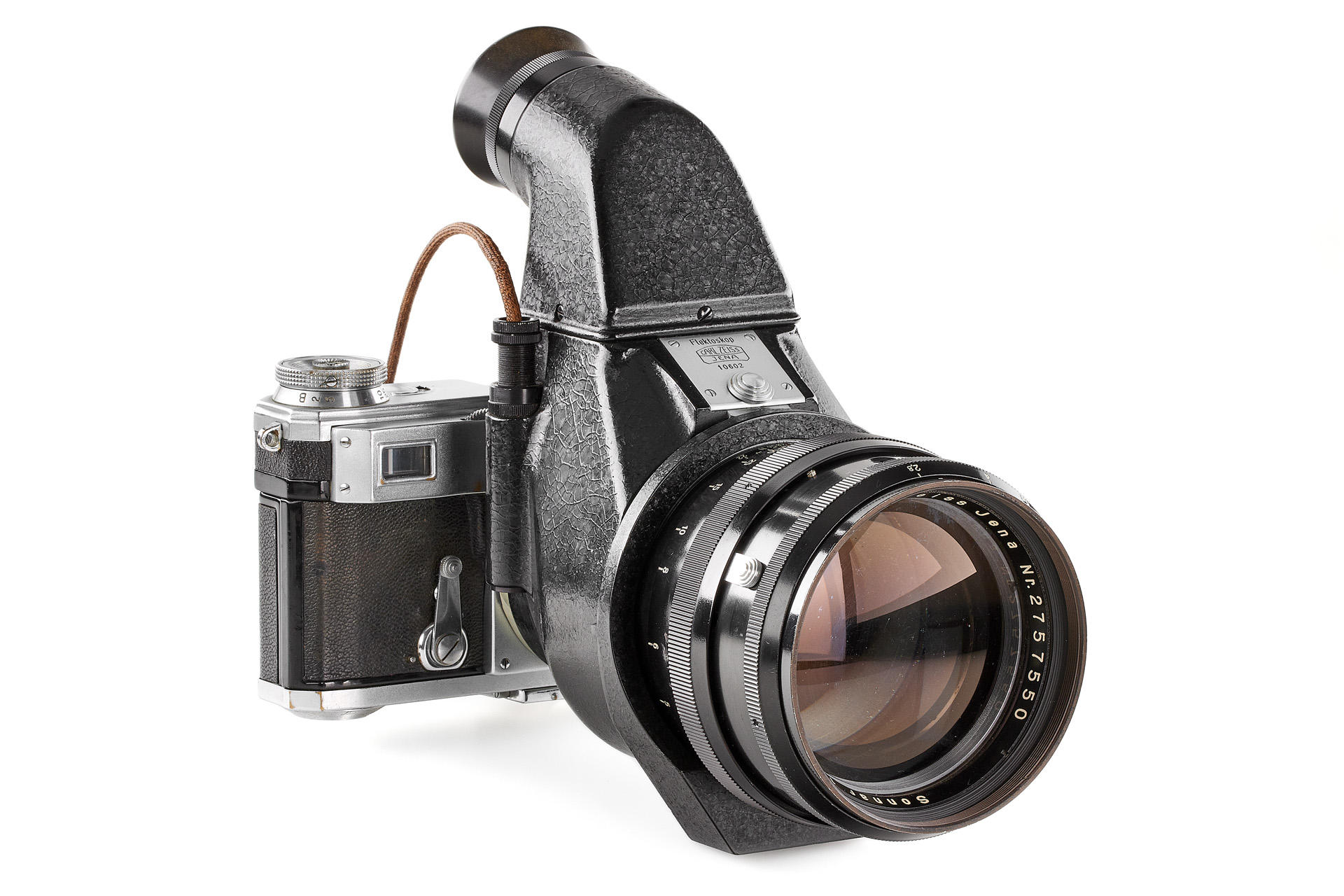 extremely rare black Olympia-Sonnar, with Flektoskop no.10602, in excellent condition, with front cap and Contax II body no.J.73232