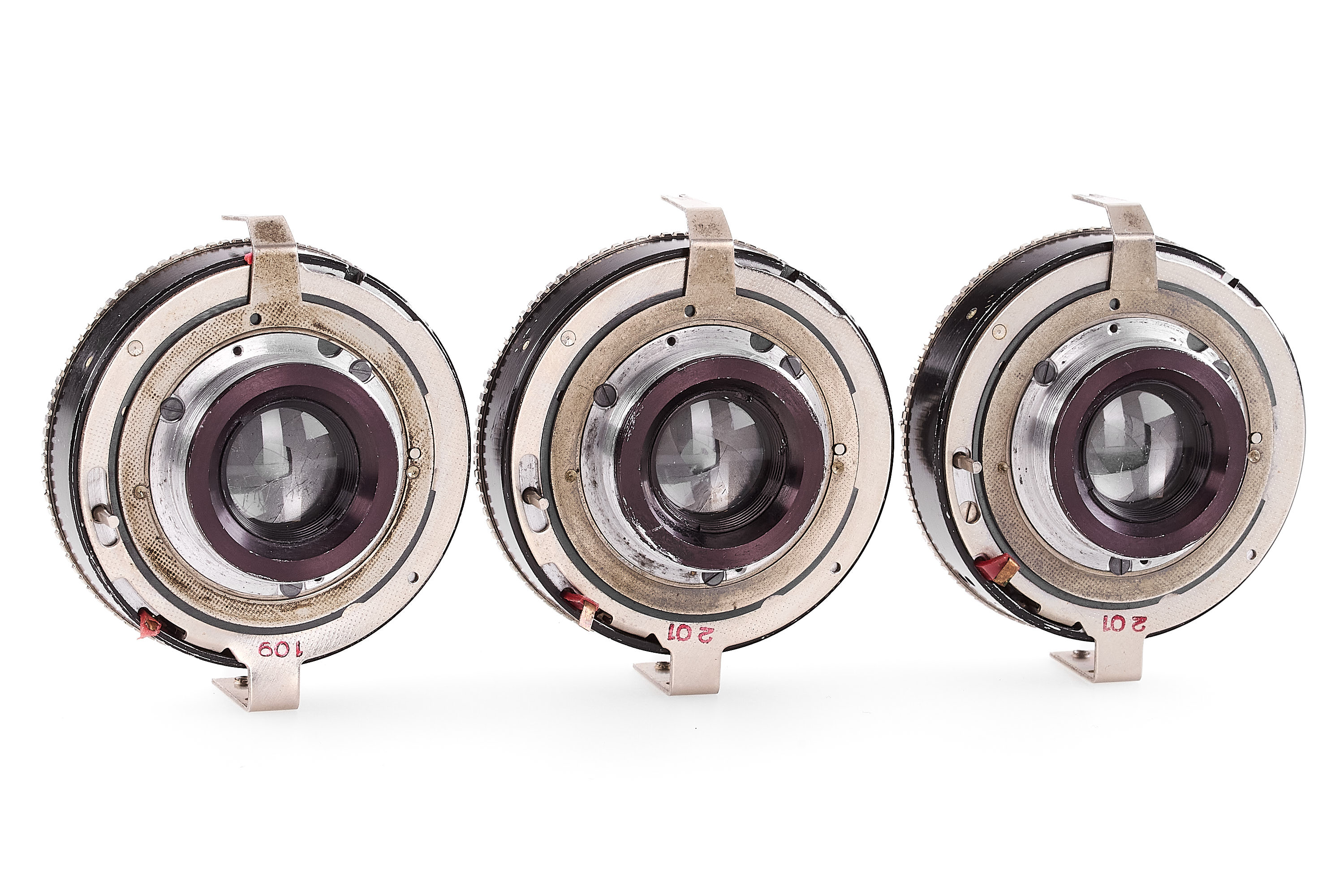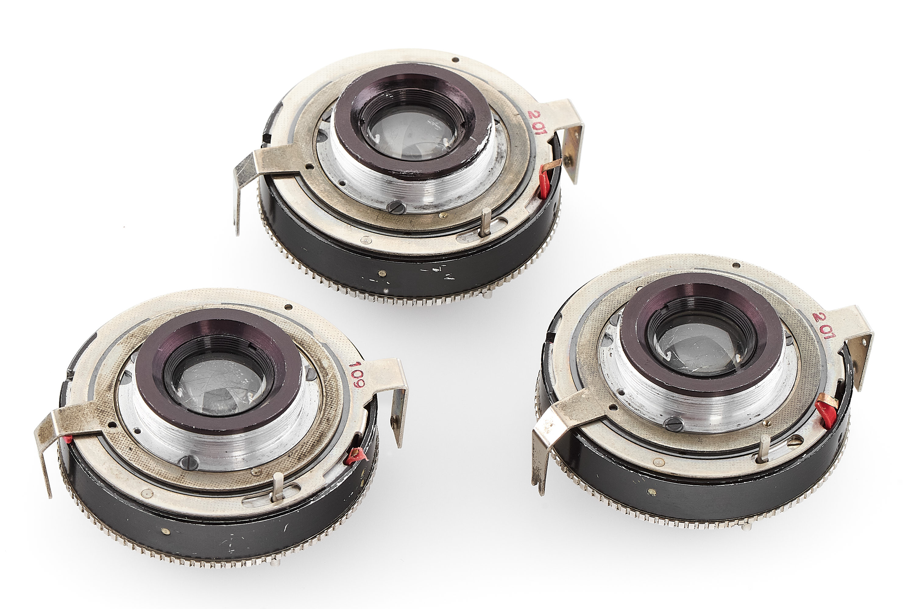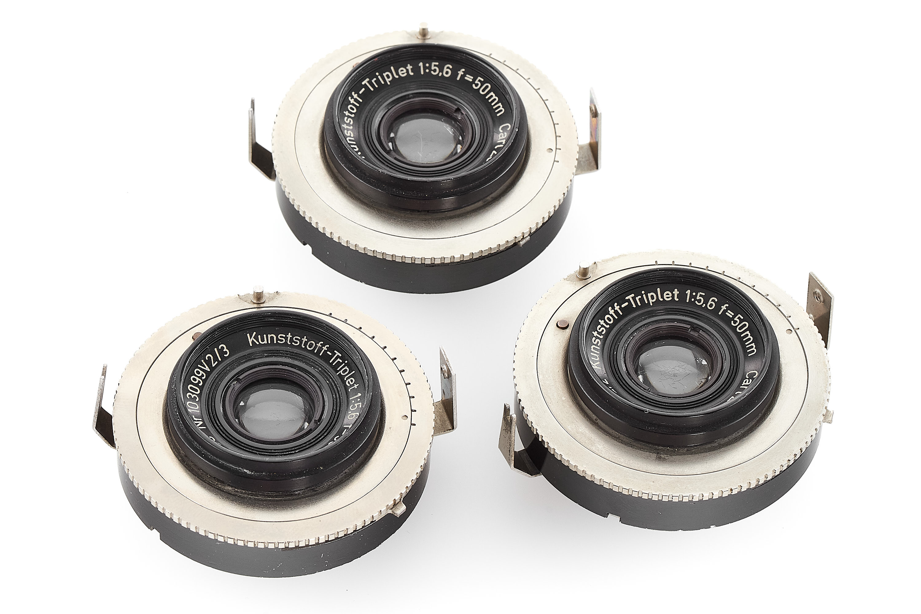 Set of three probably unique prototype lenses with optical elements made of plastic (Kunststoff=Plastic), with consecutive serial numbers: 103099V2/1, 103099V2/2 and 103099V2/3, each c.24mm high, front and rear element diameter c.12mm, optics with small flaws, all in unmarked shutters with built-in diaphragms.