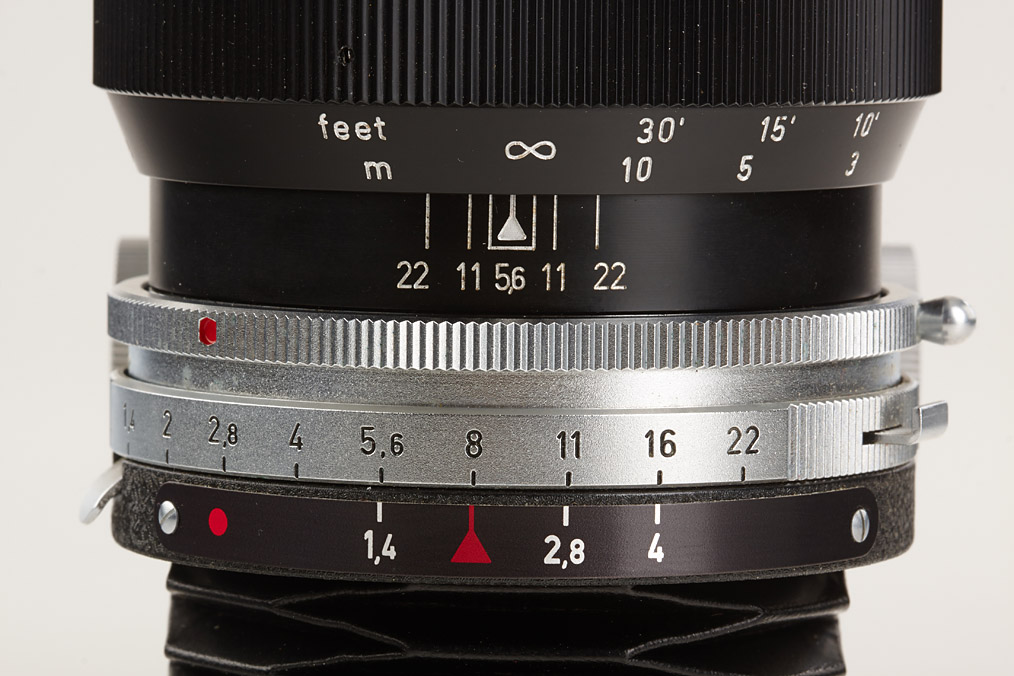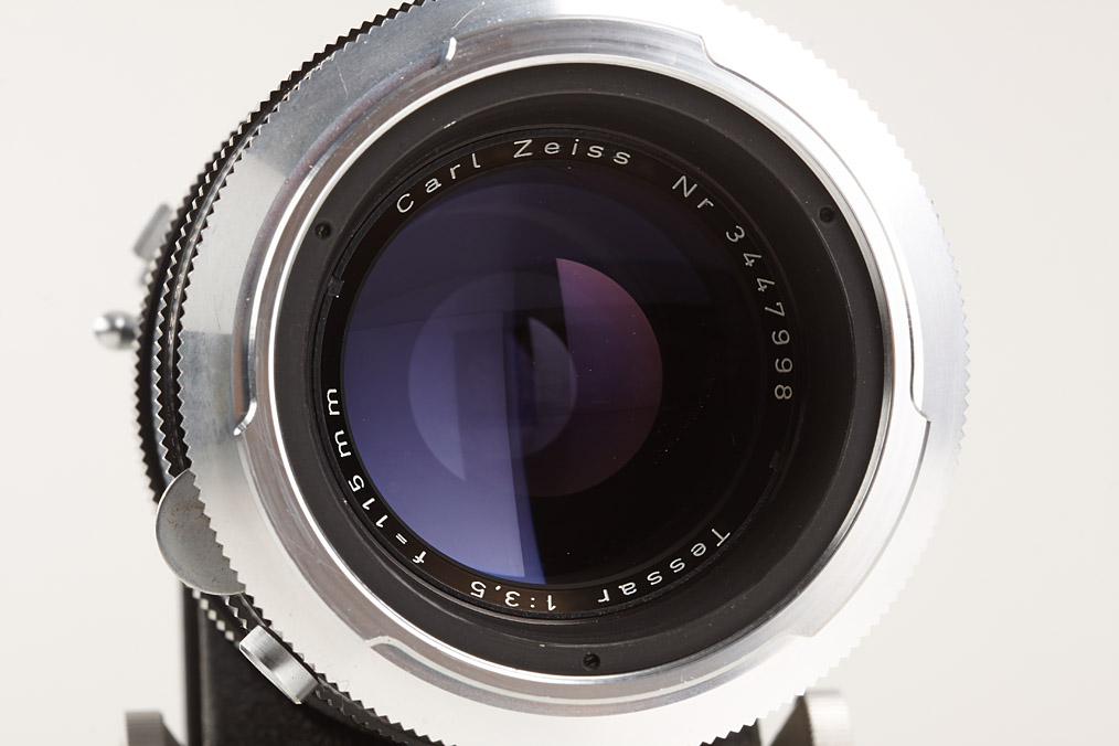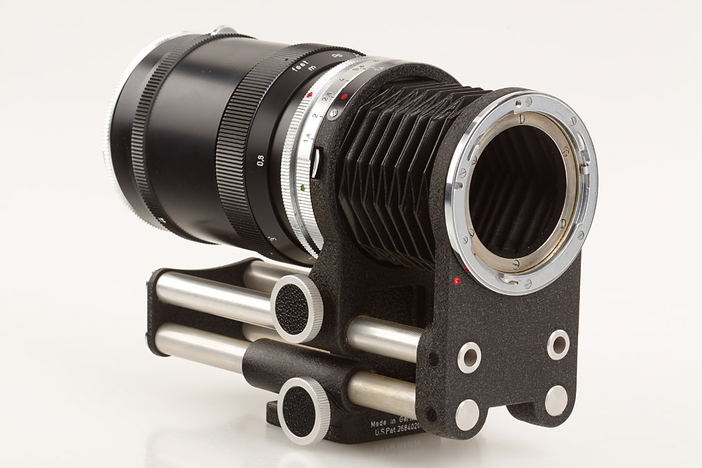 for Contarex, early all-black version with chrome front ring, from first batch of 500 lenses, in mint condition (clean lenses, caps), Contarex bellows