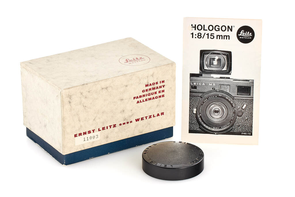 The famous Carl Zeiss 15mm Hologon f/8 for Leica M, in near-mint condition with clean optics (minimal marks on the rear element). Complete with the dedicated 15mm finder, original center filter, both caps, German brochure and the extremely rare original maker’s box with matching serial number.