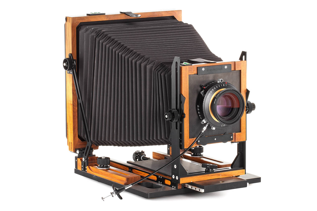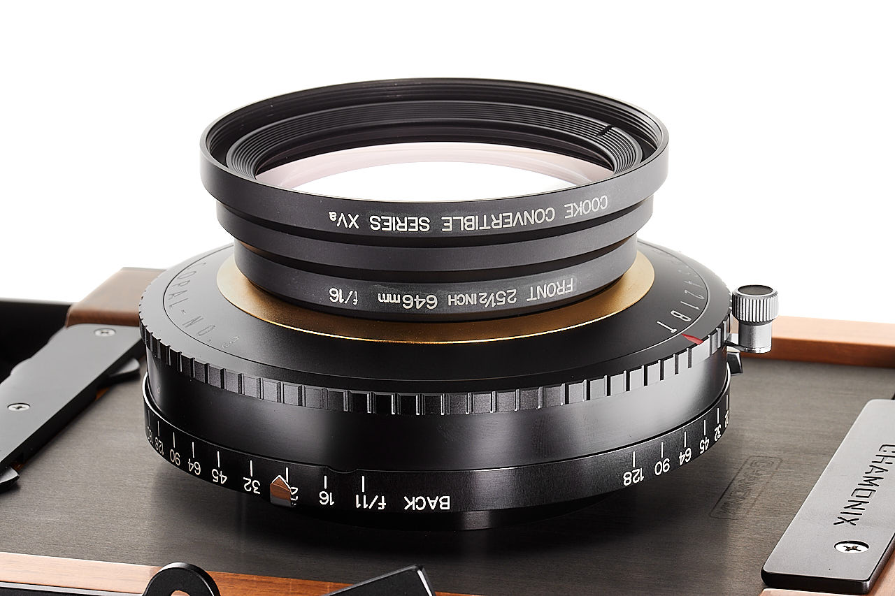 High-quality large format field camera for 8x10", in absolutely mint condition, with hard case, together with high-end Cooke Convertible Series XVa 6.8/311mm - 11/476mm - 16/646mm no.220 mounted in Copal-NO.3 shutter and Chamonix plate, in mint condition and working order, with all 3 front caps, 3x 82mm filters (UV - red - pol-circ), 2x 62mm UV filters, rear lens cap, tool to interchange optics and hard case.