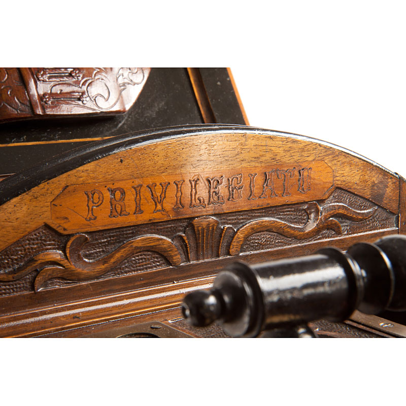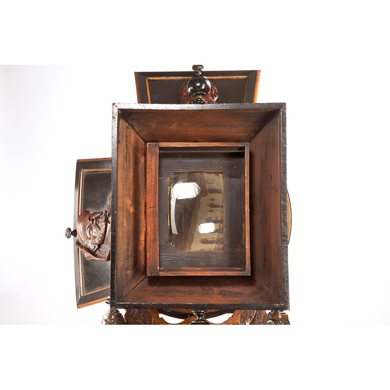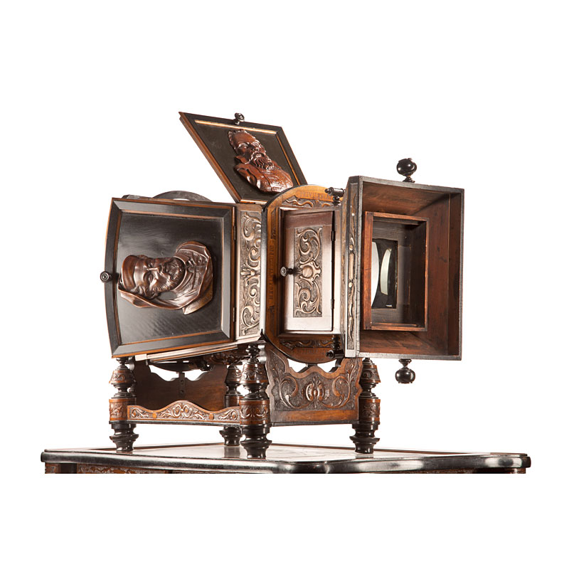 CARLO PONTI MÉGALÉTHOSCOPE, this unique museum items was made by special order, the carved stained walnut viewer with ebony trim, 35½" long. The front of the viewer, carved with floral scroll design, and mounted with two knobs for rotating the viewer. The front section contains a 3 3/4 x 5" magnifying lenses, which is interchangeable for a second 5½ x 7 in. lens which gives a greater magnification. The lens is mounted in an interior wooden box with removable 4 3/4 x 6½" mask, accessible through a small hinged lid at the top of the viewer. This lens section is focused by a handle on each side of the viewer which sides in two brass-edged tracks. The viewer is mounted in the middle on a walnut circle and at the back with a wrought iron circle in the form of a serpent, which rotates the entire viewer for portrait views. The circle is carved with the words "Ponti Venezia", "Megaletoscopio" and "Privilegiato". The flared back section with four carved panels, each 14¼ x 15¼", and each carved in high relief with the bust of a different Venetian noblemen. The top panel and one of the side panels are hinged and mounted on the inside with a mirror to direct the light for front-lit viewing. The back of the viewer with hinged highly carved panel, 10 3/4 x 14¼", showing a Roman soldier with sword and shield stabbing a kneeling man in the neck. The inside of the back panel mounted with a large sheet of illustrated instructions printed in English. When opened the back reveals a hinged frame on the inside bottom of the viewer which can be raised to hold 11 in. wide views. The whole viewer rests on a stand with four turned legs and metal bracket in which the walnut circle and the iron circle ride. The viewer and stand sit on top of a matching storage cabinet with inset marble top and hairy claw legs. The stained walnut cabinet, 27 x 30 x 41", with rosewood inlay and ebony trim, and hinged doors in the front. The doors are carve