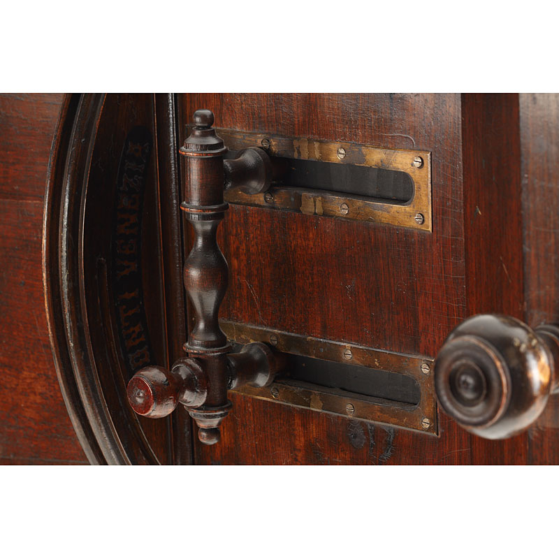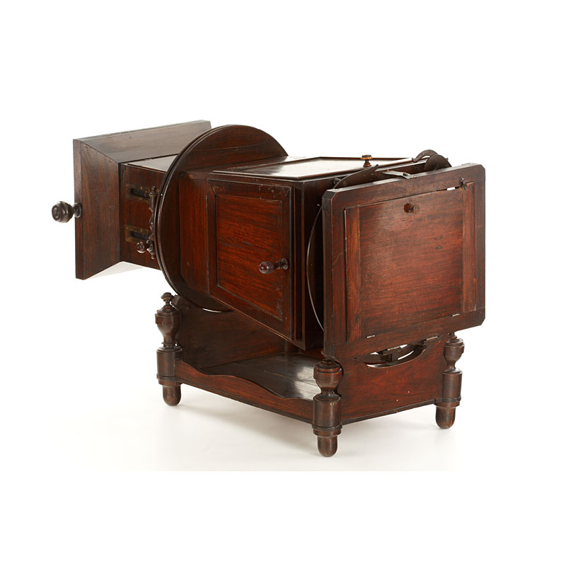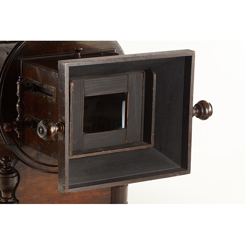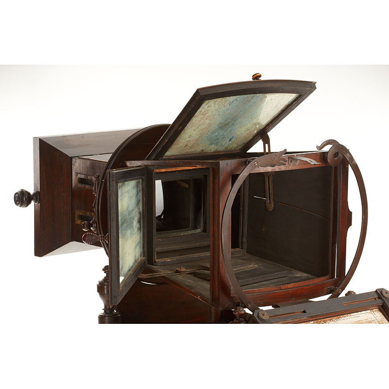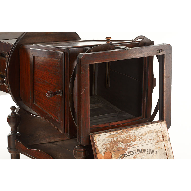 The 'MEGALITOSCOPIO' (in fully original condition) by Charles Ponti is an oversized viewer in which photographs are viewed through a large lens which creates the optical illusion of depth and perspective. The albumen photographs are lit by daylight admitted via a system of opening doors. Ponti and others produced specially prepared photographs for use in the Megalethoscope. The photographs themselves were translucent and were coloured and pierced to create dramatic visual effects, such as using backlighting to create the impression of night time. Included are 20 photographs and lithographs (France, Suisse and Italian images, for example the Louvre, Versailles, Milan Cathedral, etc.) mounted on wooden 30x40cm frames with printed captions on the back.