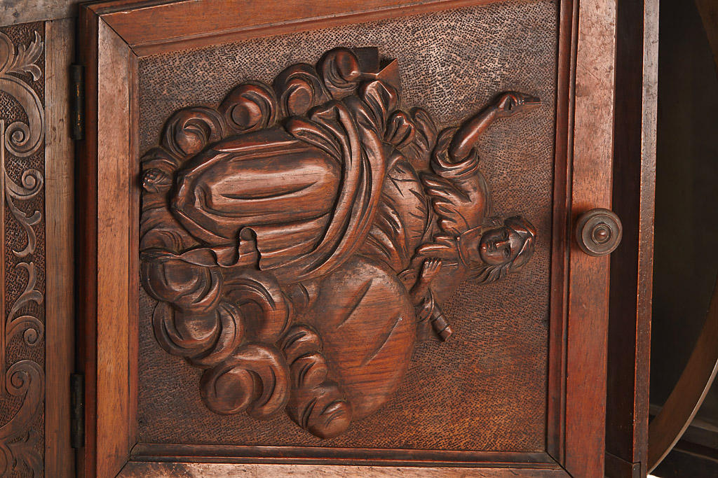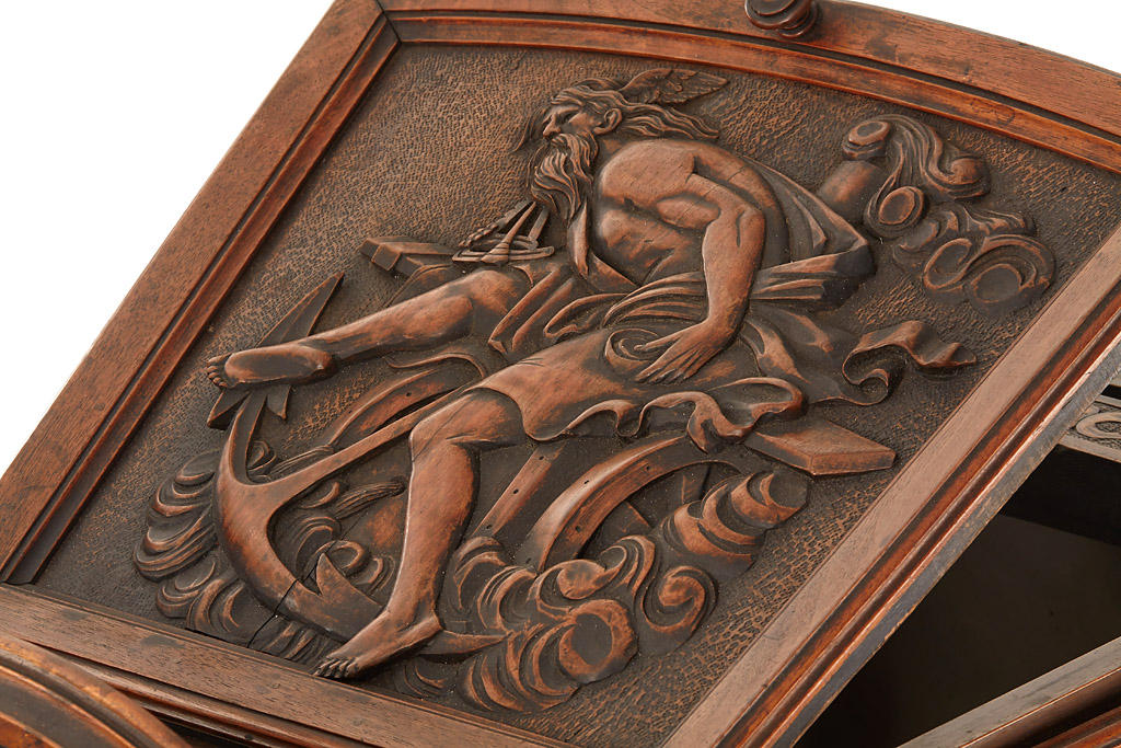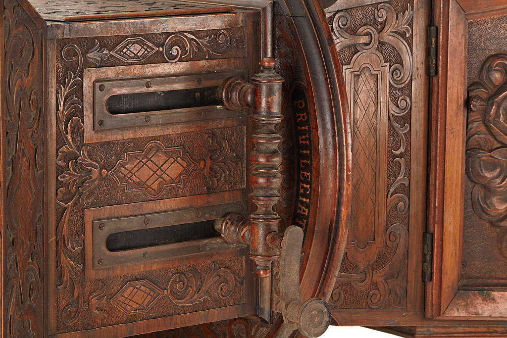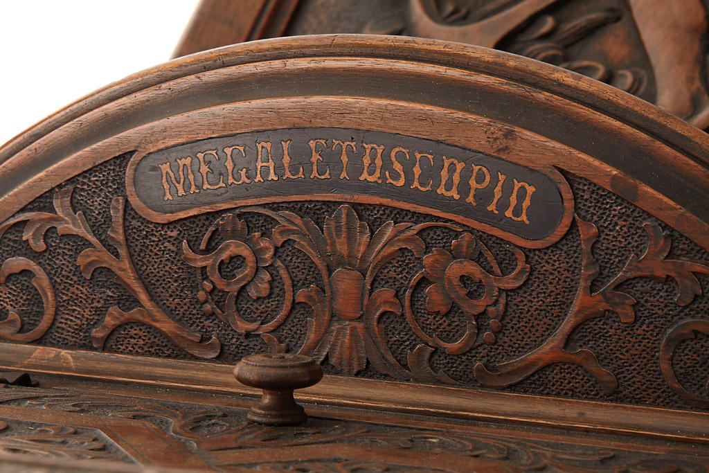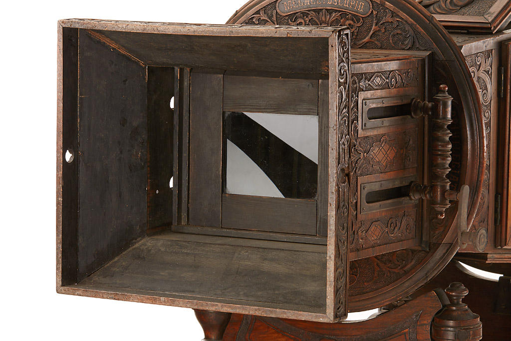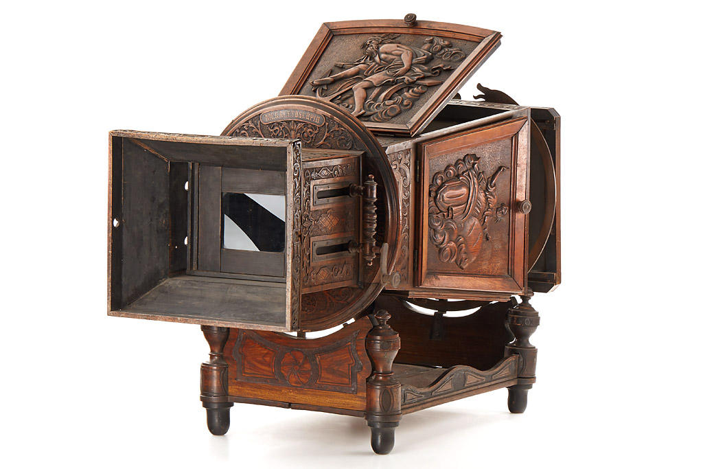 The 'MEGALITOSCOPIO' ('Luxus' version in fully original condition) by Charles Ponti is an oversized viewer in which photographs are viewed through a large lens which creates the optical illusion of depth and perspective. The albumen photographs are lit by daylight admitted via a system of opening doors. Ponti and others produced specially prepared photographs for use in the Megalethoscope. The photographs themselves were translucent and were coloured and pierced to create dramatic visual effects, such as using backlighting to create the impression of night time.