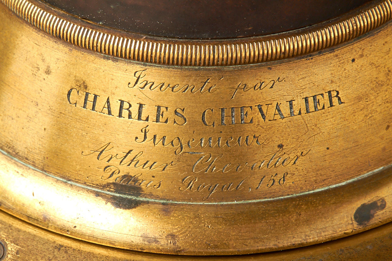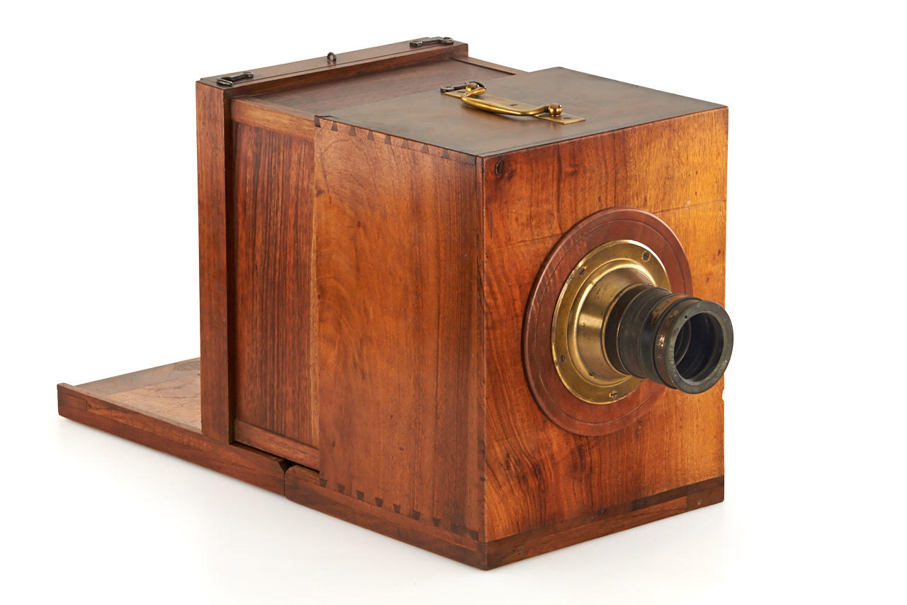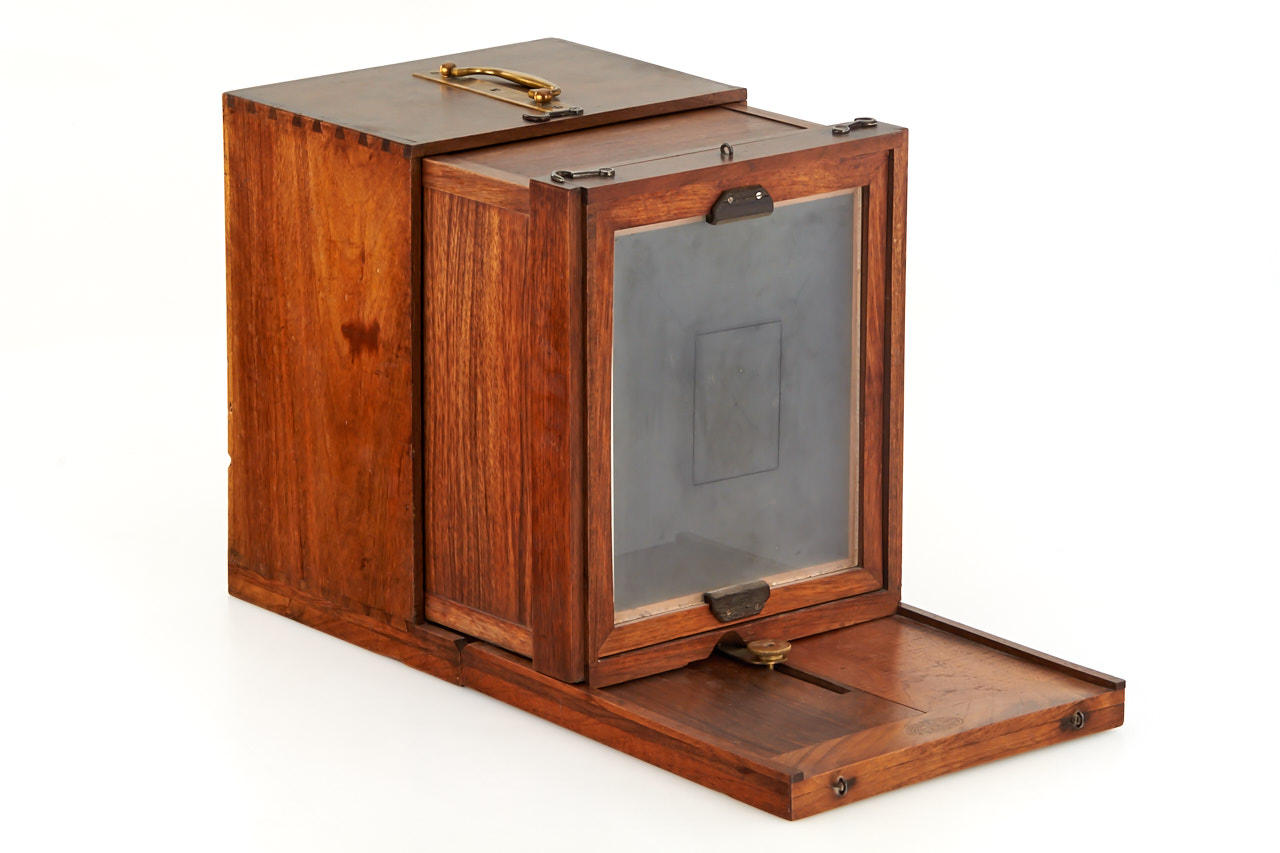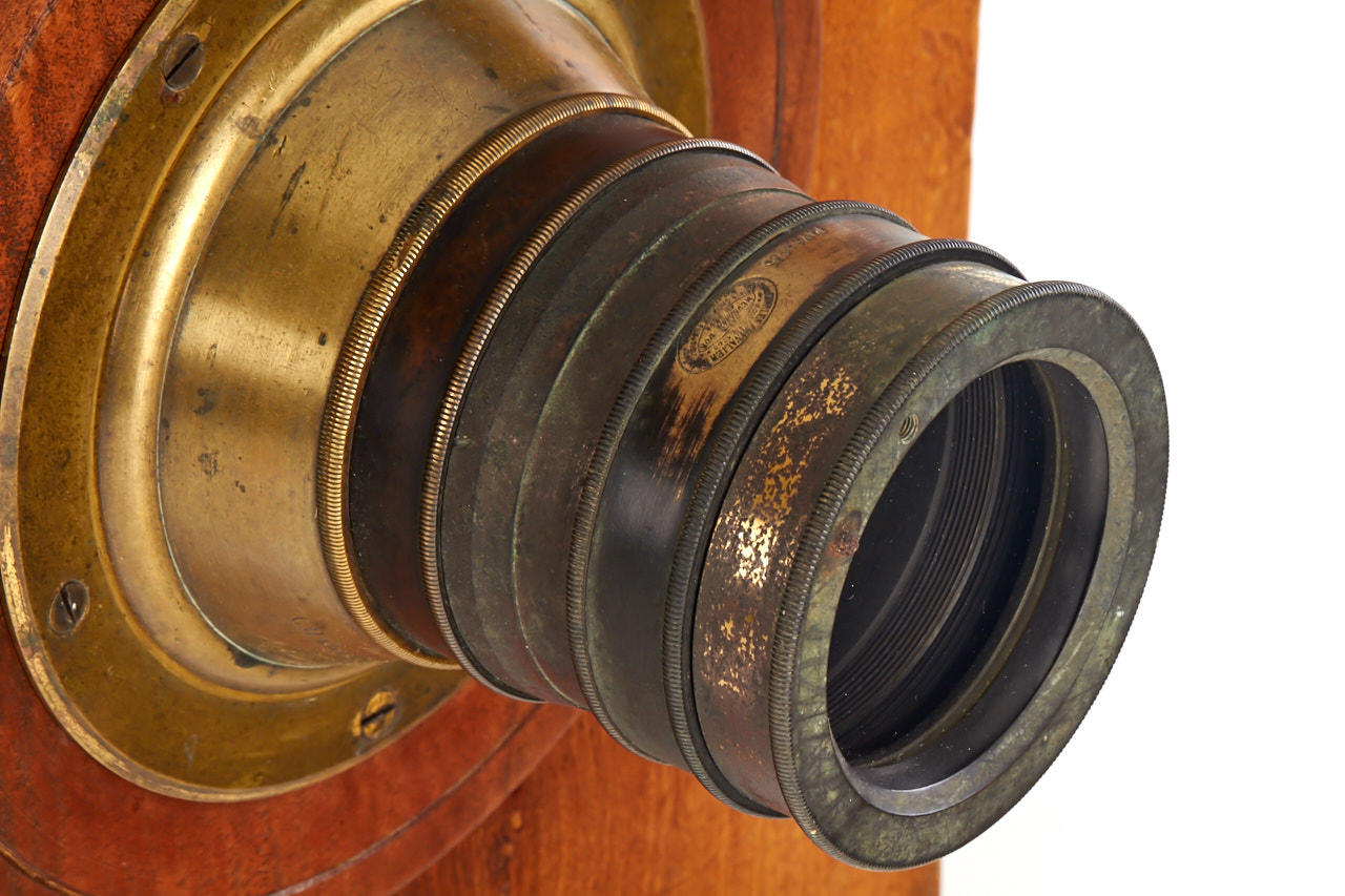Transitional era (Daguerrian / Collodion) outfit including a whole plate sliding box camera, a portrait/landscape lens, large iron studio tripod and a head rest. The oval blind stamp on the camera says 'Maison Charles Chevalier Ingénieur / Fondée en 1760 / Deux médailles d’or en 1834 / Arthur Chevalier Fils et Successeur / Palais Royal 158'. The sliding box camera is made of old French walnut, with dovetail joints. The combination lens is signed 'Inventé par Charles Chevalier / Ingénieur / Arthur Chevalier / Palais Royal 158', it has 2 groups of lenses, a diaphragm ring for portraits and one for landscapes. These inscriptions indicate a date of manufacture at about 1858. The studio tripod is made of cast iron, steel and brass. The embossed label reads 'E.L. Breveté S.G.D.G. PARIS'. It is also signed 'LANGLOIS / Rue de BONDY, 70 / PARIS' in cast relief on the turntable. This tripod was patented in 1856 by LANGLOIS and made in his own workshops from that date on. The head rest is by the same maker. The embossed label reads 'LANGLOIS / Rue de BONDY, 70 / PARIS' An unique complete studio outfit by Chevalier / Langlois - the camera, lens, tripod and headrest are in beautiful and original condition. Included copies of the original advertisements.