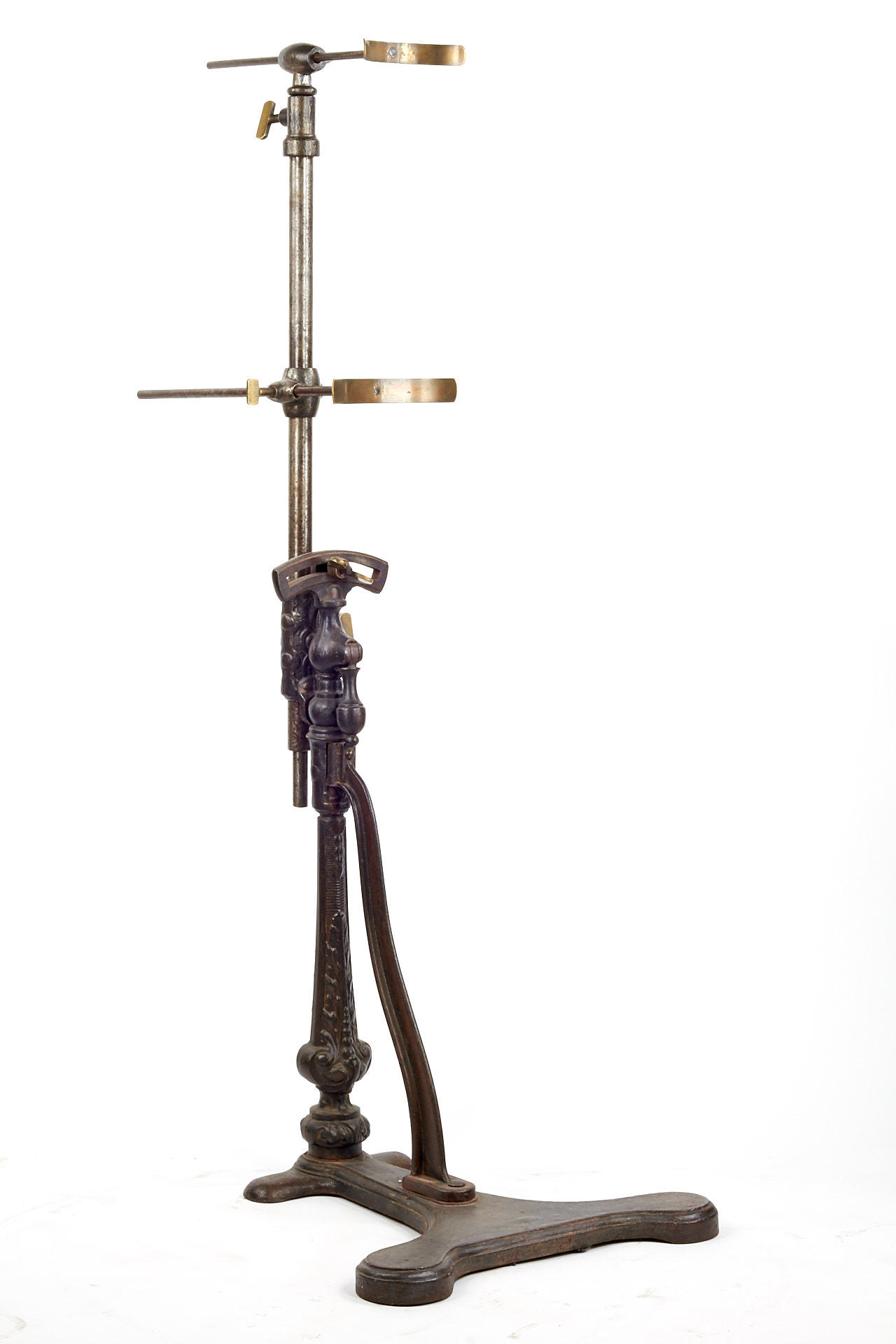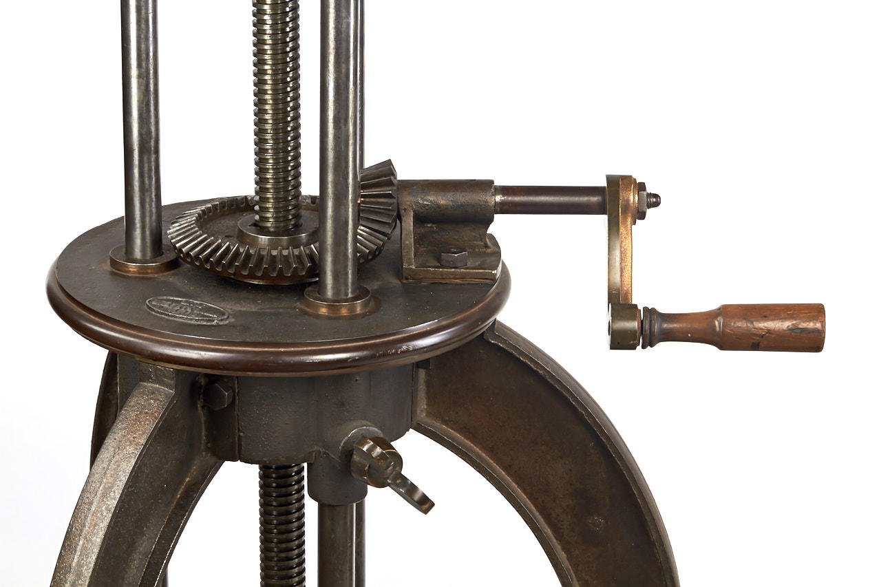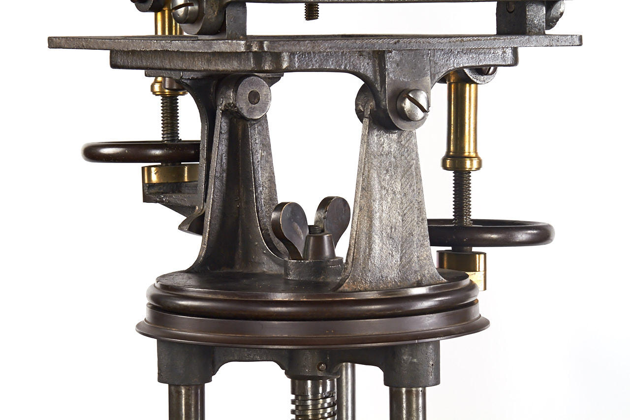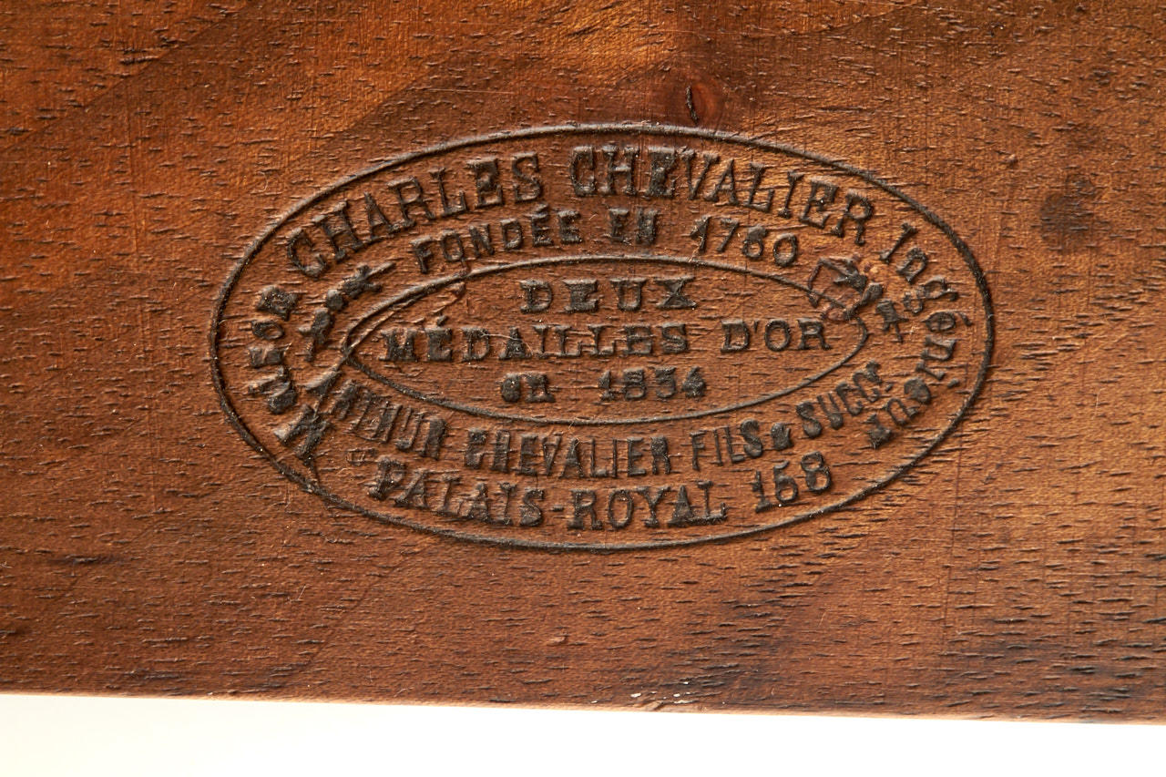 Transitional era (Daguerrian / Collodion) outfit including a whole plate sliding box camera, a portrait/landscape lens, large iron studio tripod and a head rest. The oval blind stamp on the camera says 'Maison Charles Chevalier Ingénieur / Fondée en 1760 / Deux médailles d’or en 1834 / Arthur Chevalier Fils et Successeur / Palais Royal 158'. The sliding box camera is made of old French walnut, with dovetail joints. The combination lens is signed 'Inventé par Charles Chevalier / Ingénieur / Arthur Chevalier / Palais Royal 158', it has 2 groups of lenses, a diaphragm ring for portraits and one for landscapes. These inscriptions indicate a date of manufacture at about 1858. The studio tripod is made of cast iron, steel and brass. The embossed label reads 'E.L. Breveté S.G.D.G. PARIS'. It is also signed 'LANGLOIS / Rue de BONDY, 70 / PARIS' in cast relief on the turntable. This tripod was patented in 1856 by LANGLOIS and made in his own workshops from that date on. The head rest is by the same maker. The embossed label reads 'LANGLOIS / Rue de BONDY, 70 / PARIS' An unique complete studio outfit by Chevalier / Langlois - the camera, lens, tripod and headrest are in beautiful and original condition. Included copies of the original advertisements.