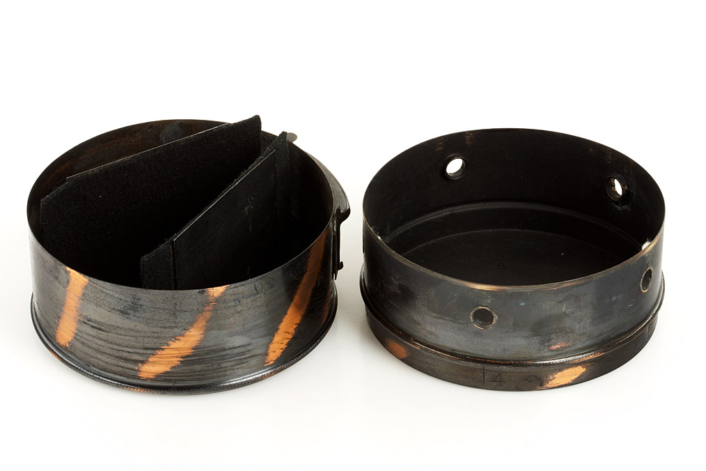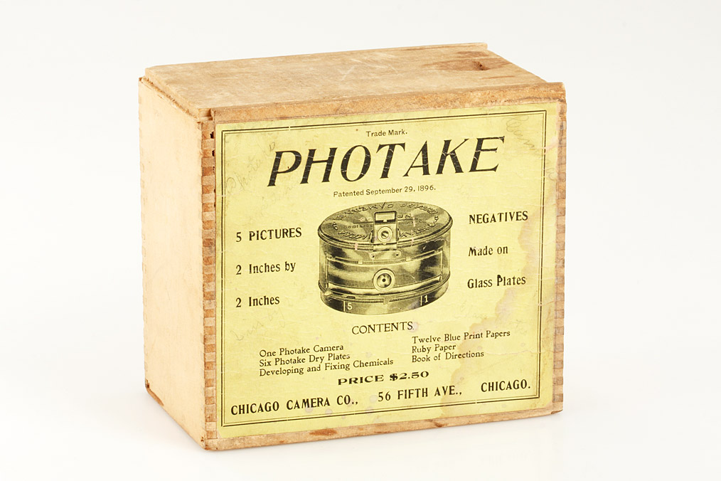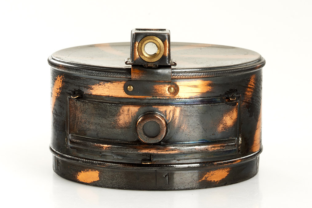 Seamless cylindrical camera for 5 exposures 5x5cm on plates, Achromat lens 14/120mm, rare and unusual. Designed by Henry E. Willsie of La Crosse Wisconsin. His camera was granted U.S. Patent 586,422 on the 29th September 1896 and was manufactured by the Chicago Camera Co., Illiniois, in fantastic and fully original condition with finder, instructions, original print paper, wooden maker's box - ex Naylor collection