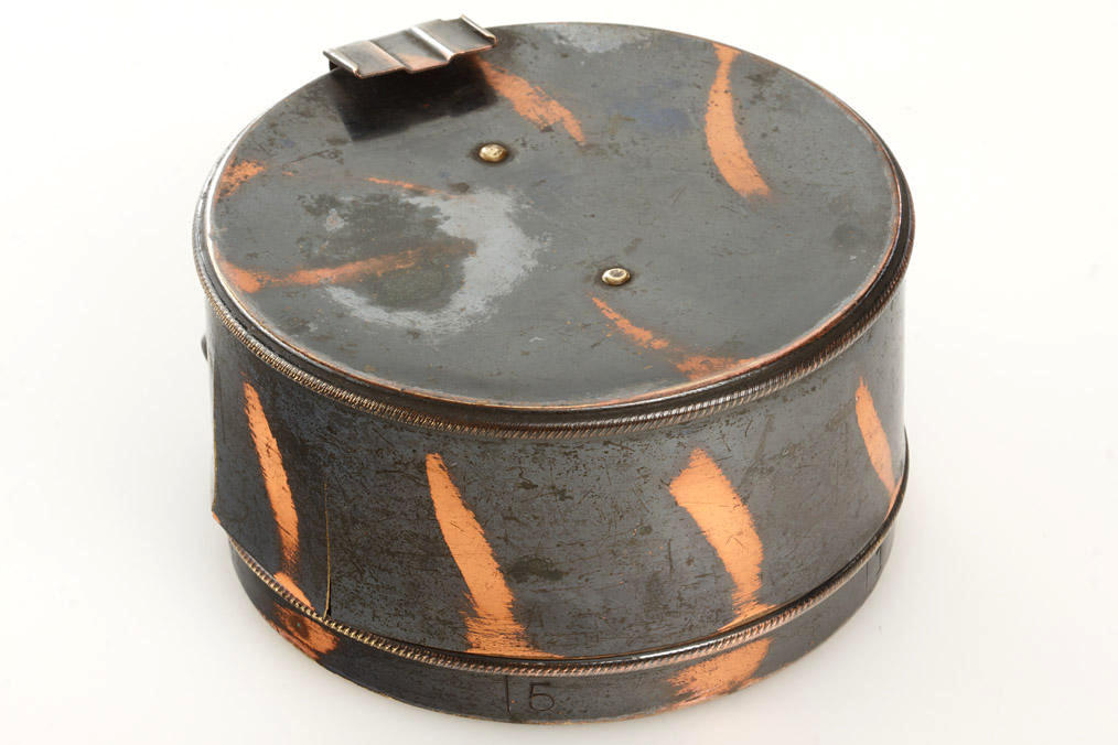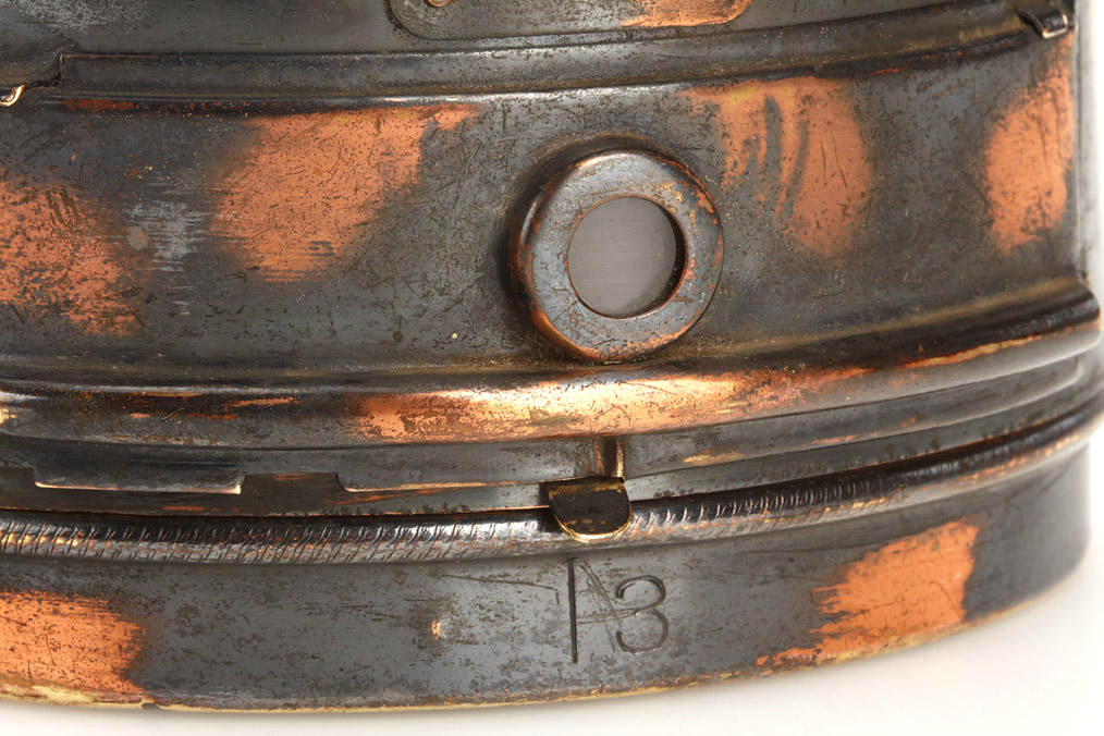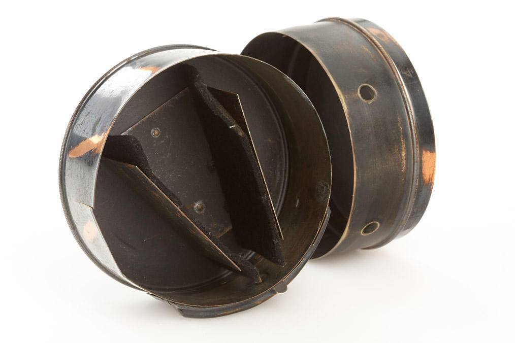 Seamless cylindrical camera for 5 exposures 5x5cm on plates, Achromat lens 14/120mm, rare and unusual. Designed by Henry E. Willsie of La Crosse Wisconsin. His camera was granted U.S. Patent 586,422 on the 29th September 1896 and was manufactured by the Chicago camera Co., Illiniois