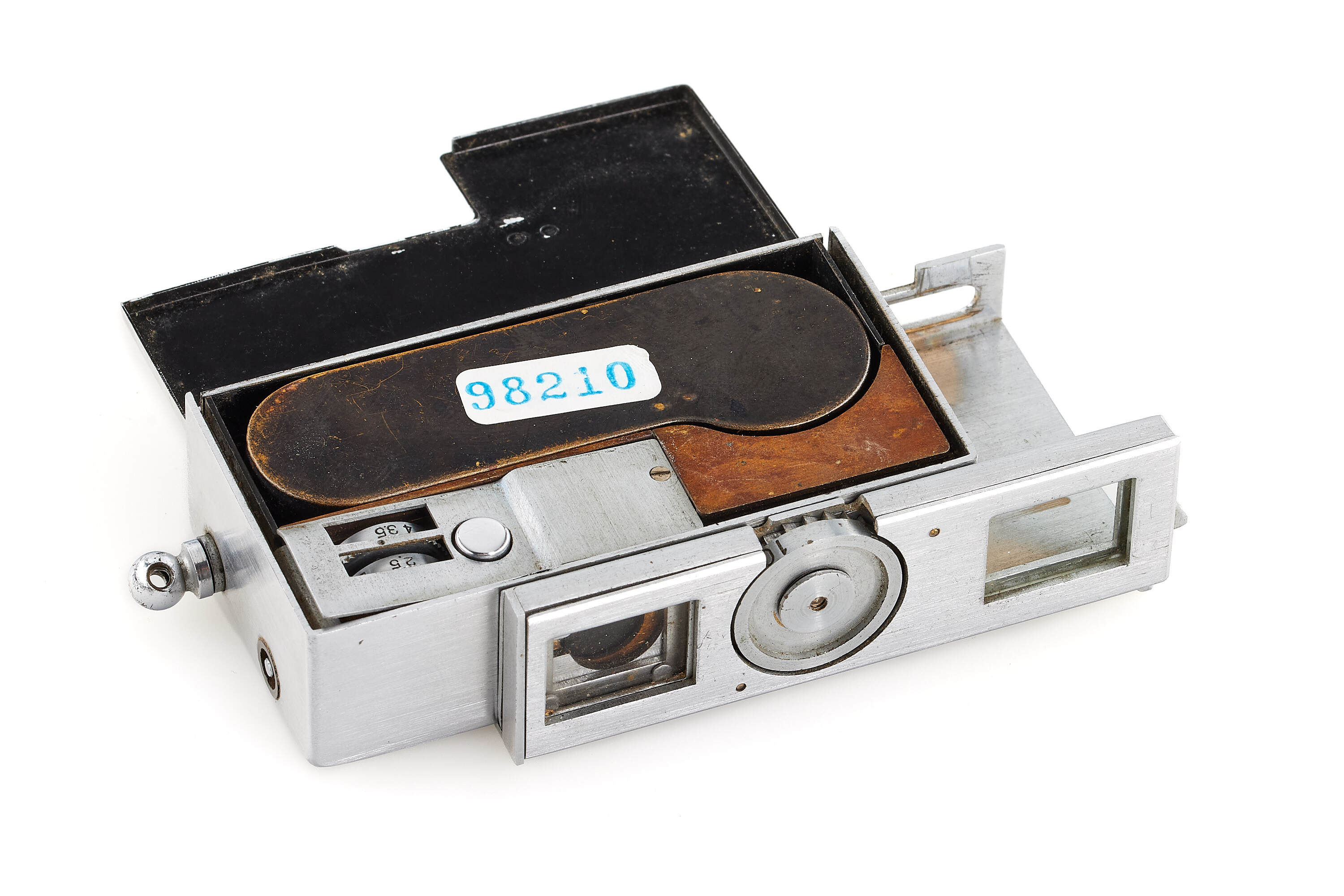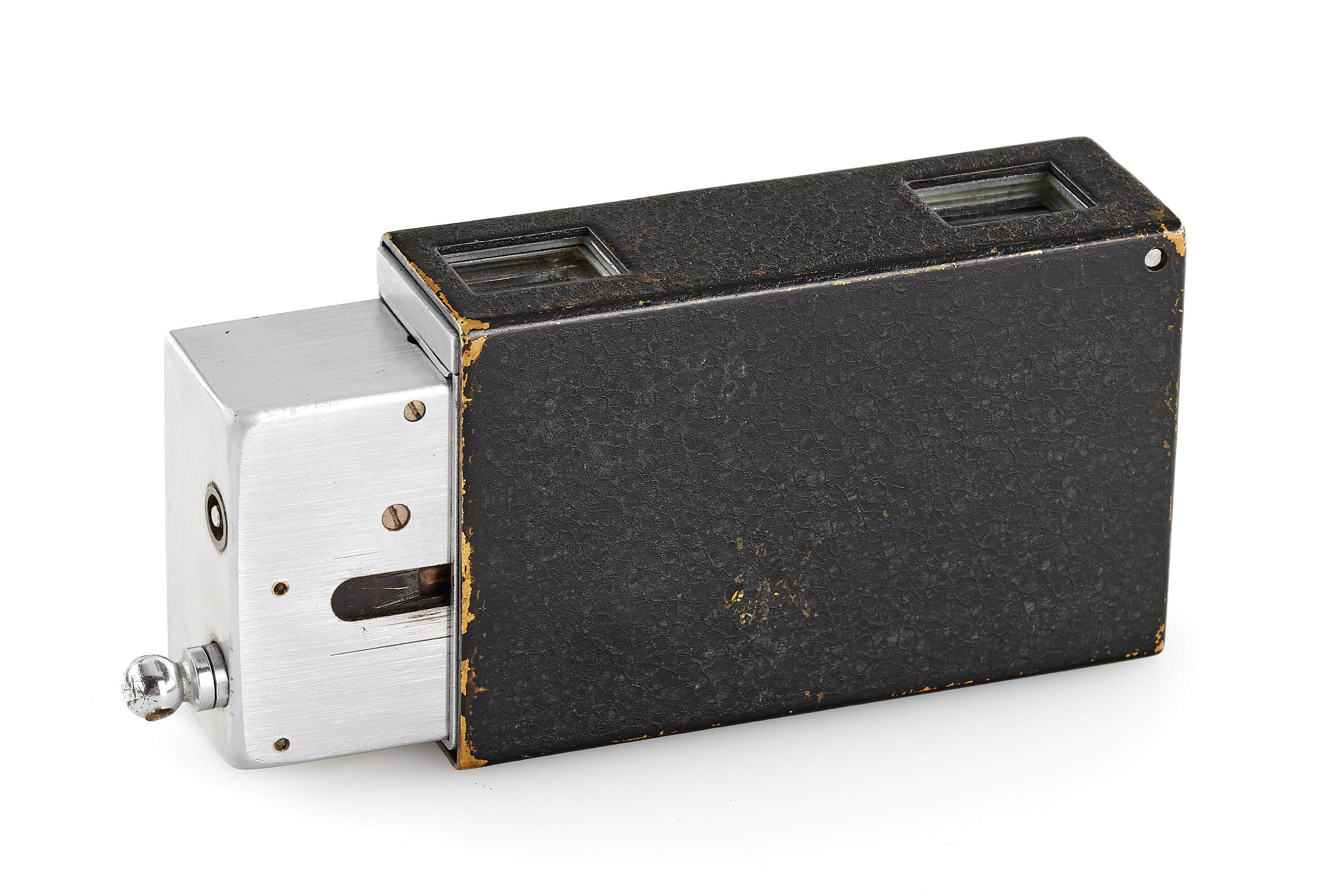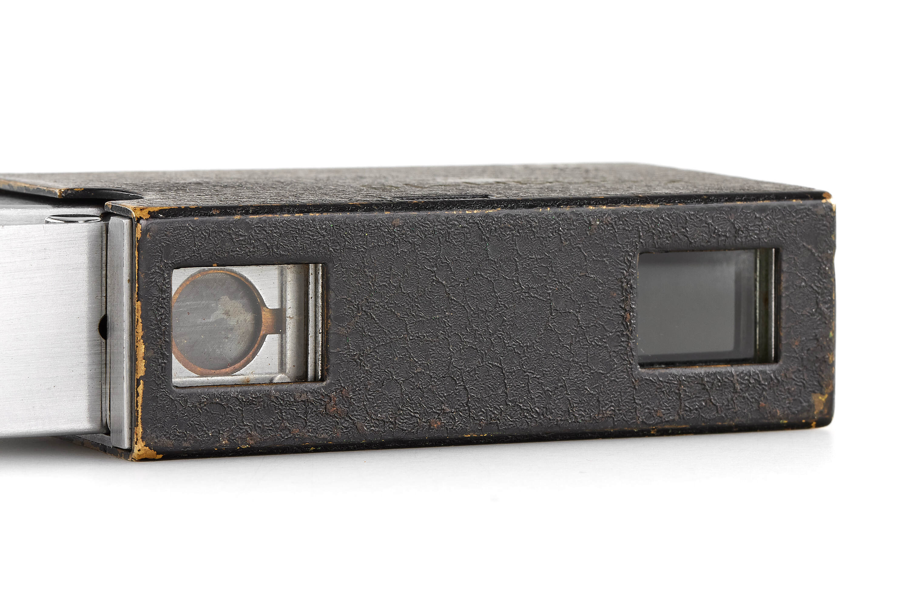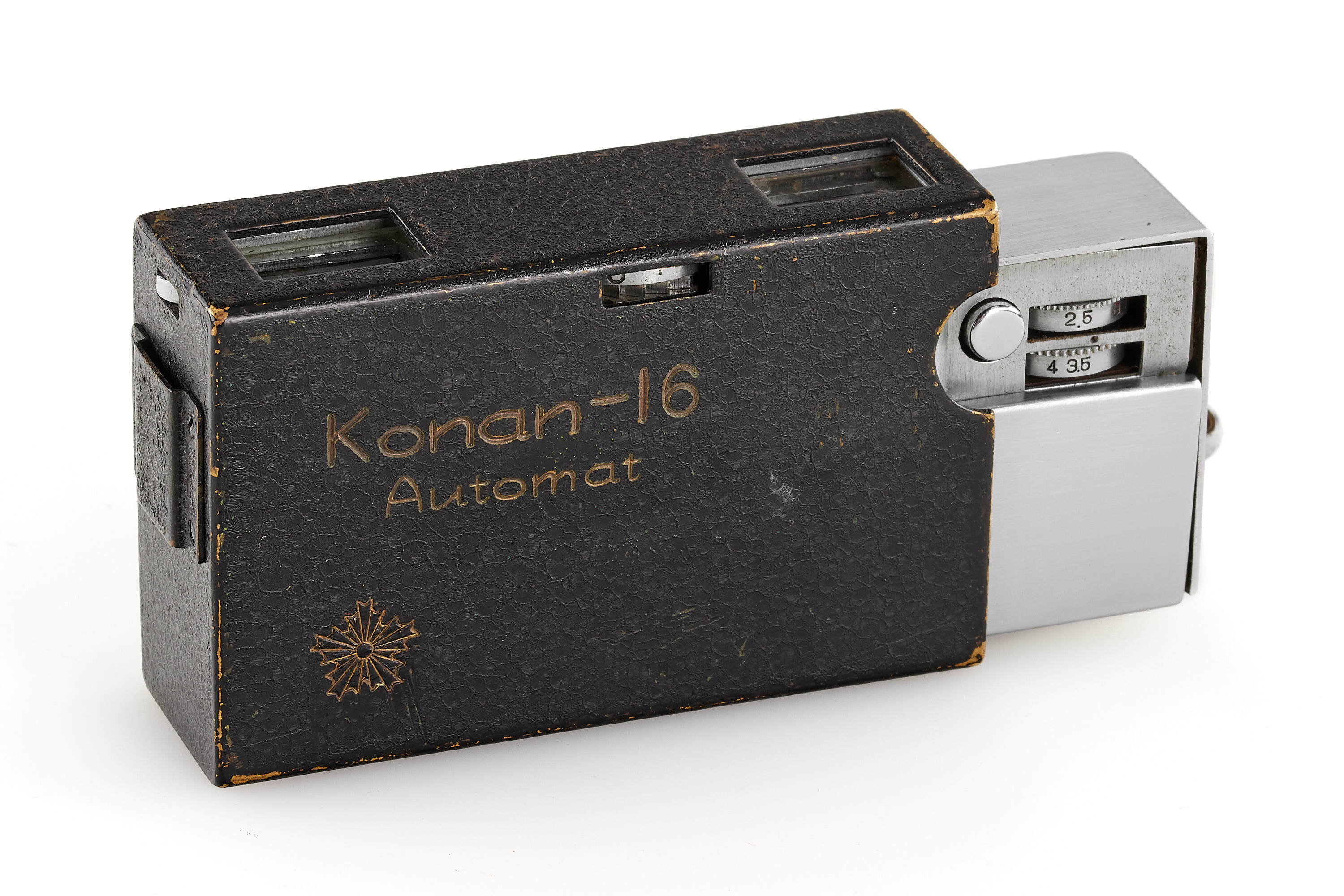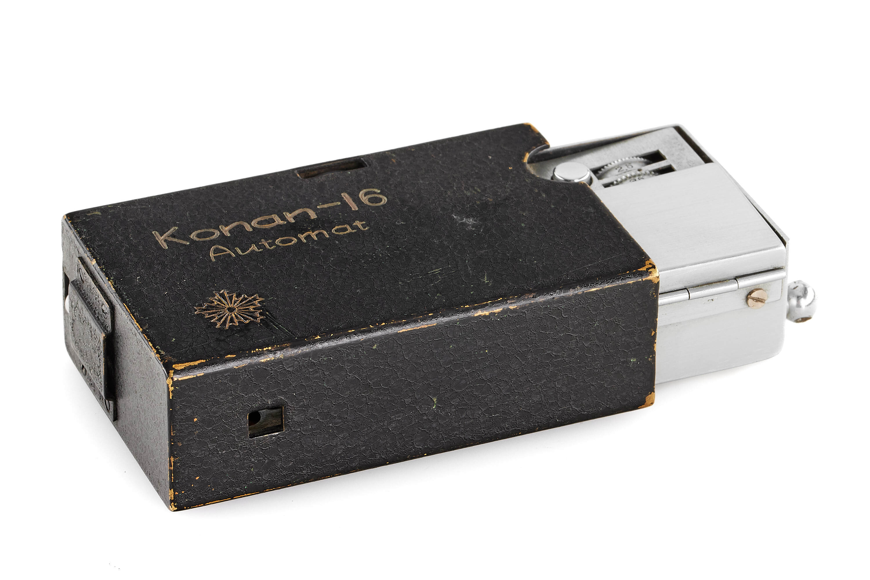 Rare black version of the Konan 16 camera (precursor of the Minolta 16), made by Chiyoda for the Japanese police, engraved with 'Asahikage', which is a stylised sun with rays - a symbol of Japanese police. In excellent condition, with wrist strap.