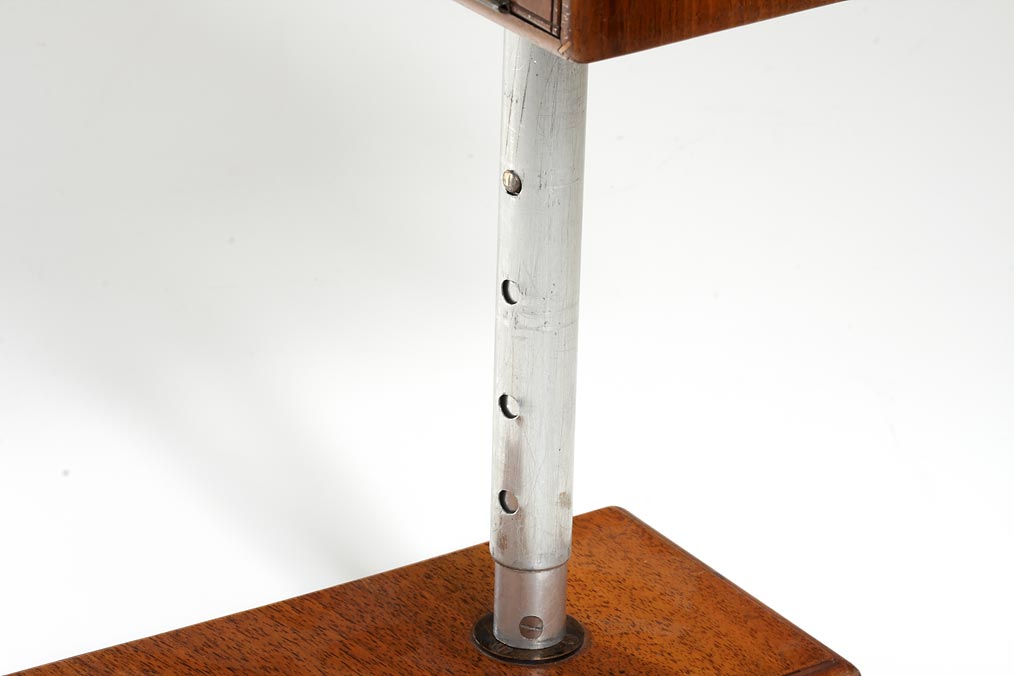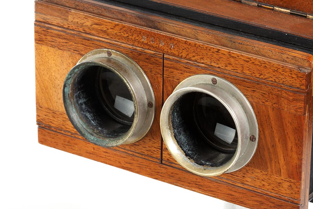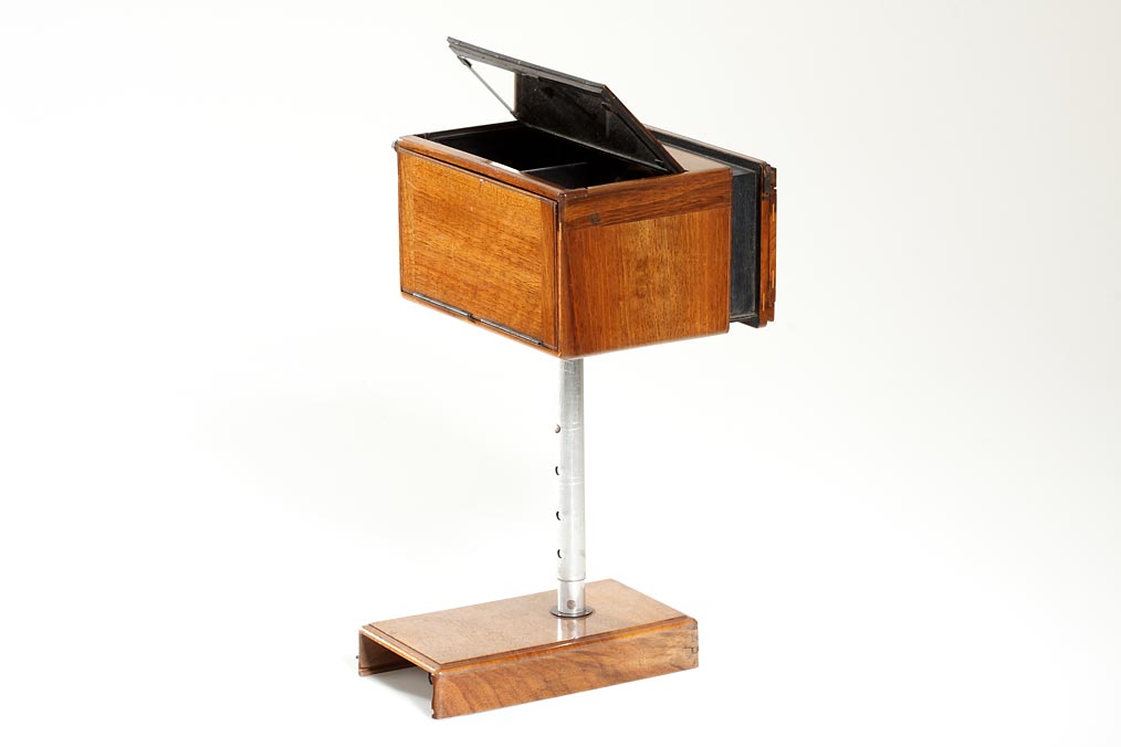 deliberatly functional box-shaped stereoscope made of wood, unknown maker, when not in use the viewer and its stand are concealed in a perfect transportation case with a leather carrying handle, the scope is mounted on an extendable aluminium tube for viewing and the box lid serves as the base of the stand, large diameter lenses with adjustable eye-base, rack and pinion foucus, two hinged mirrors.