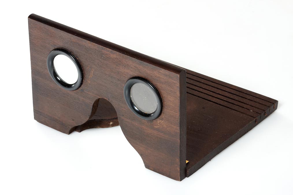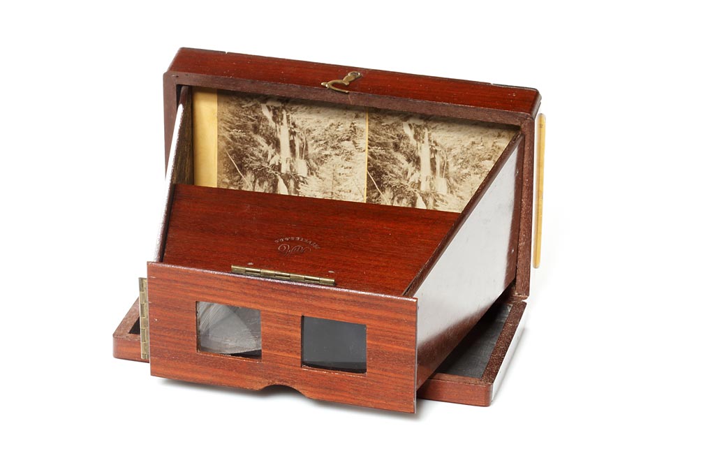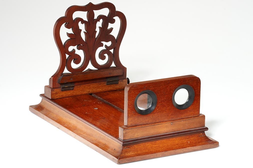 handpicked compilation of six turn-of-the-Century stereoscopes, for different formats, all collapsible and made of wood, (1) unlabeled stereographoscope, very likely made in England or the US around 1890, the detachable wooden lens holder is mounted on a sliding base to adjust the focus, the carved cardholder is hinged and can be folded onto the base, in good condition, (2) Wheeler & Bazin (Boston) folding 'Bellvue' viewer, ingenious design, made of walnut with silver plated metal parts, a classical stereoscope with the characteristic turned wooden oculars, (3) early folding Brewster viewer made of fruit wood, the solid sides and the lens board are hinged to allow the viewer to be folded into a box, in good and working condition, (4,5,6) three simple folding scopes of unknown origin, all in good condition, every piece with nice individual details. (6)
