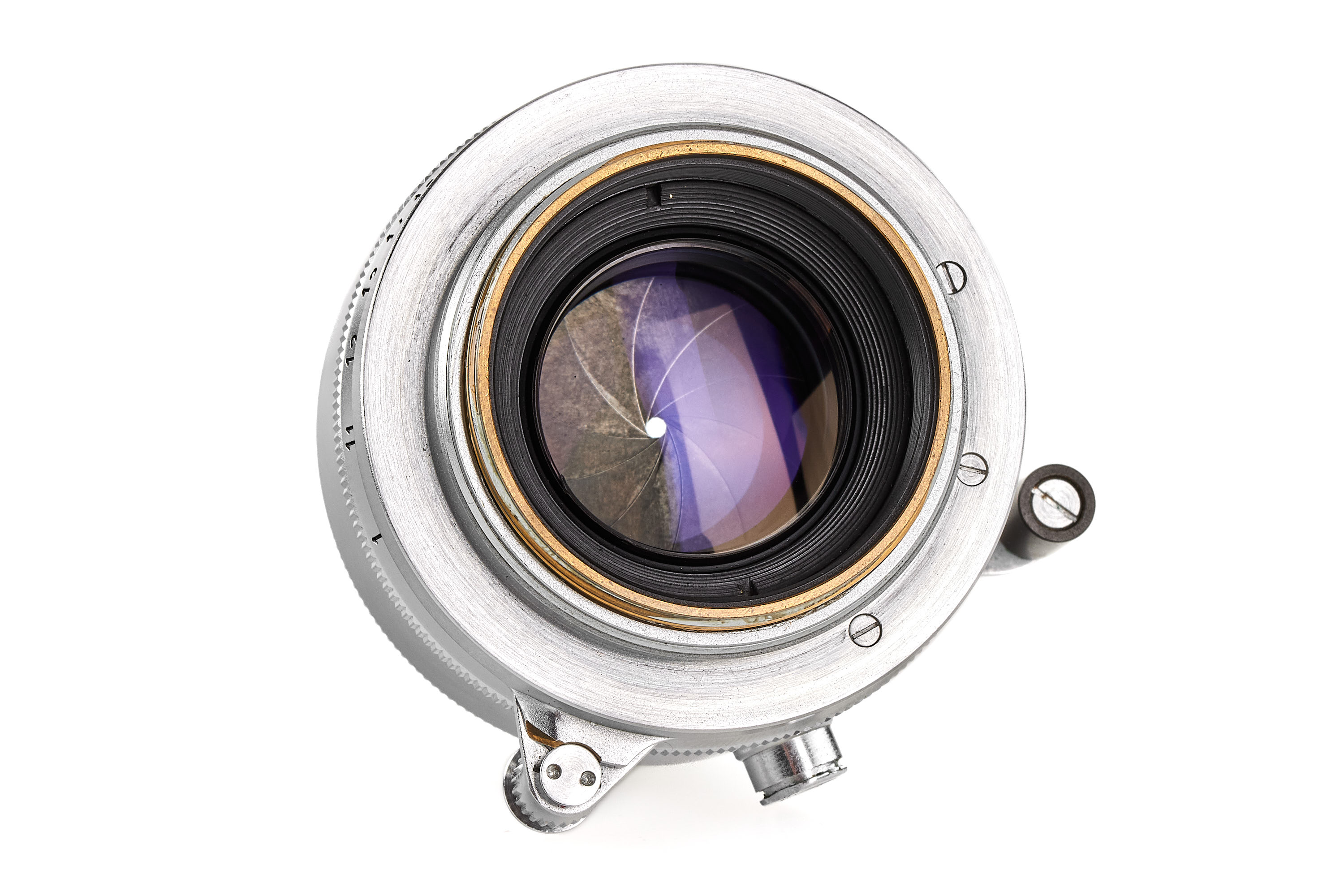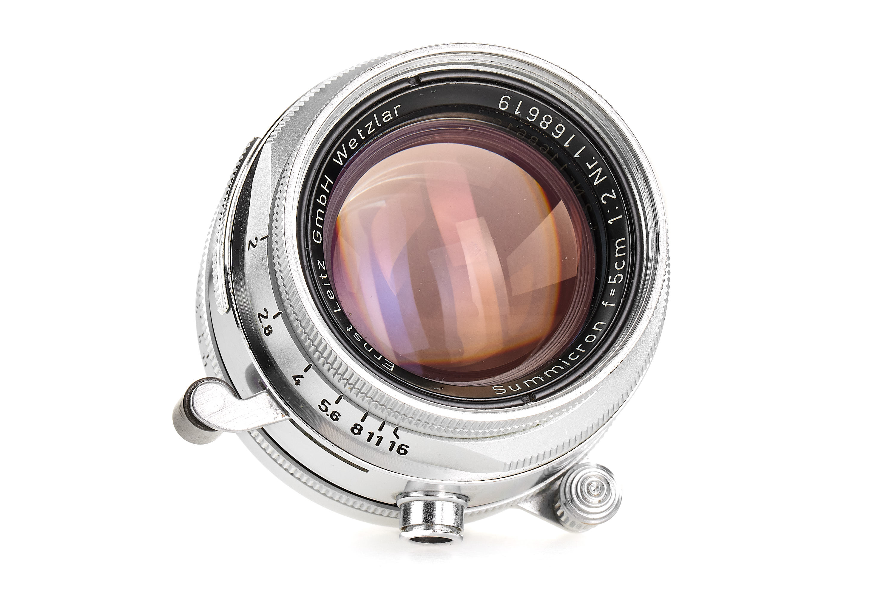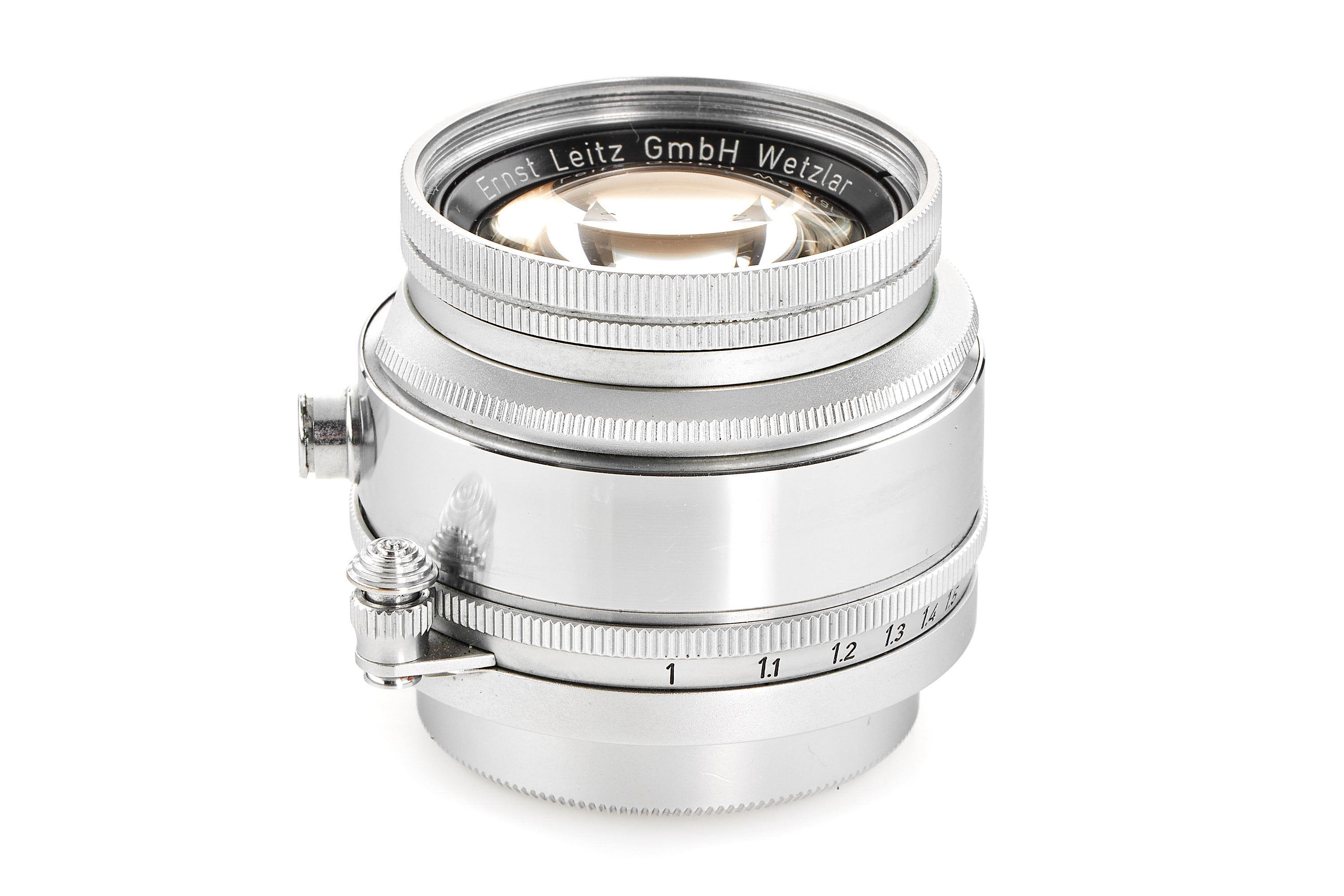 Very rare Summicron with built-in Compur shutter, flash-synchronisation for 1/100 + 1/200 sec., meter scale, engraved 'Germany', in near-mint condition, optics with light cleaning marks on the front element, with both caps, only around 150 of these lenses have been made, hard to find in this good condition!