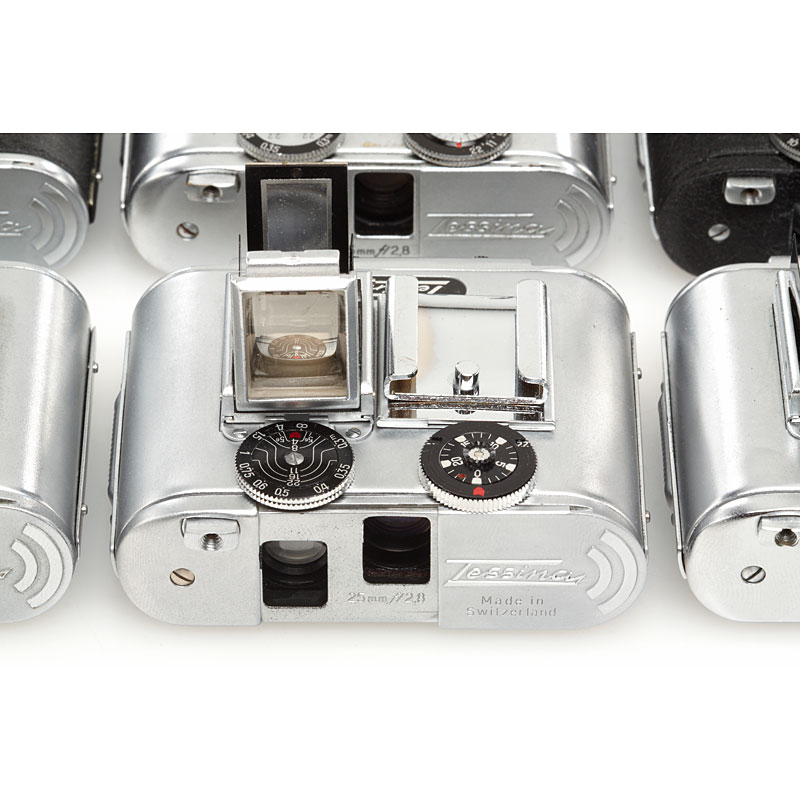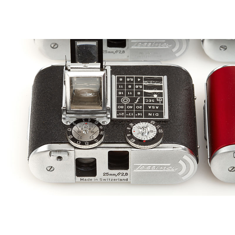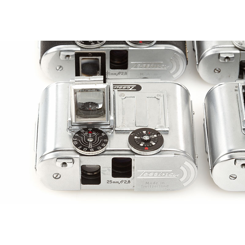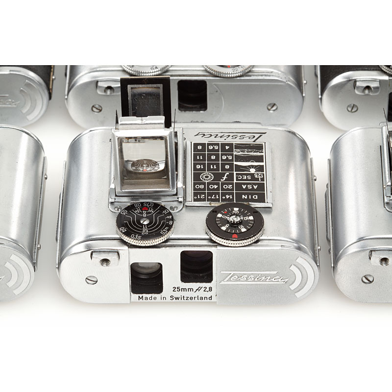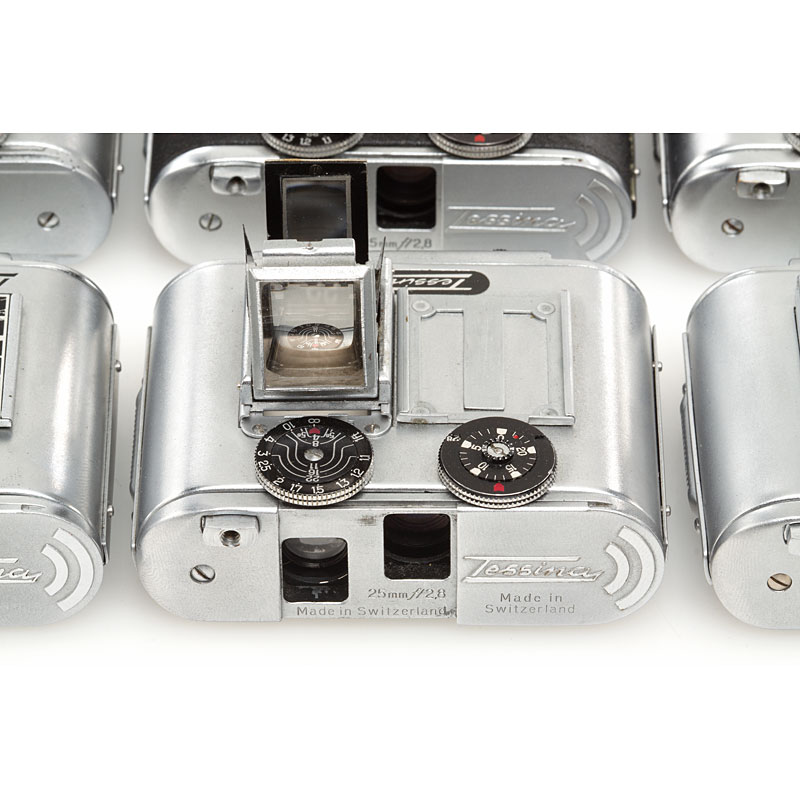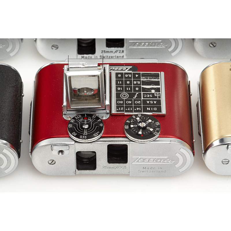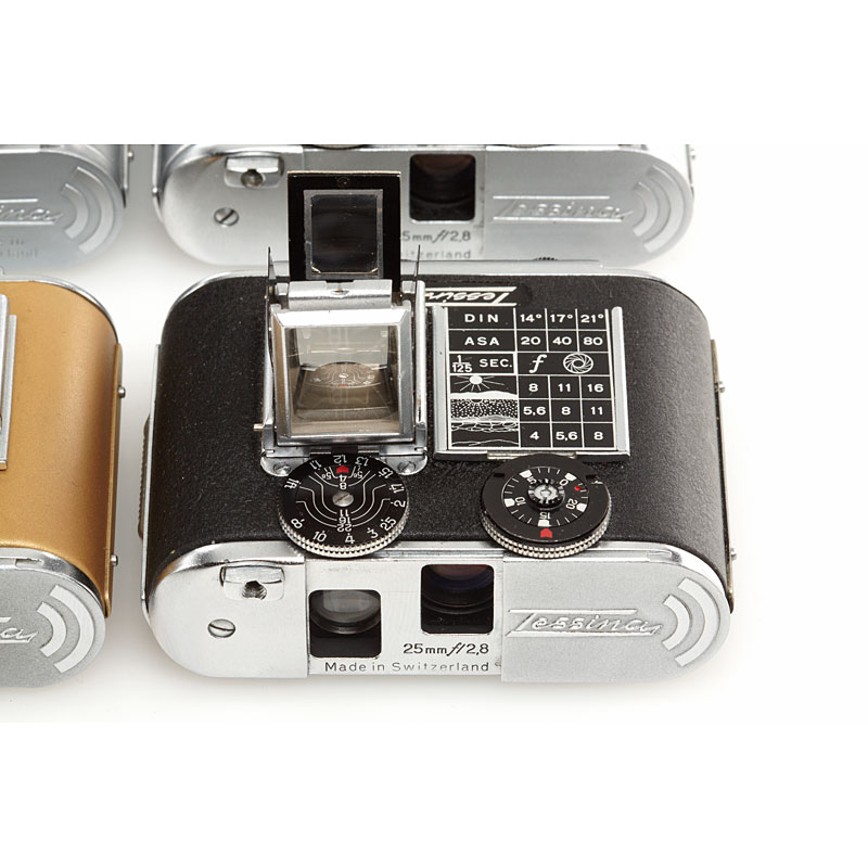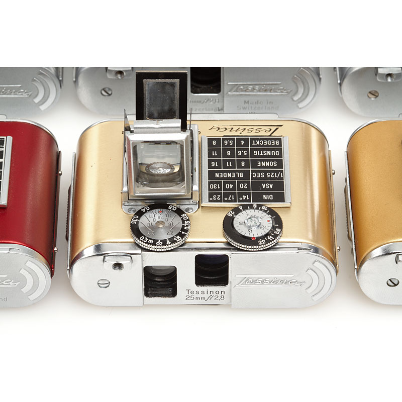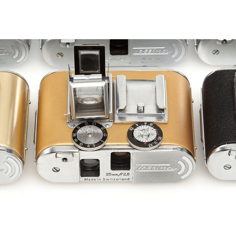 extensive collection including 19 Tessina cameras (all different), various accessories and related items: (1) golden Tessina no.163243 without type markings (cond. A-, maker's box), (2) black Tessina no.61735 without type markings (cond. A-, maker's box), (3) black Tessina 35 no.465770 (cond. A-, maker's box), (4) chrome Tessina 35 no.665538 (cond. A/B, maker's box), (5) Tessina automatic 35mm no.59088 (cond. A-, maker's box), (6) satin chrome Tessina automatic 35mm no.60239 (cond. A-, maker's box), (7) satin chrome Tessina automatic 35mm no.62595 (cond. B), (8) chrome Tessina automatic 35mm no.61846 (cond. B), (9) chrome Tessina automatic 35mm no.363664 (cond. A/B, maker's box), (10) chrome Tessina automatic 35mm no.464178 (cond. A/B, maker's box), (11) red Tessina L no.802050 (cond. A-, maker's box), (12) chrome Tessina L no.166391 (cond. A-), (13) chrome Tessina L no.565453 (cond. A/B), (14) chrome Tessina L no.767475 (cond. B+), (15) satin chrome Tessina L no.777974 (cond. B+, no finder), (16) satin chrome Tessina L no.785016 (cond. A-), (17) black Tessina L no.765583 (cond. A-), (18) black Tessina L no.767465 (cond. B/A), (19) very rare all-black Tessina L no.767961 (cond. A-), 3 cameras with viewfinder magnifier, extremely rare chrome mechanical Tessina watch (working) with plate to attach onto Tessina cameras, chrome Pentaprism viewfinder (cond. A-, maker's box), black Pentaprism viewfinder (cond. A-, maker's box), 2 8x magnifier (one with maker's box, other with separation), 3 chrome exposure meters (2 operable), 2 all-black exposure meters (both operable), 1 black/chrome exposure meter (not operable), Metraphot 2 exposure meter (working) with adapter plate for Tessina cameras (case, instructions), 6 wrist-straps (5black, 1 brown), 3 tripod adapter plates with chain, green filter, 19 instruction books (German, English, French, Italian), 29 spools (24 in metal containers), 6 film loaders in cases, 16 case