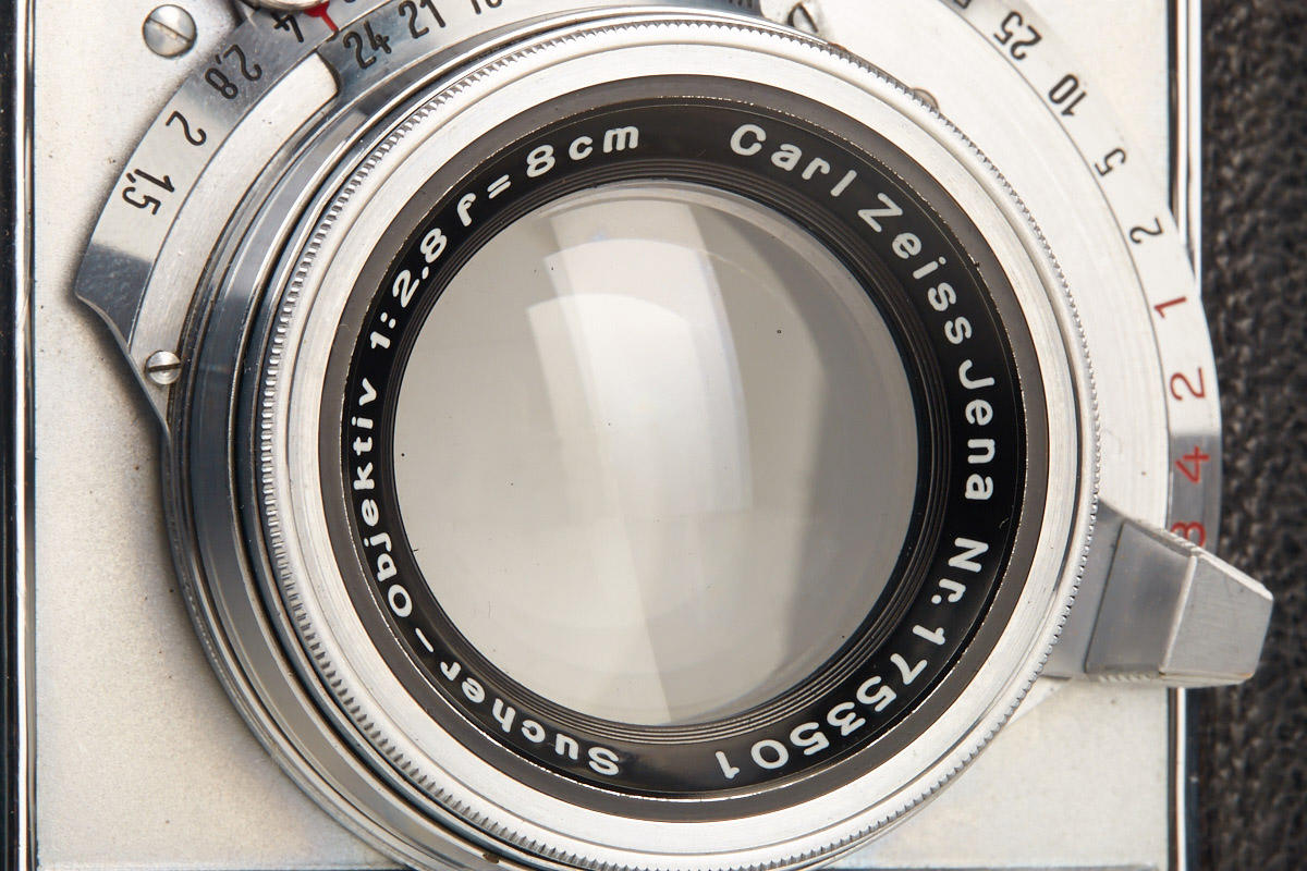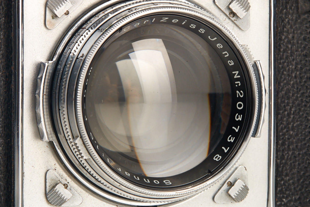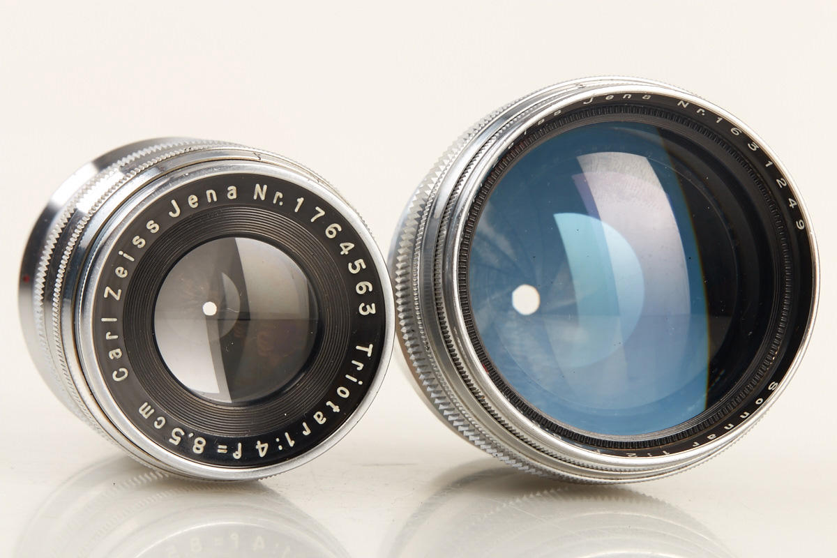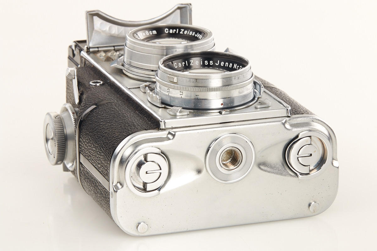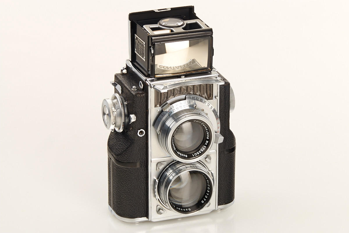 35mm TLR with Sonnar 1.5/5cm no.2037378 in very fine condition and good working order (meter is not operable as usual), back door with matching serial number, cap, everready case, Sonnar 2/8.5cm no.1631249 (clean lenses, cap), rare Triotar 4/8.5cm no.1764563 (clean lenses, cap, keeper)