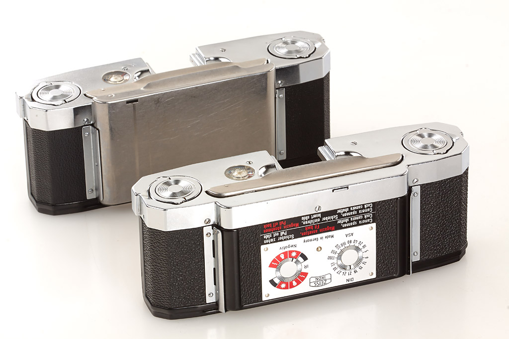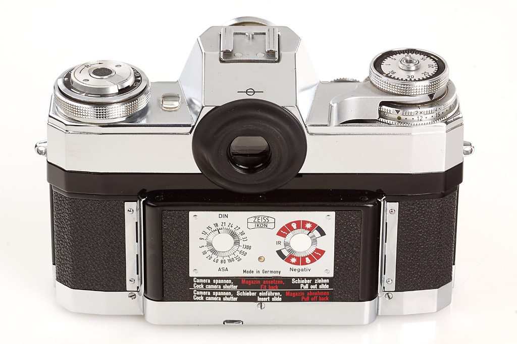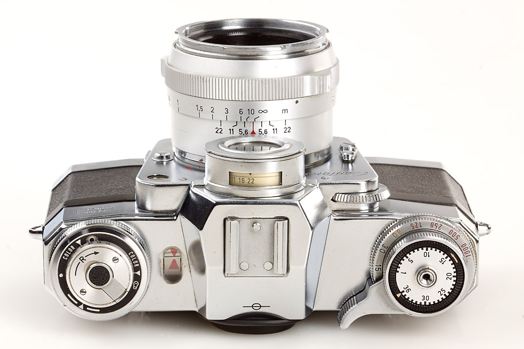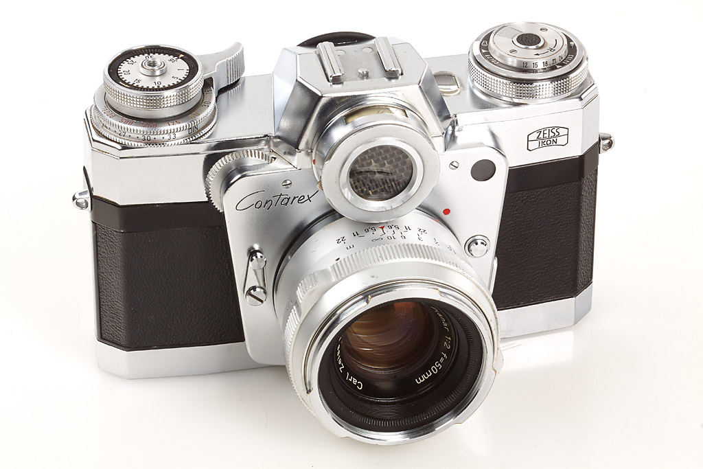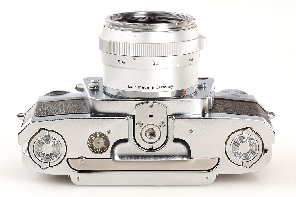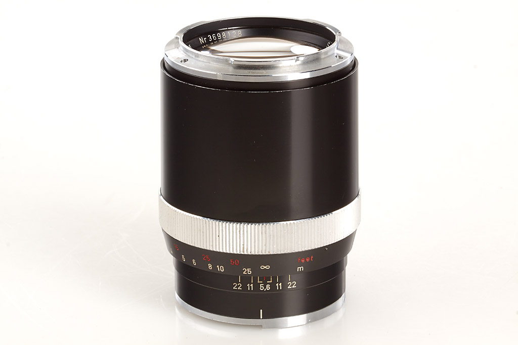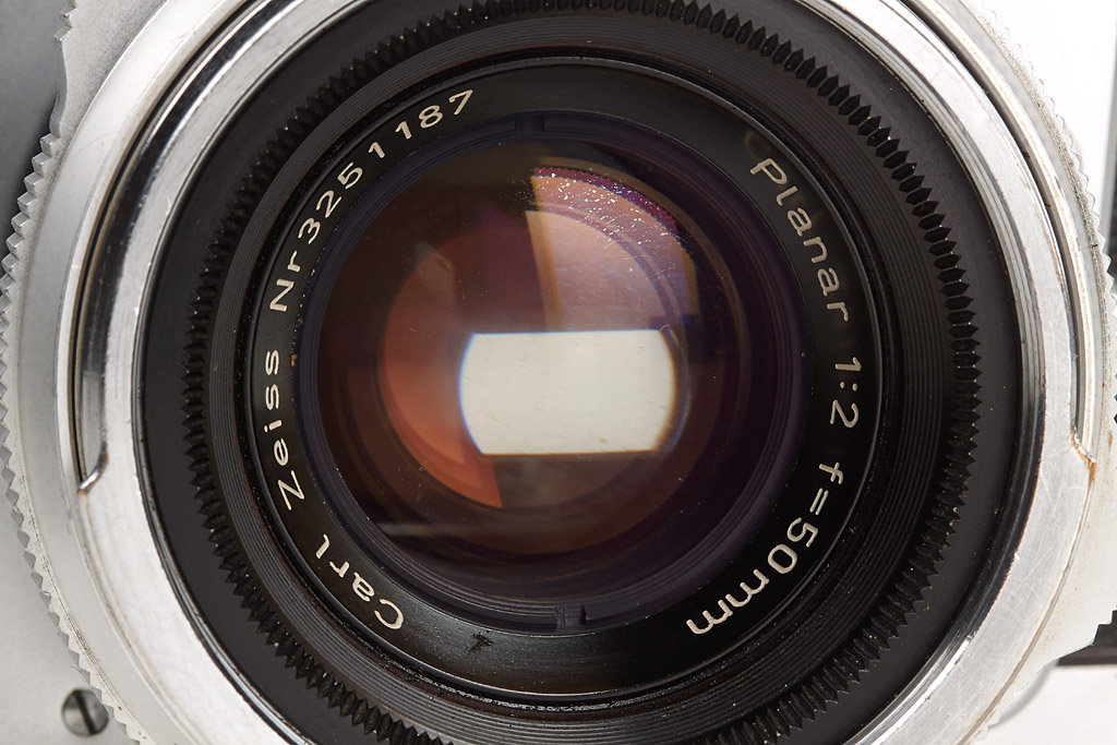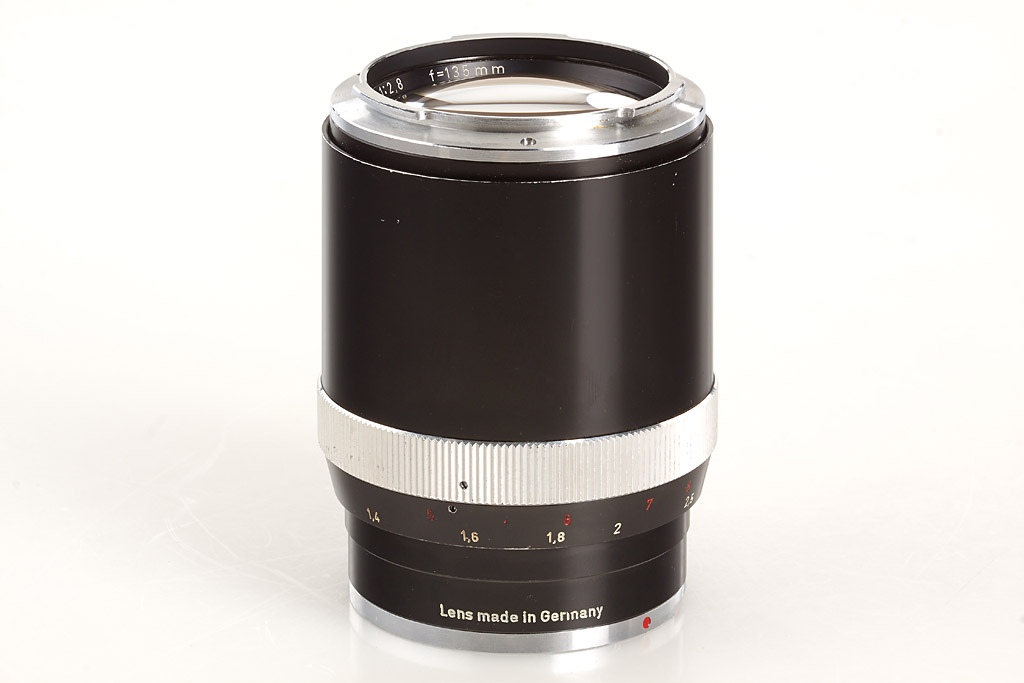 near mint and in good working order (meter not accurate) with chrome Planar 2/50mm no.3251187 (good lenses, cap, chrome hood), everready case, black Sonnar 2.8/135mm no.3698128 (small cleaning marks), 4 filters, two magazines, lens case