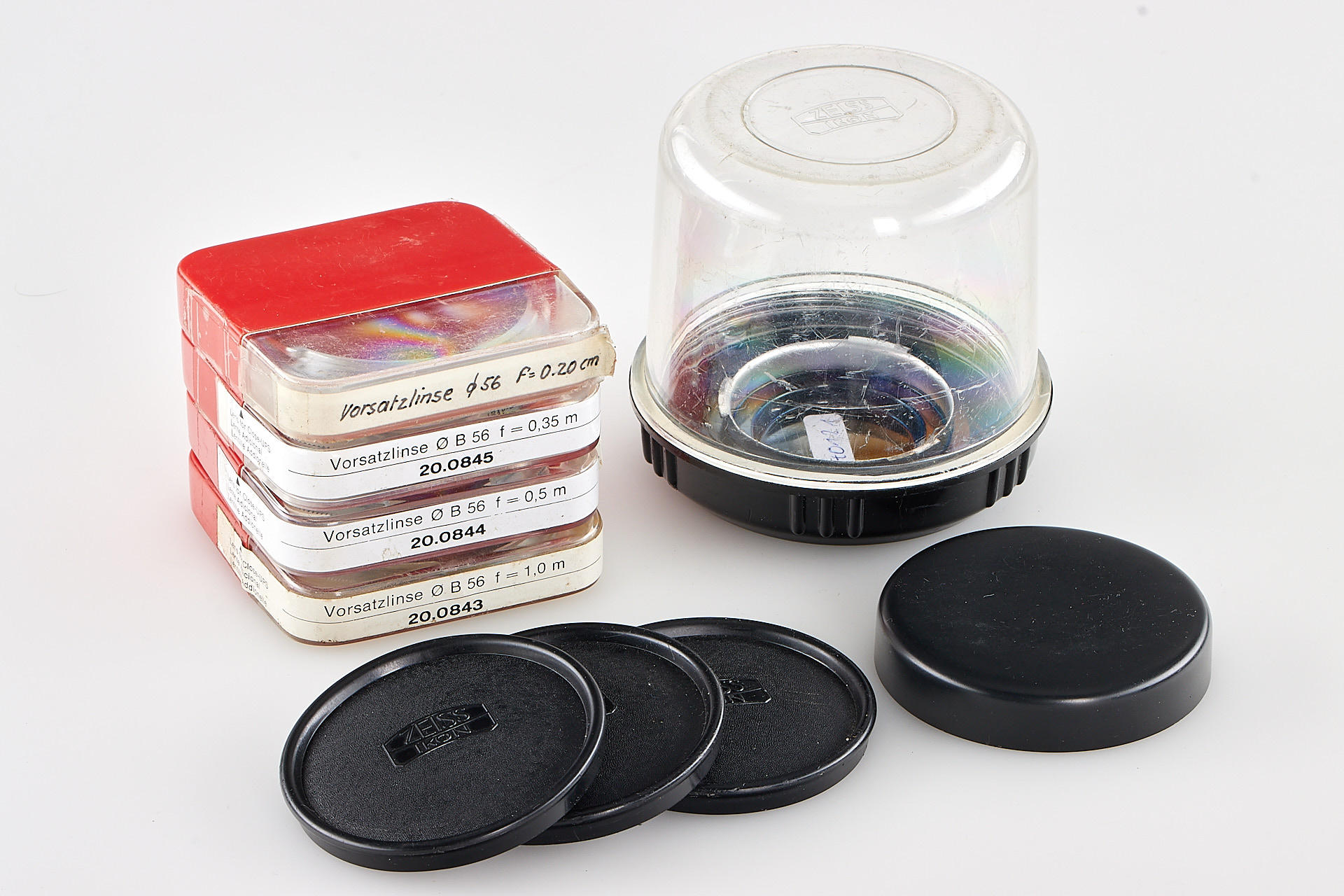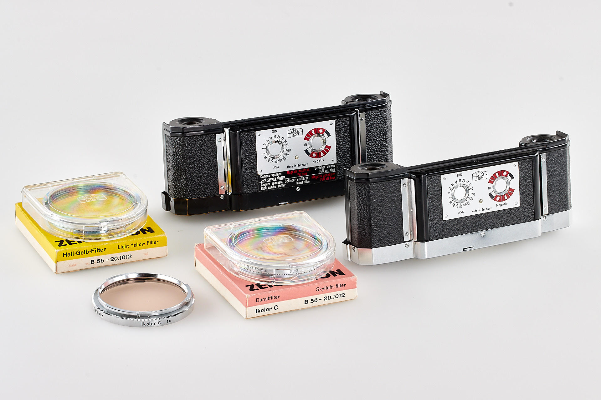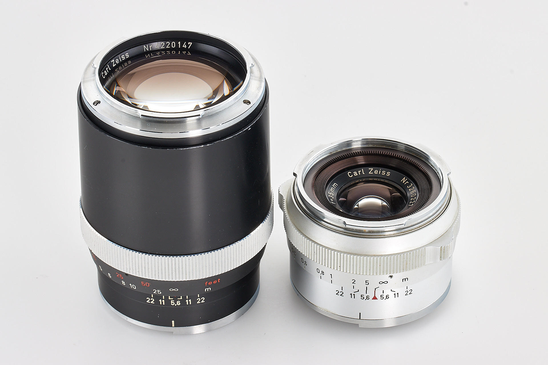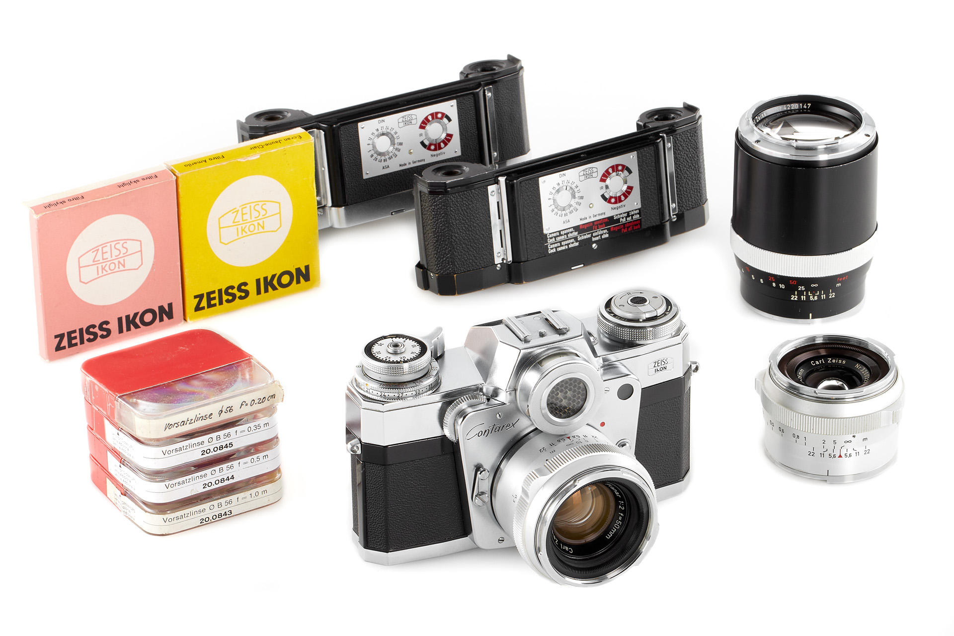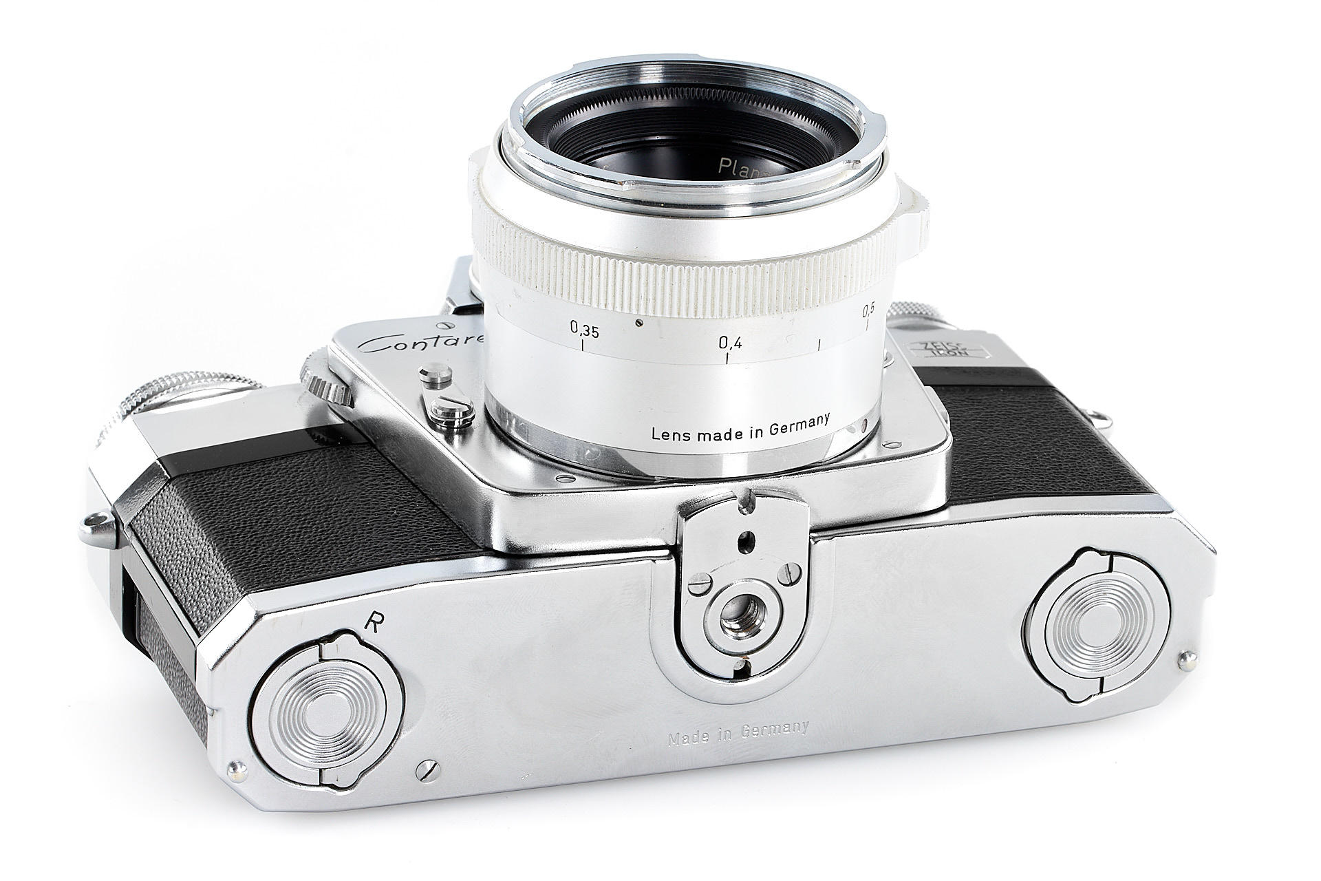 late version in mint condition and working order, with Distagon 4/35mm no.3260227 (cap and plastic keeper) showing some separation, Planar 2/50mm no.3246876 (front cap) only showing some haze, Sonnar 2.8/135mm no.4220147 (front cap), 3 filters, set of 4 Protar lenses, 1 chrome and 1 black additional magazines