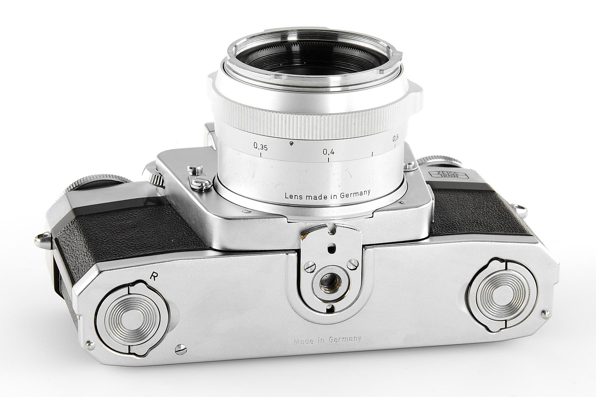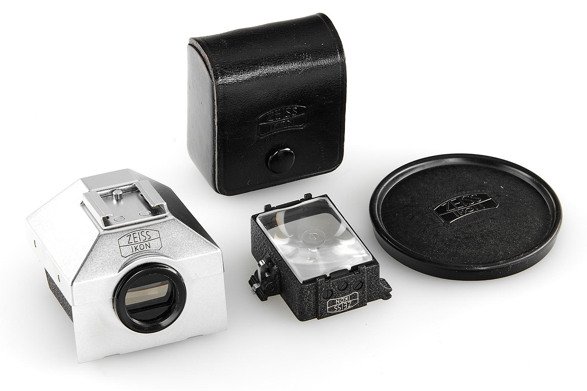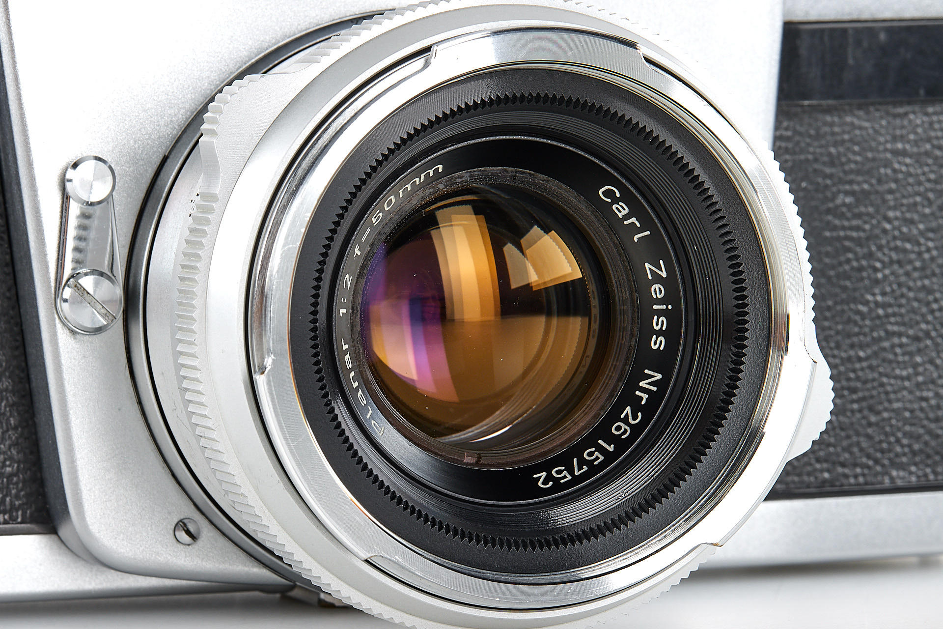 Rare body in near mint condition, with waist-level viewfinder, Eye-level viewfinder, spare focusing screen in its leather case, with clean chrome Planar 2/50mm no.2615752 and original front lens cap