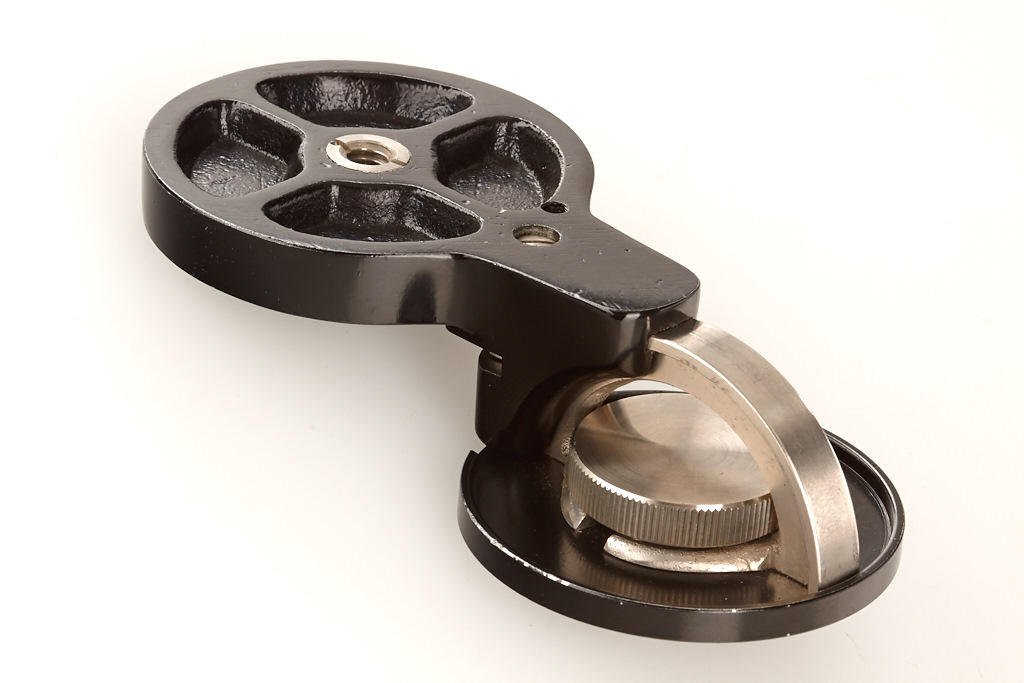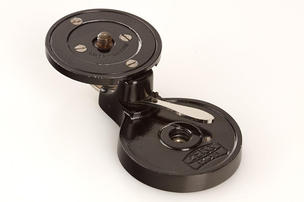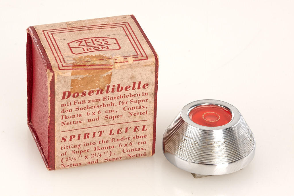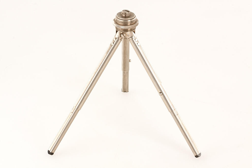 (1) rare black/nickel table tripod with chain in very fine original condition, (2) black/nickel tripod head with tilt, (3) rare chrome bubble level 888/1 in original maker's box