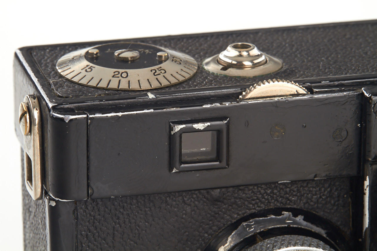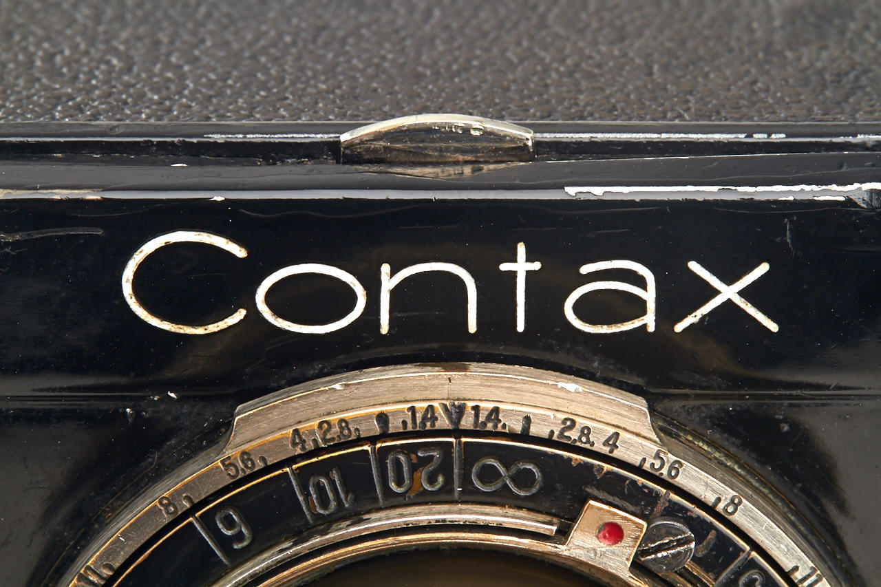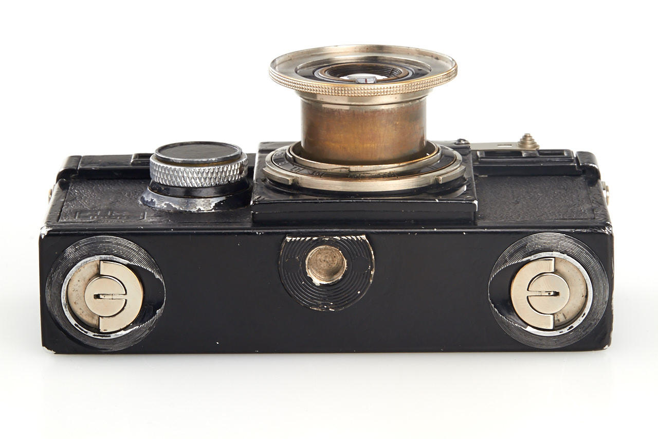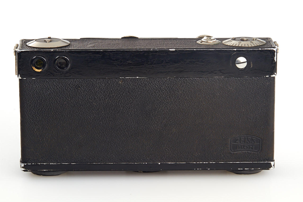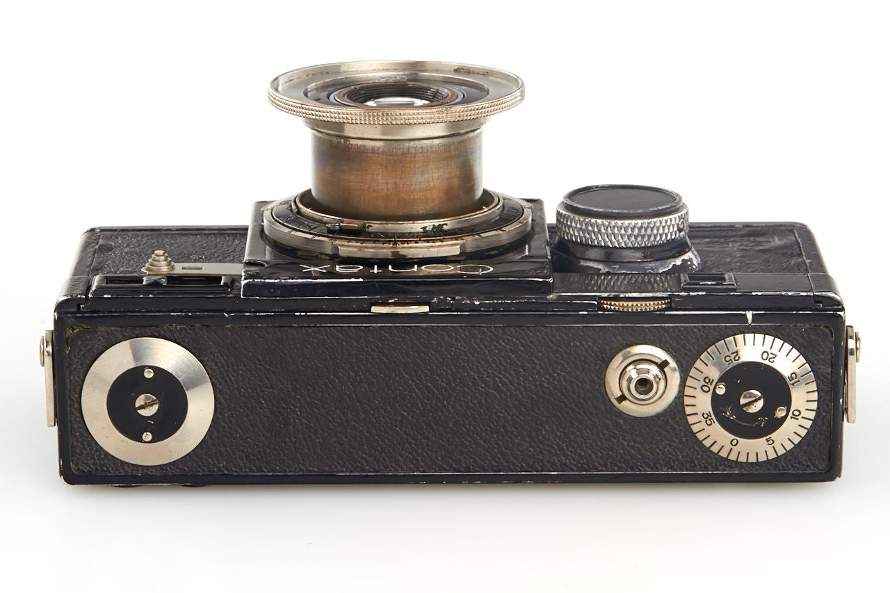 Formerly unknown prototype of the Contax I camera. The camera has no series number and differs in many details from the later series model Contax I. The main difference is that it was made for the exclusive use of the Zeiss daylight spool film (with paper leaders on both ends) and lacks any device for rewinding the film (what later became the rewinding knob is a flat disc that only allows for checking the film transport but is unsuitable for rewinding, and there is also no lever to disengage the film transport in the bottom of the camera back). The lens mount helicoid allows for near focussing up to 0,75m (as opposed to 0,8m in preseries and 0,9m in series models). The infinity stop release knob of the distance meter is situated centrally in the middle of the camera front (as opposed to its usual position next to the milled wheel of the coupled distance meter) and is differently shaped - it is broad and flat - while its function is exactly the same. There is no arrestor spring-catch for the lens, it seems that the lens was simply bayonetted into the mount without clicking home (the small screw that holds the lens in place must be a later addition). Unknown shape of the threaded shutter release button. The distance meter assembly is already of the series type (its mechanism is basically working, yet misaligned and needs repair). The shutter is running, but needs service as well. With unengraved Carl Zeiss Jena 5cm f/3,5 Tessar - sensational new discovery of a original and unique Contax I prototype!