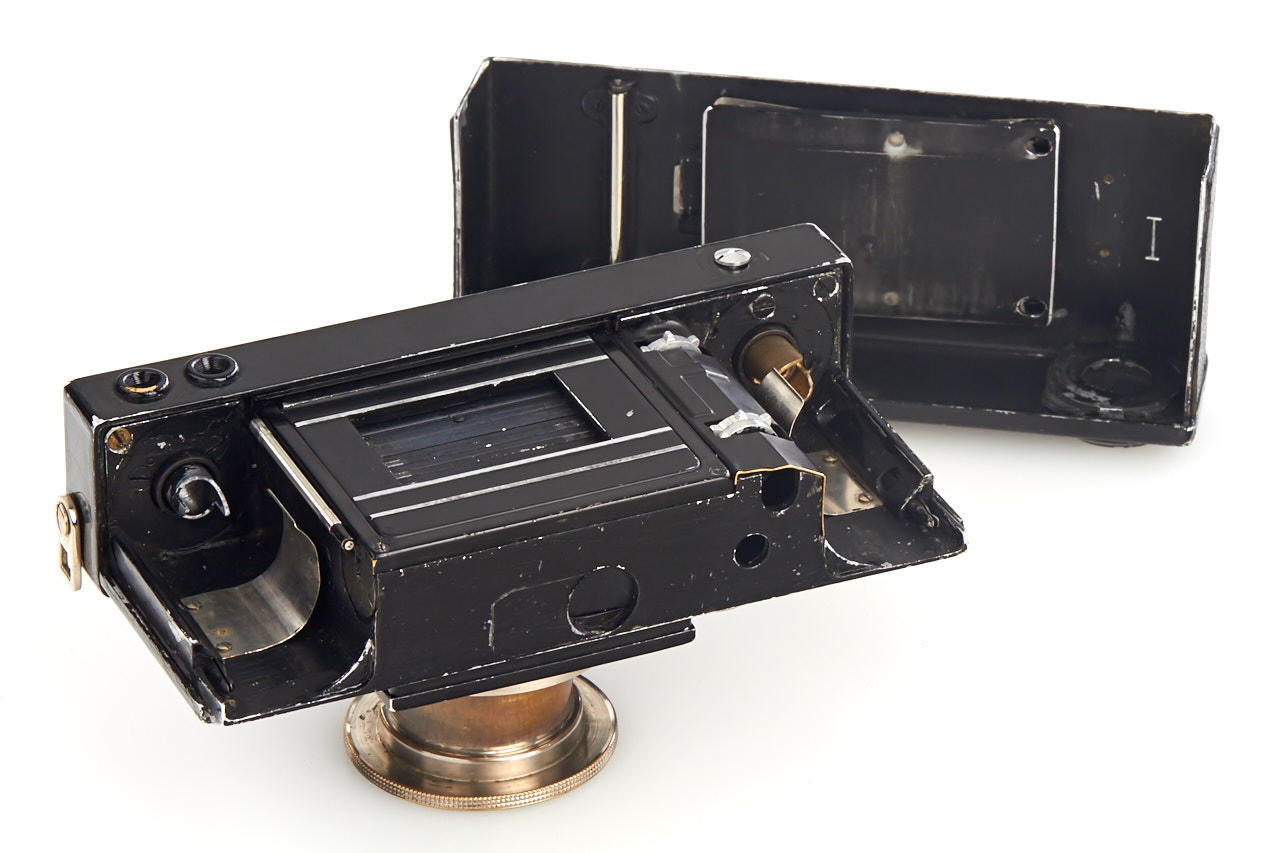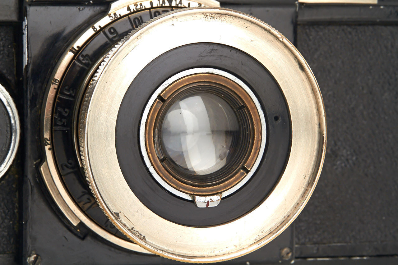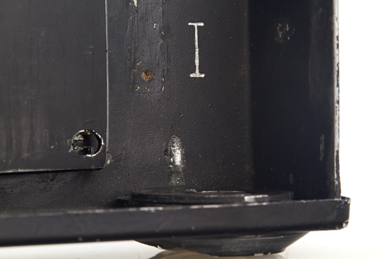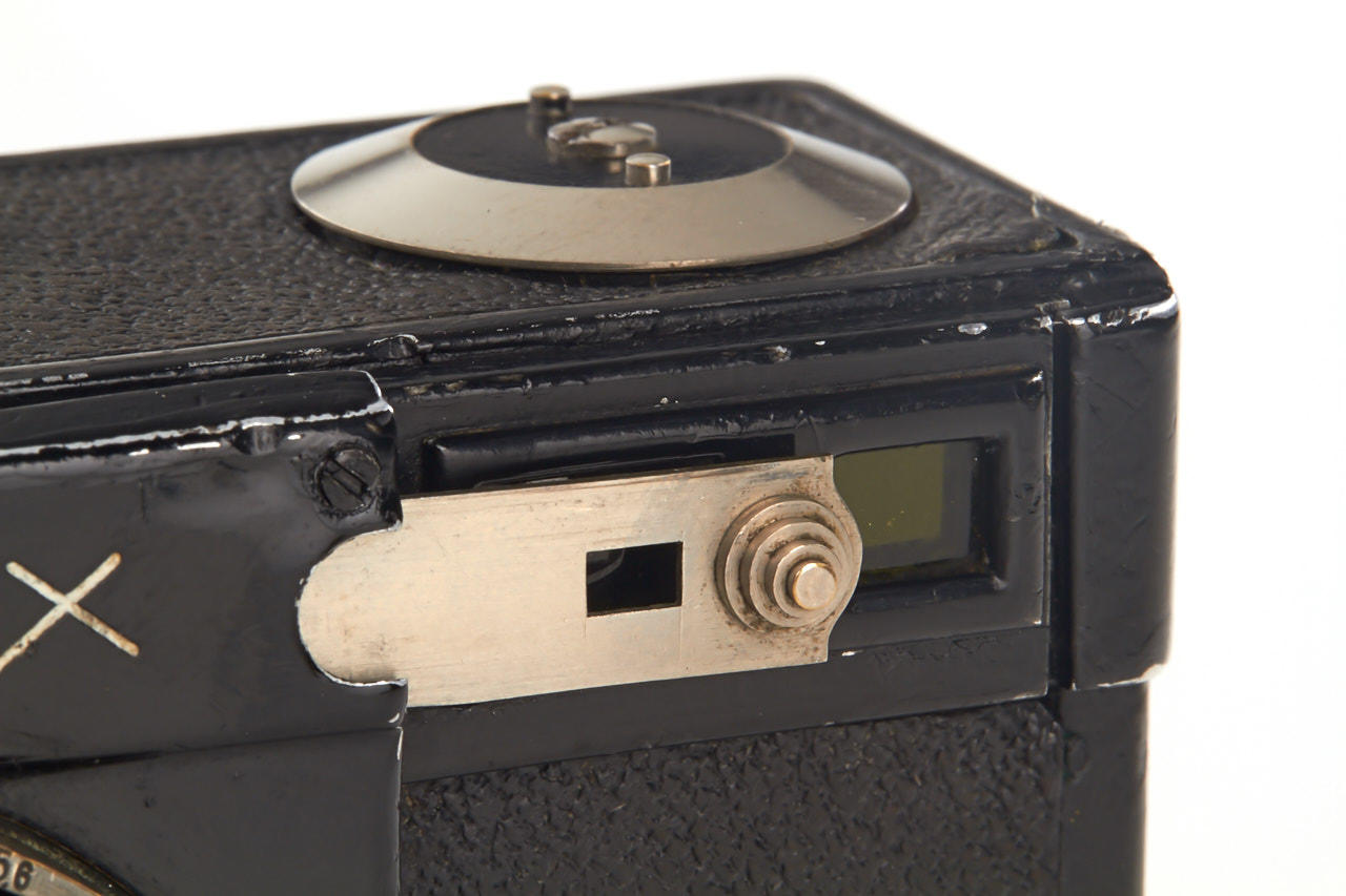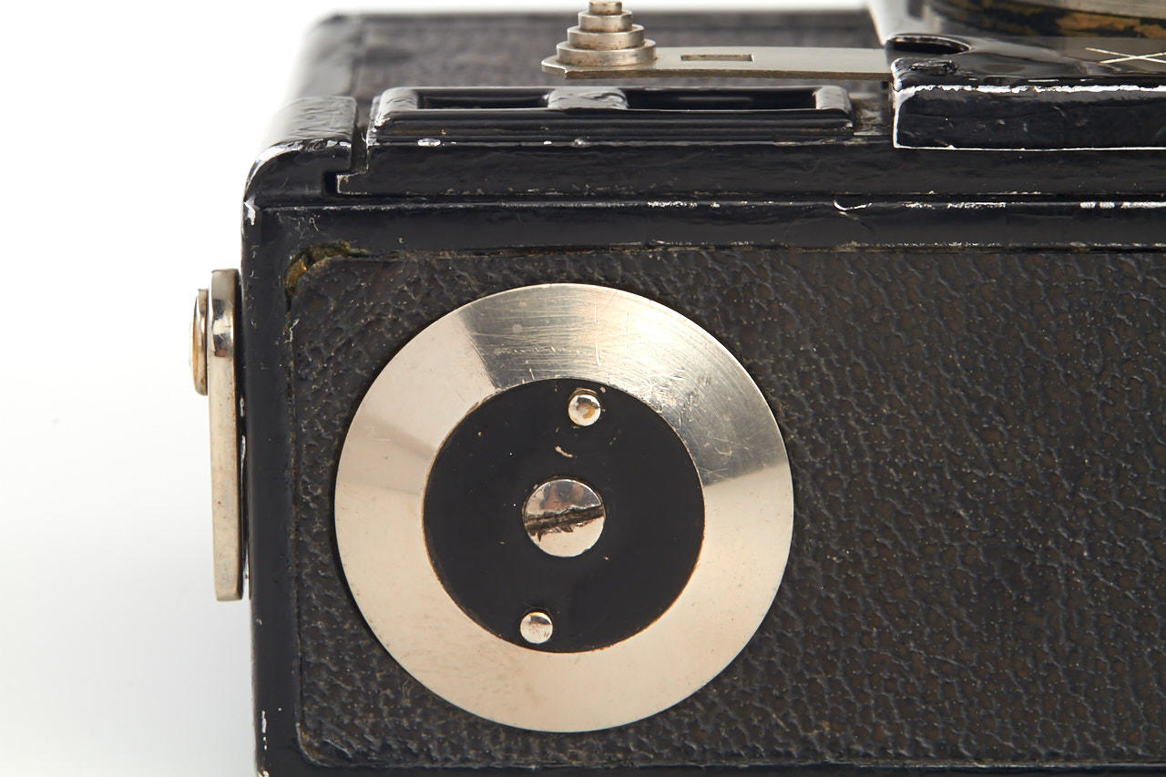 Formerly unknown prototype of the Contax I camera. The camera has no series number and differs in many details from the later series model Contax I. The main difference is that it was made for the exclusive use of the Zeiss daylight spool film (with paper leaders on both ends) and lacks any device for rewinding the film (what later became the rewinding knob is a flat disc that only allows for checking the film transport but is unsuitable for rewinding, and there is also no lever to disengage the film transport in the bottom of the camera back). The lens mount helicoid allows for near focussing up to 0,75m (as opposed to 0,8m in preseries and 0,9m in series models). The infinity stop release knob of the distance meter is situated centrally in the middle of the camera front (as opposed to its usual position next to the milled wheel of the coupled distance meter) and is differently shaped - it is broad and flat - while its function is exactly the same. There is no arrestor spring-catch for the lens, it seems that the lens was simply bayonetted into the mount without clicking home (the small screw that holds the lens in place must be a later addition). Unknown shape of the threaded shutter release button. The distance meter assembly is already of the series type (its mechanism is basically working, yet misaligned and needs repair). The shutter is running, but needs service as well. With unengraved Carl Zeiss Jena 5cm f/3,5 Tessar - sensational new discovery of a original and unique Contax I prototype!