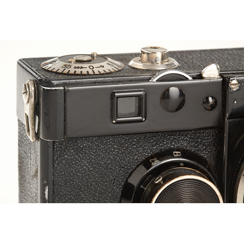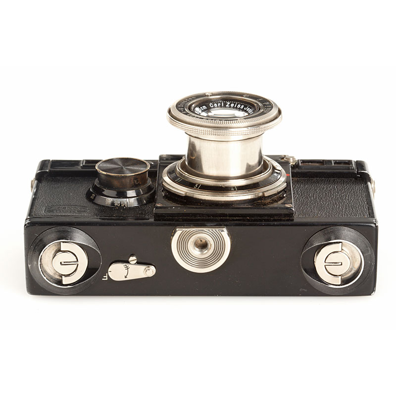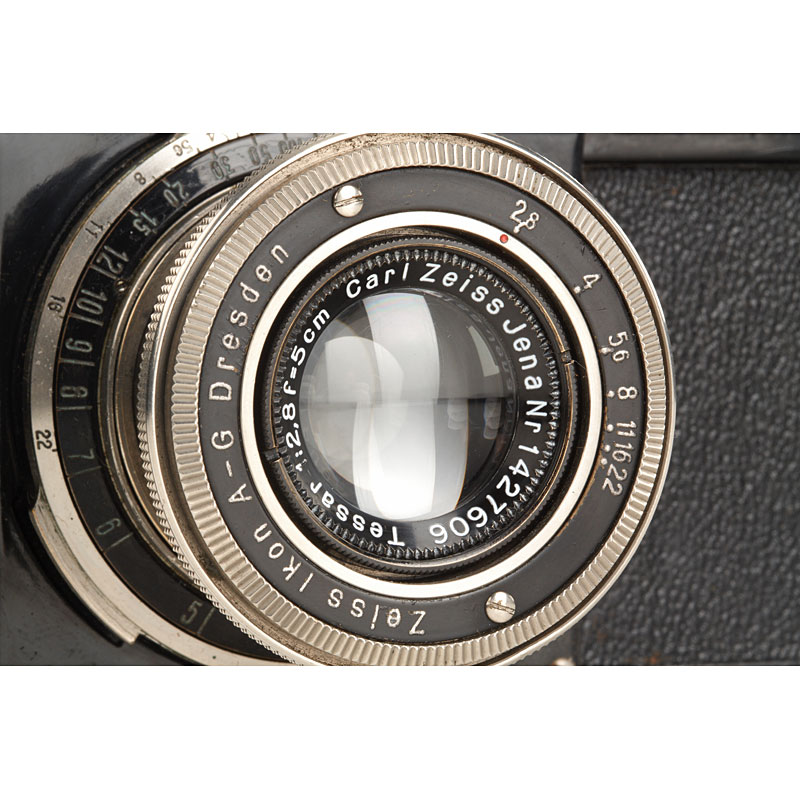 rare second version with two dimples in fine original condition with matching collapsible nickel Tessar 2.8/5cm no.1427606, 'Germany' engraved on back of top plate, matching serial number in back door, case