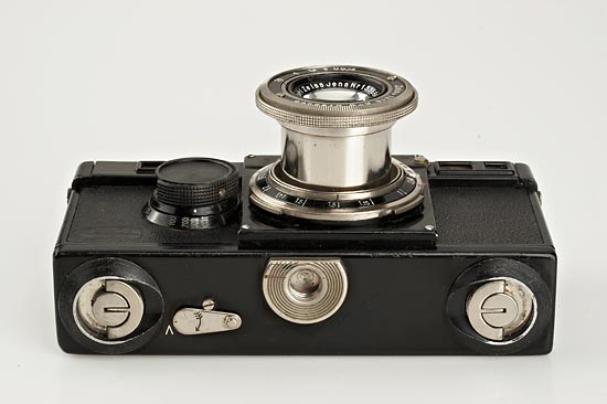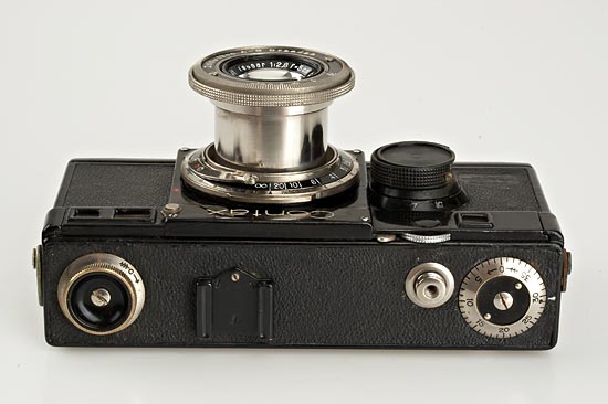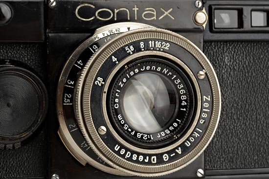 early Contax with one "dimple" in perfect working order , partly repainted, back with same number, matching Tessar 2.8/5cm no.1336841, case