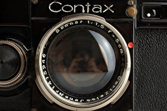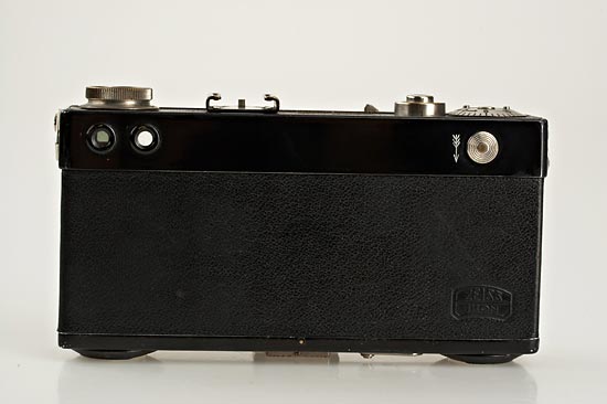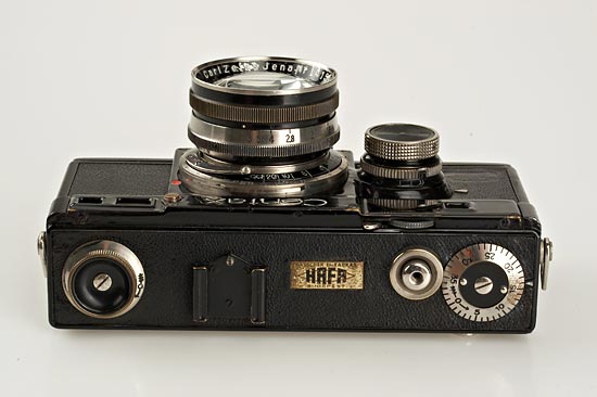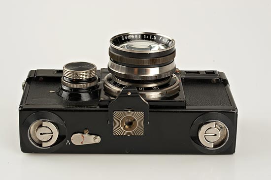 in excellent original condition, shutter works, back with same number, reseller label: "HAFA Hatschek G.Farkas Budapest", rigid Sonnar 1.5/5cm no.1415946, very rare ever-ready case for the camera with attached Helios light meter