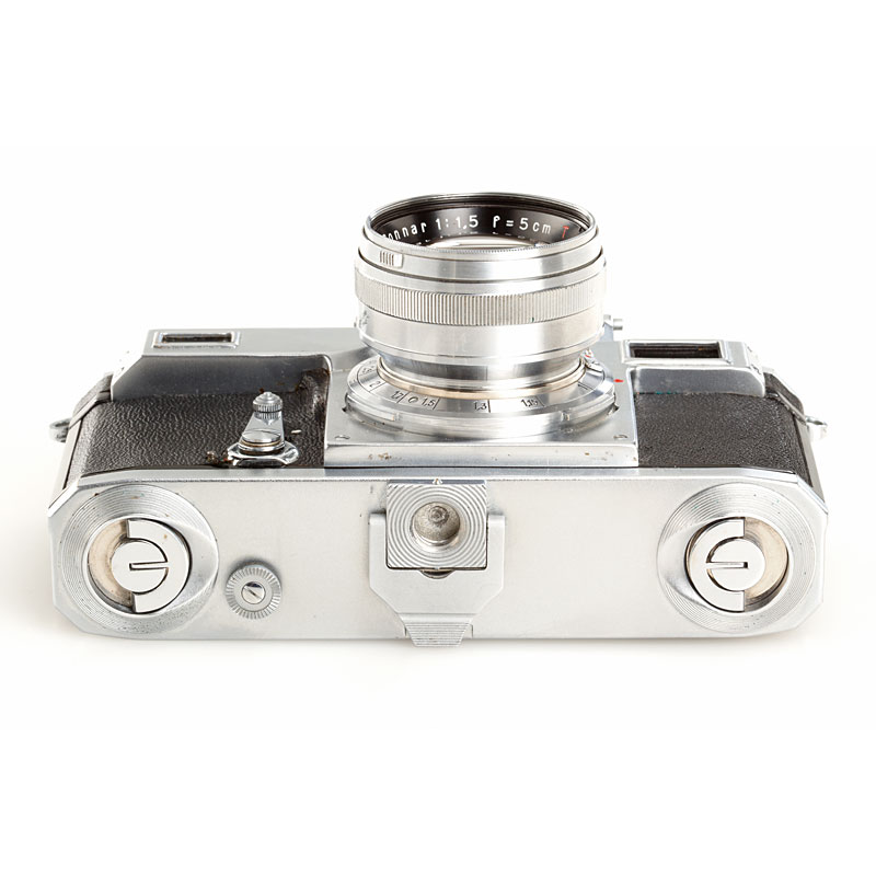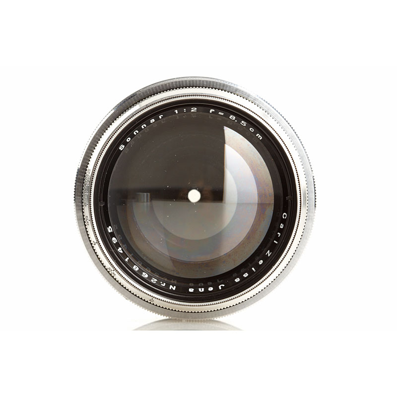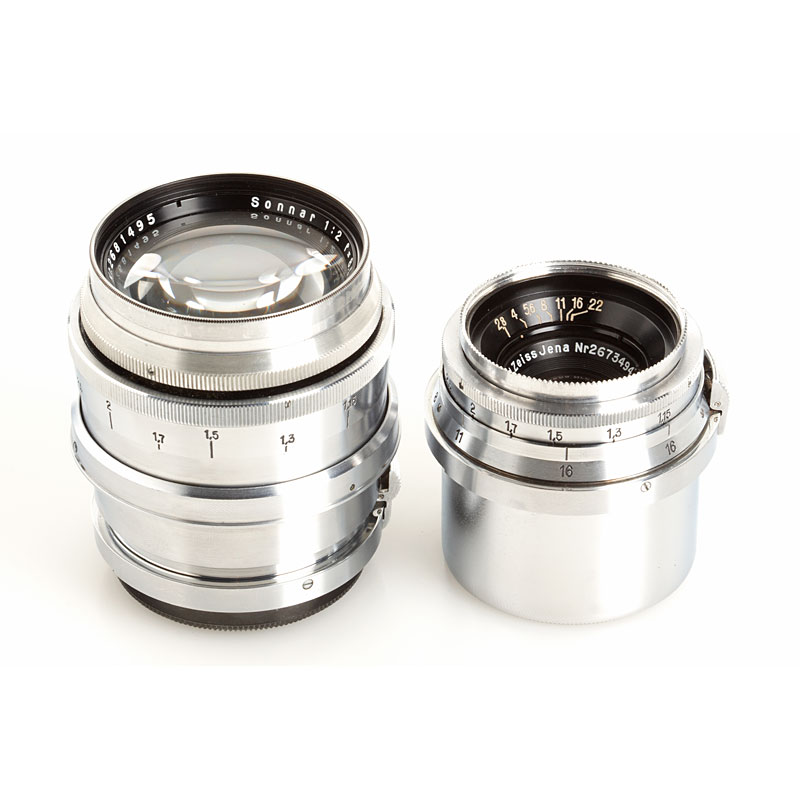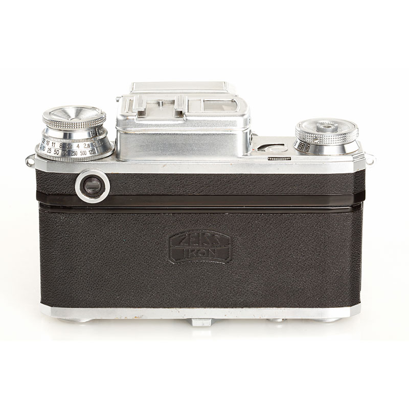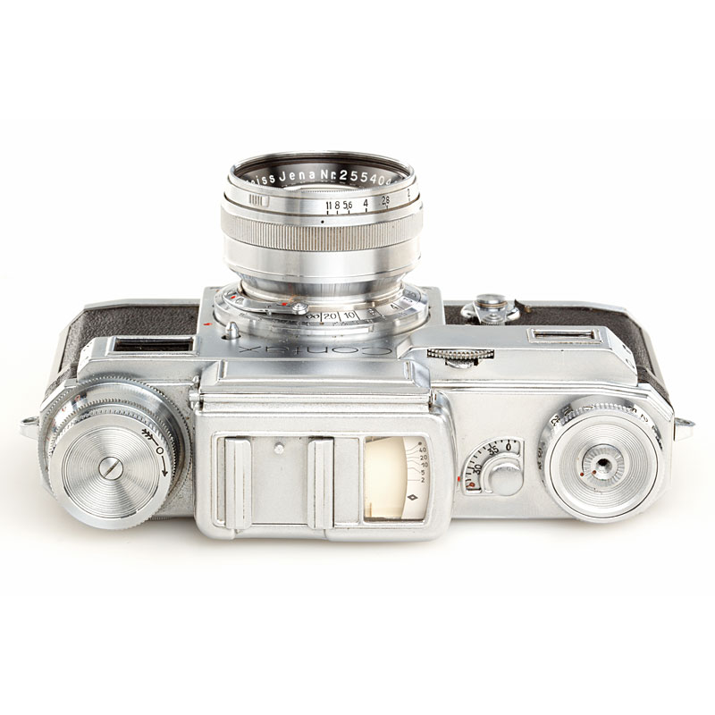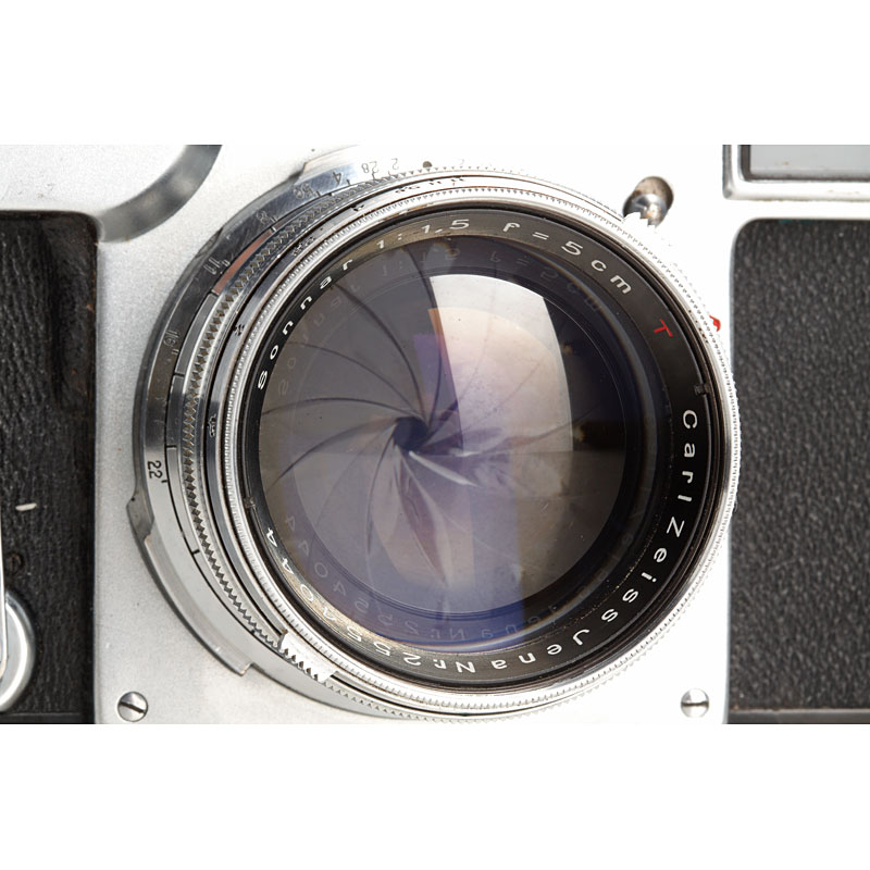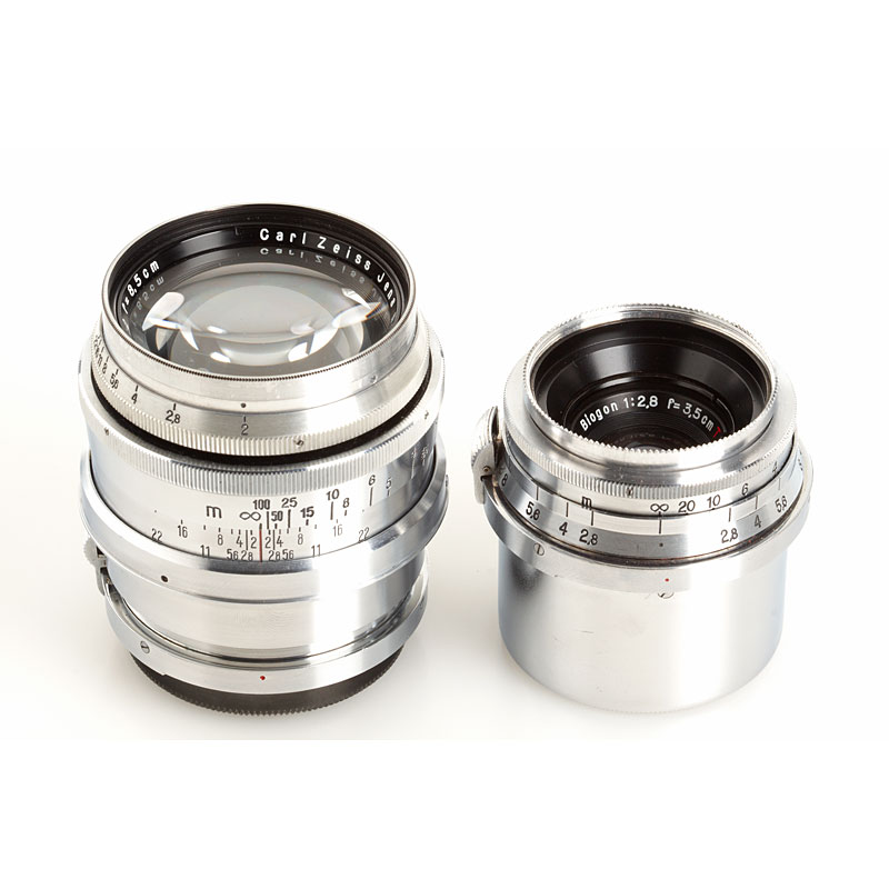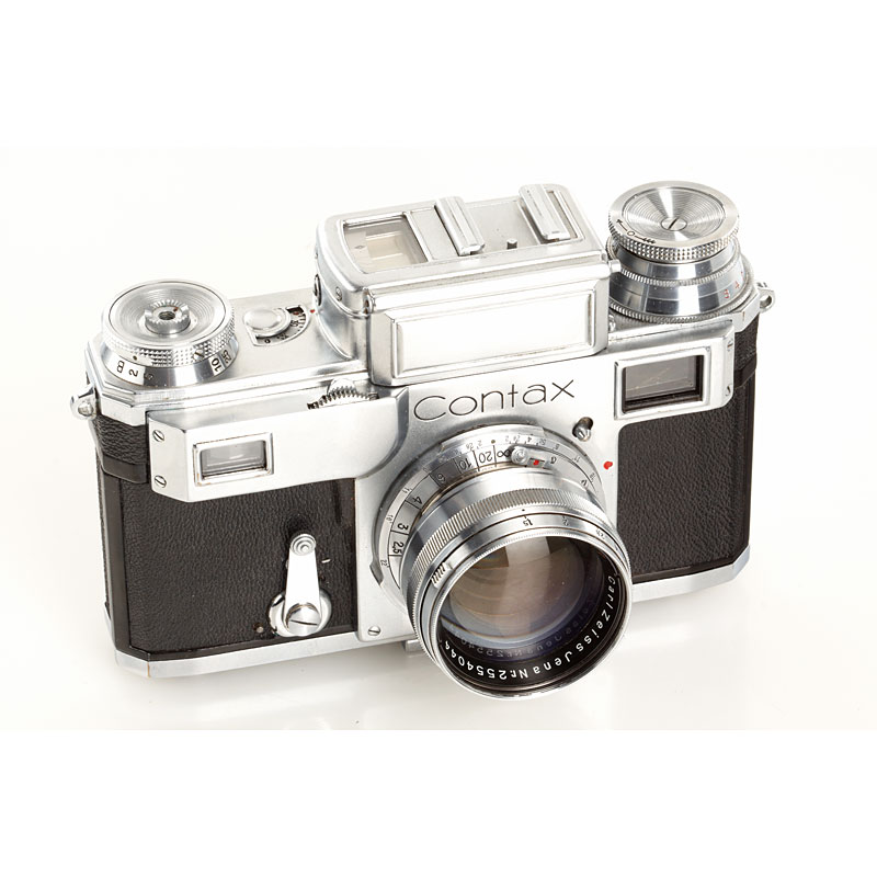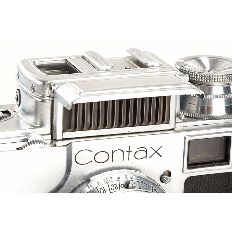 a very fine wartime outfit in good working order with Contax III, Sonnar 1.5/5cm T no.2554044 (cap), Biogon 2.8/3.5cm T no.2673494 (caps), Sonnar 2/8.5cm no.2681495 (caps), universal finder 436/70 no.12568, chrome 5 + 8.5cm Albada finder 433/25, rare black 5cm finder 433/34, 8.5 + 13.5cm finder 544/7, 2 hoods, 3 filters, 2 spools, all in original Zeiss Ikon outfit case 1787/3, also included the everready case, plate back 543/13 with 5 plates, instructions and screen with maker's box, Contameter 1343 complete in case