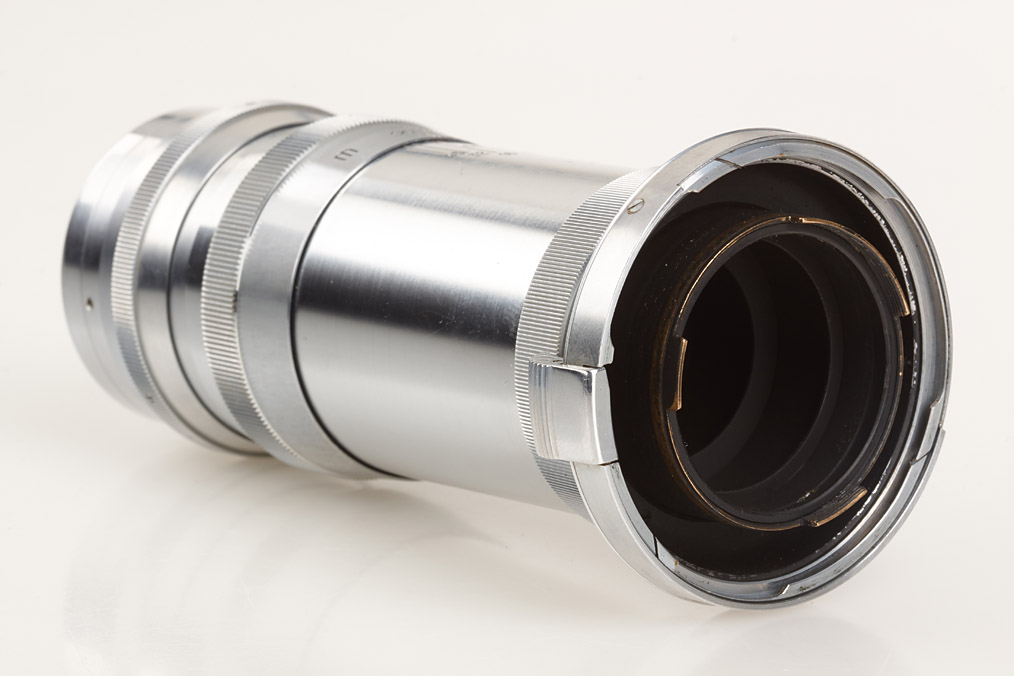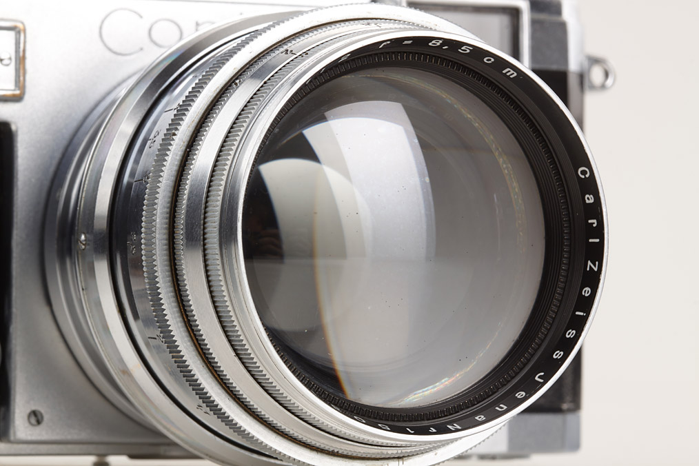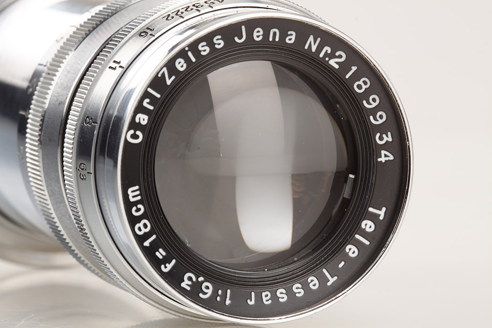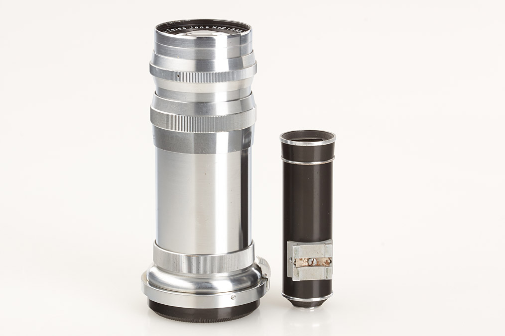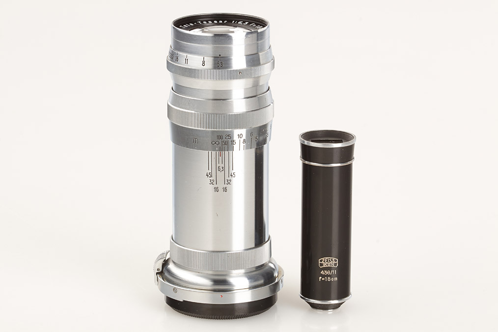 first type post-war Contax IIa in good working order with pre-war Sonnar 2/8.5cm no.1503180 (cap), folding Albada finder 433/26 (5 u.13.5) and pre-war Tele-Tessar 6.3/18cm no.2189934 (small cleaning marks, both caps) with matching 18cm tube finder 436/11 in keeper