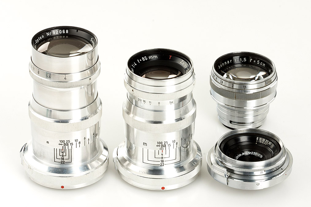 first type IIa in perfect working condition, Tessar 8/2.8cm no.2391678 (cap, chrome 2.8cm finder 432/8), Planar 3.5/35mm no.1589975, Sonnar 1.5/5cm no.2269391 (cap), Opton Triotar 4/85mm T no.854533 (caps), Opton Sonnar 4/135mm T no.92068 (caps), universal finder 440 (21-135mm), 1118 hood, 1119 hood, 2 film spools in green metal cases, 4 filters (3 with maker's boxes), instruction book, Contameter 439 complete in case - the whole outfit in near mint condition, all in fitted Omnica outfit case, stamped: Dr.med. Hans Schmidtmann prakt. Arzt Nürnberg, Hohenlohestrasse 11